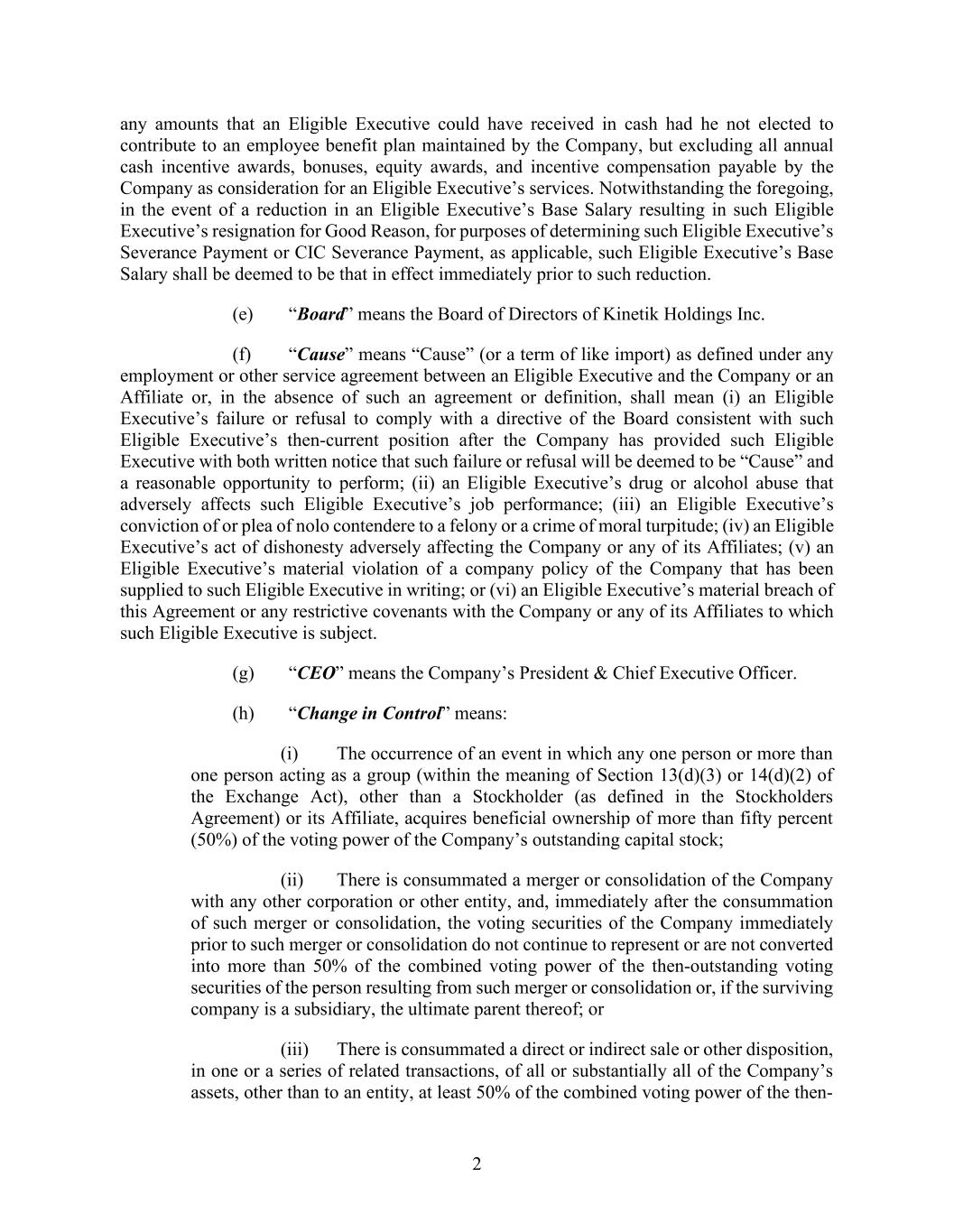 2 any amounts that an Eligible Executive could have received in cash had he not elected to contribute to an employee benefit plan maintained by the Company, but excluding all annual cash incentive awards, bonuses, equity awards, and incentive compensation payable by the Company as consideration for an Eligible Executive’s services. Notwithstanding the foregoing, in the event of a reduction in an Eligible Executive’s Base Salary resulting in such Eligible Executive’s resignation for Good Reason, for purposes of determining such Eligible Executive’s Severance Payment or CIC Severance Payment, as applicable, such Eligible Executive’s Base Salary shall be deemed to be that in effect immediately prior to such reduction. (e) “Board” means the Board of Directors of Kinetik Holdings Inc. (f) “Cause” means “Cause” (or a term of like import) as defined under any employment or other service agreement between an Eligible Executive and the Company or an Affiliate or, in the absence of such an agreement or definition, shall mean (i) an Eligible Executive’s failure or refusal to comply with a directive of the Board consistent with such Eligible Executive’s then-current position after the Company has provided such Eligible Executive with both written notice that such failure or refusal will be deemed to be “Cause” and a reasonable opportunity to perform; (ii) an Eligible Executive’s drug or alcohol abuse that adversely affects such Eligible Executive’s job performance; (iii) an Eligible Executive’s conviction of or plea of nolo contendere to a felony or a crime of moral turpitude; (iv) an Eligible Executive’s act of dishonesty adversely affecting the Company or any of its Affiliates; (v) an Eligible Executive’s material violation of a company policy of the Company that has been supplied to such Eligible Executive in writing; or (vi) an Eligible Executive’s material breach of this Agreement or any restrictive covenants with the Company or any of its Affiliates to which such Eligible Executive is subject. (g) “CEO” means the Company’s President & Chief Executive Officer. (h) “Change in Control” means: (i) The occurrence of an event in which any one person or more than one person acting as a group (within the meaning of Section 13(d)(3) or 14(d)(2) of the Exchange Act), other than a Stockholder (as defined in the Stockholders Agreement) or its Affiliate, acquires beneficial ownership of more than fifty percent (50%) of the voting power of the Company’s outstanding capital stock; (ii) There is consummated a merger or consolidation of the Company with any other corporation or other entity, and, immediately after the consummation of such merger or consolidation, the voting securities of the Company immediately prior to such merger or consolidation do not continue to represent or are not converted into more than 50% of the combined voting power of the then-outstanding voting securities of the person resulting from such merger or consolidation or, if the surviving company is a subsidiary, the ultimate parent thereof; or (iii) There is consummated a direct or indirect sale or other disposition, in one or a series of related transactions, of all or substantially all of the Company’s assets, other than to an entity, at least 50% of the combined voting power of the then-