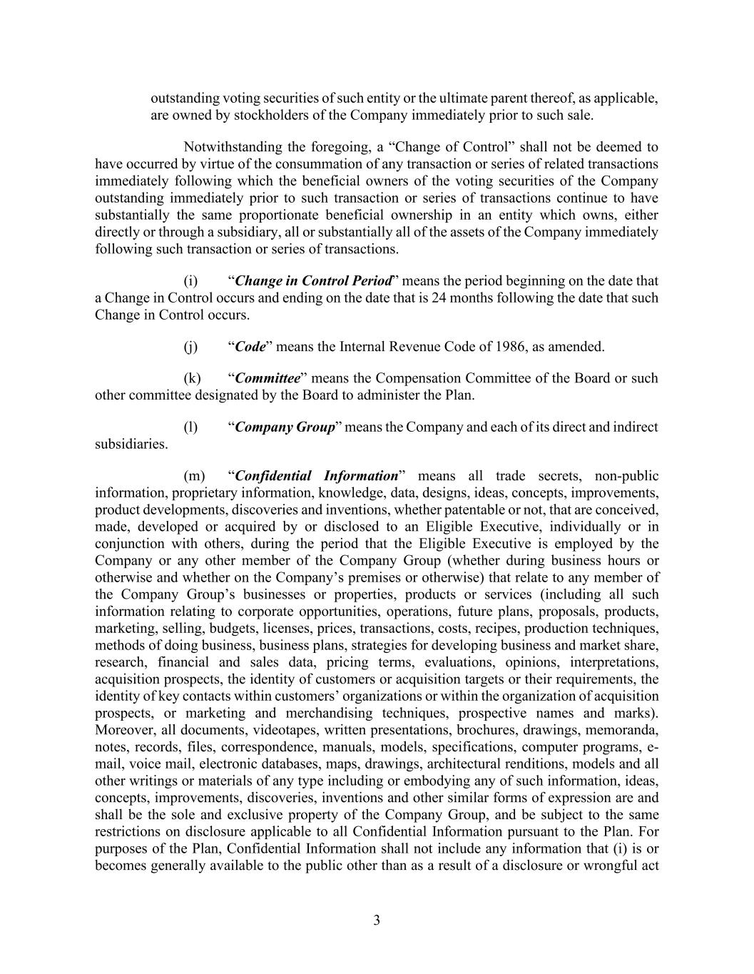 3 outstanding voting securities of such entity or the ultimate parent thereof, as applicable, are owned by stockholders of the Company immediately prior to such sale. Notwithstanding the foregoing, a “Change of Control” shall not be deemed to have occurred by virtue of the consummation of any transaction or series of related transactions immediately following which the beneficial owners of the voting securities of the Company outstanding immediately prior to such transaction or series of transactions continue to have substantially the same proportionate beneficial ownership in an entity which owns, either directly or through a subsidiary, all or substantially all of the assets of the Company immediately following such transaction or series of transactions. (i) “Change in Control Period” means the period beginning on the date that a Change in Control occurs and ending on the date that is 24 months following the date that such Change in Control occurs. (j) “Code” means the Internal Revenue Code of 1986, as amended. (k) “Committee” means the Compensation Committee of the Board or such other committee designated by the Board to administer the Plan. (l) “Company Group” means the Company and each of its direct and indirect subsidiaries. (m) “Confidential Information” means all trade secrets, non-public information, proprietary information, knowledge, data, designs, ideas, concepts, improvements, product developments, discoveries and inventions, whether patentable or not, that are conceived, made, developed or acquired by or disclosed to an Eligible Executive, individually or in conjunction with others, during the period that the Eligible Executive is employed by the Company or any other member of the Company Group (whether during business hours or otherwise and whether on the Company’s premises or otherwise) that relate to any member of the Company Group’s businesses or properties, products or services (including all such information relating to corporate opportunities, operations, future plans, proposals, products, marketing, selling, budgets, licenses, prices, transactions, costs, recipes, production techniques, methods of doing business, business plans, strategies for developing business and market share, research, financial and sales data, pricing terms, evaluations, opinions, interpretations, acquisition prospects, the identity of customers or acquisition targets or their requirements, the identity of key contacts within customers’ organizations or within the organization of acquisition prospects, or marketing and merchandising techniques, prospective names and marks). Moreover, all documents, videotapes, written presentations, brochures, drawings, memoranda, notes, records, files, correspondence, manuals, models, specifications, computer programs, e- mail, voice mail, electronic databases, maps, drawings, architectural renditions, models and all other writings or materials of any type including or embodying any of such information, ideas, concepts, improvements, discoveries, inventions and other similar forms of expression are and shall be the sole and exclusive property of the Company Group, and be subject to the same restrictions on disclosure applicable to all Confidential Information pursuant to the Plan. For purposes of the Plan, Confidential Information shall not include any information that (i) is or becomes generally available to the public other than as a result of a disclosure or wrongful act