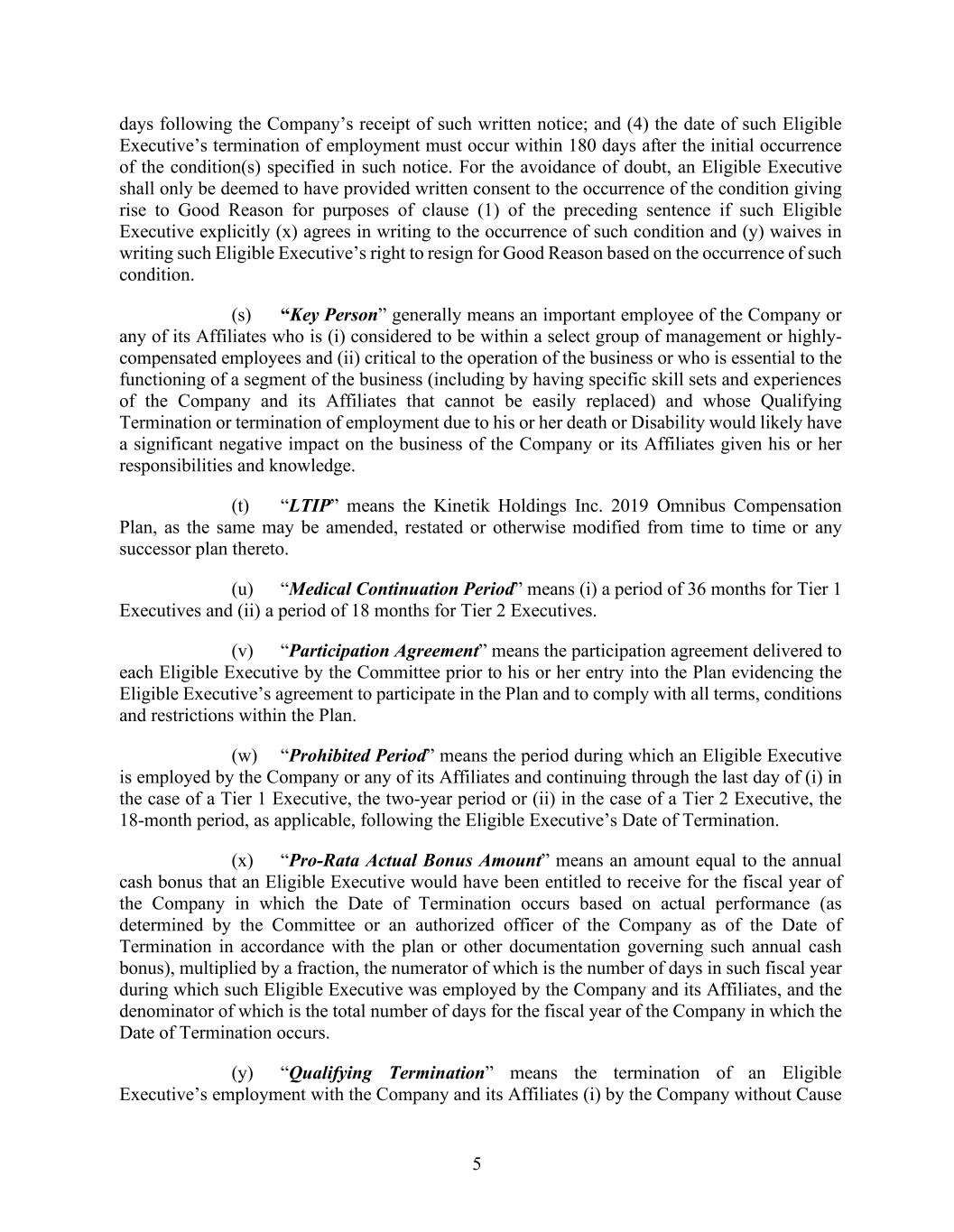 5 days following the Company’s receipt of such written notice; and (4) the date of such Eligible Executive’s termination of employment must occur within 180 days after the initial occurrence of the condition(s) specified in such notice. For the avoidance of doubt, an Eligible Executive shall only be deemed to have provided written consent to the occurrence of the condition giving rise to Good Reason for purposes of clause (1) of the preceding sentence if such Eligible Executive explicitly (x) agrees in writing to the occurrence of such condition and (y) waives in writing such Eligible Executive’s right to resign for Good Reason based on the occurrence of such condition. (s) “Key Person” generally means an important employee of the Company or any of its Affiliates who is (i) considered to be within a select group of management or highly- compensated employees and (ii) critical to the operation of the business or who is essential to the functioning of a segment of the business (including by having specific skill sets and experiences of the Company and its Affiliates that cannot be easily replaced) and whose Qualifying Termination or termination of employment due to his or her death or Disability would likely have a significant negative impact on the business of the Company or its Affiliates given his or her responsibilities and knowledge. (t) “LTIP” means the Kinetik Holdings Inc. 2019 Omnibus Compensation Plan, as the same may be amended, restated or otherwise modified from time to time or any successor plan thereto. (u) “Medical Continuation Period” means (i) a period of 36 months for Tier 1 Executives and (ii) a period of 18 months for Tier 2 Executives. (v) “Participation Agreement” means the participation agreement delivered to each Eligible Executive by the Committee prior to his or her entry into the Plan evidencing the Eligible Executive’s agreement to participate in the Plan and to comply with all terms, conditions and restrictions within the Plan. (w) “Prohibited Period” means the period during which an Eligible Executive is employed by the Company or any of its Affiliates and continuing through the last day of (i) in the case of a Tier 1 Executive, the two-year period or (ii) in the case of a Tier 2 Executive, the 18-month period, as applicable, following the Eligible Executive’s Date of Termination. (x) “Pro-Rata Actual Bonus Amount” means an amount equal to the annual cash bonus that an Eligible Executive would have been entitled to receive for the fiscal year of the Company in which the Date of Termination occurs based on actual performance (as determined by the Committee or an authorized officer of the Company as of the Date of Termination in accordance with the plan or other documentation governing such annual cash bonus), multiplied by a fraction, the numerator of which is the number of days in such fiscal year during which such Eligible Executive was employed by the Company and its Affiliates, and the denominator of which is the total number of days for the fiscal year of the Company in which the Date of Termination occurs. (y) “Qualifying Termination” means the termination of an Eligible Executive’s employment with the Company and its Affiliates (i) by the Company without Cause