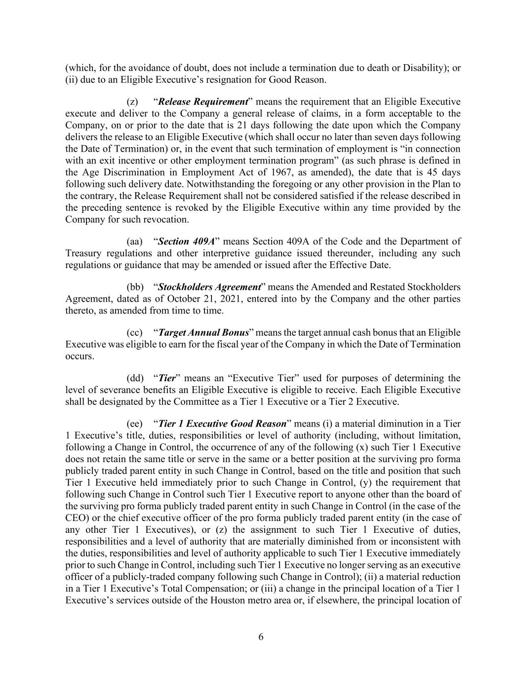 6 (which, for the avoidance of doubt, does not include a termination due to death or Disability); or (ii) due to an Eligible Executive’s resignation for Good Reason. (z) “Release Requirement” means the requirement that an Eligible Executive execute and deliver to the Company a general release of claims, in a form acceptable to the Company, on or prior to the date that is 21 days following the date upon which the Company delivers the release to an Eligible Executive (which shall occur no later than seven days following the Date of Termination) or, in the event that such termination of employment is “in connection with an exit incentive or other employment termination program” (as such phrase is defined in the Age Discrimination in Employment Act of 1967, as amended), the date that is 45 days following such delivery date. Notwithstanding the foregoing or any other provision in the Plan to the contrary, the Release Requirement shall not be considered satisfied if the release described in the preceding sentence is revoked by the Eligible Executive within any time provided by the Company for such revocation. (aa) “Section 409A” means Section 409A of the Code and the Department of Treasury regulations and other interpretive guidance issued thereunder, including any such regulations or guidance that may be amended or issued after the Effective Date. (bb) “Stockholders Agreement” means the Amended and Restated Stockholders Agreement, dated as of October 21, 2021, entered into by the Company and the other parties thereto, as amended from time to time. (cc) “Target Annual Bonus” means the target annual cash bonus that an Eligible Executive was eligible to earn for the fiscal year of the Company in which the Date of Termination occurs. (dd) “Tier” means an “Executive Tier” used for purposes of determining the level of severance benefits an Eligible Executive is eligible to receive. Each Eligible Executive shall be designated by the Committee as a Tier 1 Executive or a Tier 2 Executive. (ee) “Tier 1 Executive Good Reason” means (i) a material diminution in a Tier 1 Executive’s title, duties, responsibilities or level of authority (including, without limitation, following a Change in Control, the occurrence of any of the following (x) such Tier 1 Executive does not retain the same title or serve in the same or a better position at the surviving pro forma publicly traded parent entity in such Change in Control, based on the title and position that such Tier 1 Executive held immediately prior to such Change in Control, (y) the requirement that following such Change in Control such Tier 1 Executive report to anyone other than the board of the surviving pro forma publicly traded parent entity in such Change in Control (in the case of the CEO) or the chief executive officer of the pro forma publicly traded parent entity (in the case of any other Tier 1 Executives), or (z) the assignment to such Tier 1 Executive of duties, responsibilities and a level of authority that are materially diminished from or inconsistent with the duties, responsibilities and level of authority applicable to such Tier 1 Executive immediately prior to such Change in Control, including such Tier 1 Executive no longer serving as an executive officer of a publicly-traded company following such Change in Control); (ii) a material reduction in a Tier 1 Executive’s Total Compensation; or (iii) a change in the principal location of a Tier 1 Executive’s services outside of the Houston metro area or, if elsewhere, the principal location of