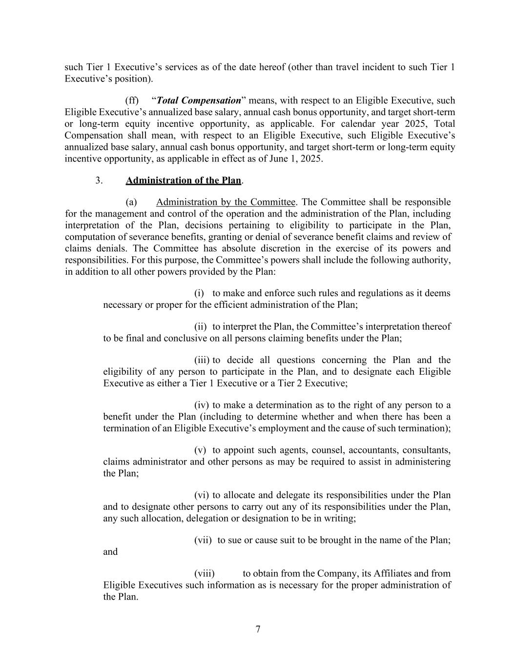 7 such Tier 1 Executive’s services as of the date hereof (other than travel incident to such Tier 1 Executive’s position). (ff) “Total Compensation” means, with respect to an Eligible Executive, such Eligible Executive’s annualized base salary, annual cash bonus opportunity, and target short-term or long-term equity incentive opportunity, as applicable. For calendar year 2025, Total Compensation shall mean, with respect to an Eligible Executive, such Eligible Executive’s annualized base salary, annual cash bonus opportunity, and target short-term or long-term equity incentive opportunity, as applicable in effect as of June 1, 2025. 3. Administration of the Plan. (a) Administration by the Committee. The Committee shall be responsible for the management and control of the operation and the administration of the Plan, including interpretation of the Plan, decisions pertaining to eligibility to participate in the Plan, computation of severance benefits, granting or denial of severance benefit claims and review of claims denials. The Committee has absolute discretion in the exercise of its powers and responsibilities. For this purpose, the Committee’s powers shall include the following authority, in addition to all other powers provided by the Plan: (i) to make and enforce such rules and regulations as it deems necessary or proper for the efficient administration of the Plan; (ii) to interpret the Plan, the Committee’s interpretation thereof to be final and conclusive on all persons claiming benefits under the Plan; (iii) to decide all questions concerning the Plan and the eligibility of any person to participate in the Plan, and to designate each Eligible Executive as either a Tier 1 Executive or a Tier 2 Executive; (iv) to make a determination as to the right of any person to a benefit under the Plan (including to determine whether and when there has been a termination of an Eligible Executive’s employment and the cause of such termination); (v) to appoint such agents, counsel, accountants, consultants, claims administrator and other persons as may be required to assist in administering the Plan; (vi) to allocate and delegate its responsibilities under the Plan and to designate other persons to carry out any of its responsibilities under the Plan, any such allocation, delegation or designation to be in writing; (vii) to sue or cause suit to be brought in the name of the Plan; and (viii) to obtain from the Company, its Affiliates and from Eligible Executives such information as is necessary for the proper administration of the Plan.