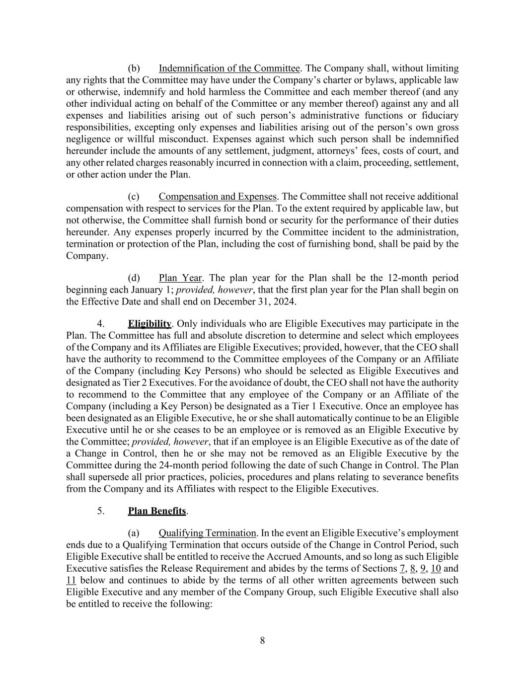 8 (b) Indemnification of the Committee. The Company shall, without limiting any rights that the Committee may have under the Company’s charter or bylaws, applicable law or otherwise, indemnify and hold harmless the Committee and each member thereof (and any other individual acting on behalf of the Committee or any member thereof) against any and all expenses and liabilities arising out of such person’s administrative functions or fiduciary responsibilities, excepting only expenses and liabilities arising out of the person’s own gross negligence or willful misconduct. Expenses against which such person shall be indemnified hereunder include the amounts of any settlement, judgment, attorneys’ fees, costs of court, and any other related charges reasonably incurred in connection with a claim, proceeding, settlement, or other action under the Plan. (c) Compensation and Expenses. The Committee shall not receive additional compensation with respect to services for the Plan. To the extent required by applicable law, but not otherwise, the Committee shall furnish bond or security for the performance of their duties hereunder. Any expenses properly incurred by the Committee incident to the administration, termination or protection of the Plan, including the cost of furnishing bond, shall be paid by the Company. (d) Plan Year. The plan year for the Plan shall be the 12-month period beginning each January 1; provided, however, that the first plan year for the Plan shall begin on the Effective Date and shall end on December 31, 2024. 4. Eligibility. Only individuals who are Eligible Executives may participate in the Plan. The Committee has full and absolute discretion to determine and select which employees of the Company and its Affiliates are Eligible Executives; provided, however, that the CEO shall have the authority to recommend to the Committee employees of the Company or an Affiliate of the Company (including Key Persons) who should be selected as Eligible Executives and designated as Tier 2 Executives. For the avoidance of doubt, the CEO shall not have the authority to recommend to the Committee that any employee of the Company or an Affiliate of the Company (including a Key Person) be designated as a Tier 1 Executive. Once an employee has been designated as an Eligible Executive, he or she shall automatically continue to be an Eligible Executive until he or she ceases to be an employee or is removed as an Eligible Executive by the Committee; provided, however, that if an employee is an Eligible Executive as of the date of a Change in Control, then he or she may not be removed as an Eligible Executive by the Committee during the 24-month period following the date of such Change in Control. The Plan shall supersede all prior practices, policies, procedures and plans relating to severance benefits from the Company and its Affiliates with respect to the Eligible Executives. 5. Plan Benefits. (a) Qualifying Termination. In the event an Eligible Executive’s employment ends due to a Qualifying Termination that occurs outside of the Change in Control Period, such Eligible Executive shall be entitled to receive the Accrued Amounts, and so long as such Eligible Executive satisfies the Release Requirement and abides by the terms of Sections 7, 8, 9, 10 and 11 below and continues to abide by the terms of all other written agreements between such Eligible Executive and any member of the Company Group, such Eligible Executive shall also be entitled to receive the following: