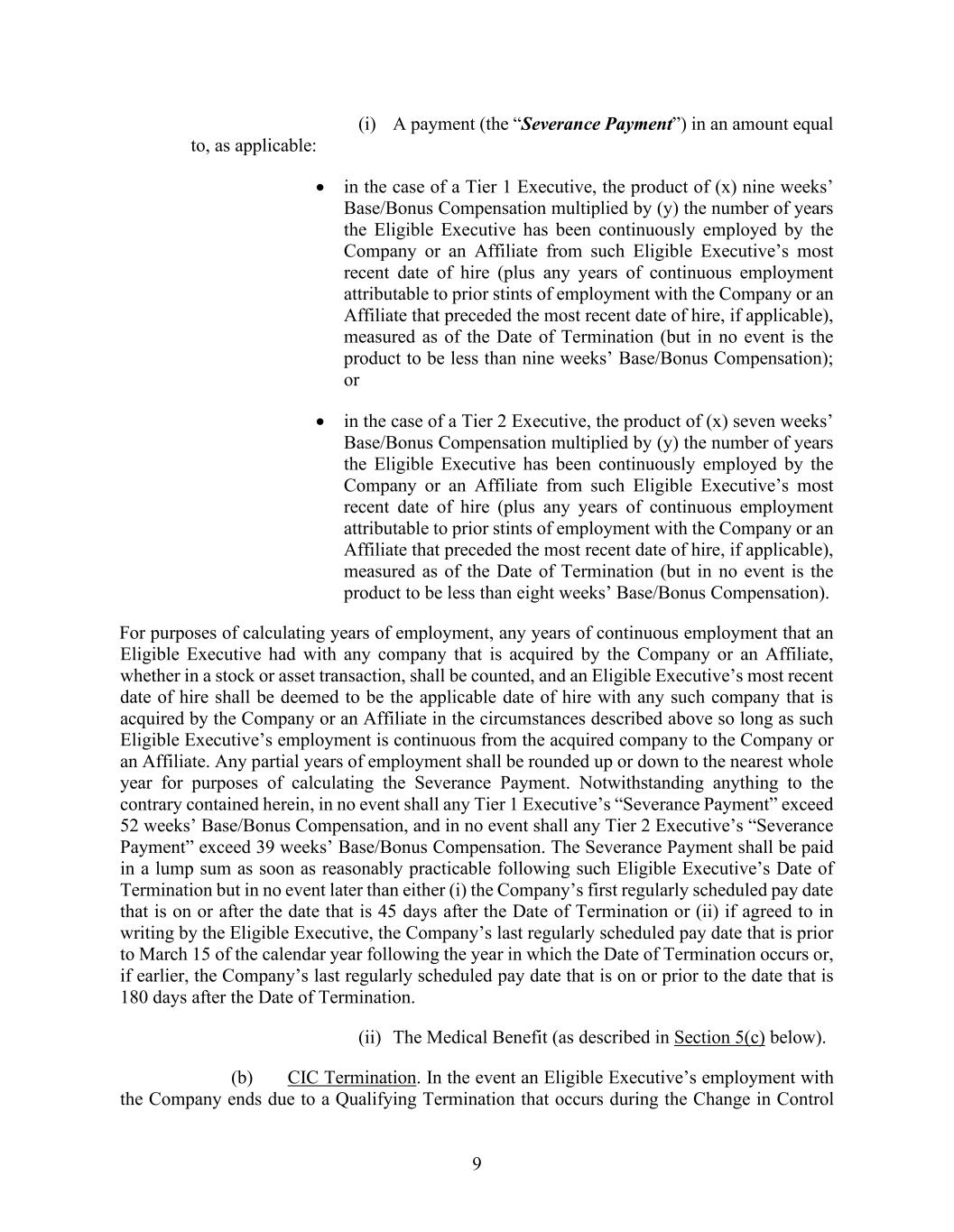 9 (i) A payment (the “Severance Payment”) in an amount equal to, as applicable: • in the case of a Tier 1 Executive, the product of (x) nine weeks’ Base/Bonus Compensation multiplied by (y) the number of years the Eligible Executive has been continuously employed by the Company or an Affiliate from such Eligible Executive’s most recent date of hire (plus any years of continuous employment attributable to prior stints of employment with the Company or an Affiliate that preceded the most recent date of hire, if applicable), measured as of the Date of Termination (but in no event is the product to be less than nine weeks’ Base/Bonus Compensation); or • in the case of a Tier 2 Executive, the product of (x) seven weeks’ Base/Bonus Compensation multiplied by (y) the number of years the Eligible Executive has been continuously employed by the Company or an Affiliate from such Eligible Executive’s most recent date of hire (plus any years of continuous employment attributable to prior stints of employment with the Company or an Affiliate that preceded the most recent date of hire, if applicable), measured as of the Date of Termination (but in no event is the product to be less than eight weeks’ Base/Bonus Compensation). For purposes of calculating years of employment, any years of continuous employment that an Eligible Executive had with any company that is acquired by the Company or an Affiliate, whether in a stock or asset transaction, shall be counted, and an Eligible Executive’s most recent date of hire shall be deemed to be the applicable date of hire with any such company that is acquired by the Company or an Affiliate in the circumstances described above so long as such Eligible Executive’s employment is continuous from the acquired company to the Company or an Affiliate. Any partial years of employment shall be rounded up or down to the nearest whole year for purposes of calculating the Severance Payment. Notwithstanding anything to the contrary contained herein, in no event shall any Tier 1 Executive’s “Severance Payment” exceed 52 weeks’ Base/Bonus Compensation, and in no event shall any Tier 2 Executive’s “Severance Payment” exceed 39 weeks’ Base/Bonus Compensation. The Severance Payment shall be paid in a lump sum as soon as reasonably practicable following such Eligible Executive’s Date of Termination but in no event later than either (i) the Company’s first regularly scheduled pay date that is on or after the date that is 45 days after the Date of Termination or (ii) if agreed to in writing by the Eligible Executive, the Company’s last regularly scheduled pay date that is prior to March 15 of the calendar year following the year in which the Date of Termination occurs or, if earlier, the Company’s last regularly scheduled pay date that is on or prior to the date that is 180 days after the Date of Termination. (ii) The Medical Benefit (as described in Section 5(c) below). (b) CIC Termination. In the event an Eligible Executive’s employment with the Company ends due to a Qualifying Termination that occurs during the Change in Control