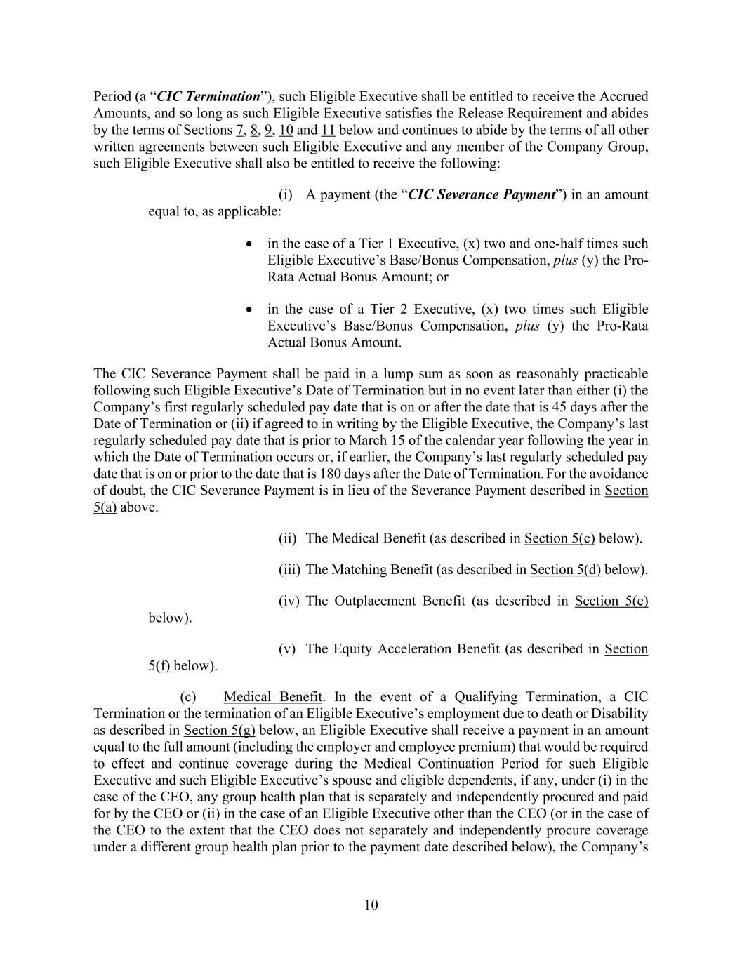 10 Period (a “CIC Termination”), such Eligible Executive shall be entitled to receive the Accrued Amounts, and so long as such Eligible Executive satisfies the Release Requirement and abides by the terms of Sections 7, 8, 9, 10 and 11 below and continues to abide by the terms of all other written agreements between such Eligible Executive and any member of the Company Group, such Eligible Executive shall also be entitled to receive the following: (i) A payment (the “CIC Severance Payment”) in an amount equal to, as applicable: • in the case of a Tier 1 Executive, (x) two and one-half times such Eligible Executive’s Base/Bonus Compensation, plus (y) the Pro- Rata Actual Bonus Amount; or • in the case of a Tier 2 Executive, (x) two times such Eligible Executive’s Base/Bonus Compensation, plus (y) the Pro-Rata Actual Bonus Amount. The CIC Severance Payment shall be paid in a lump sum as soon as reasonably practicable following such Eligible Executive’s Date of Termination but in no event later than either (i) the Company’s first regularly scheduled pay date that is on or after the date that is 45 days after the Date of Termination or (ii) if agreed to in writing by the Eligible Executive, the Company’s last regularly scheduled pay date that is prior to March 15 of the calendar year following the year in which the Date of Termination occurs or, if earlier, the Company’s last regularly scheduled pay date that is on or prior to the date that is 180 days after the Date of Termination. For the avoidance of doubt, the CIC Severance Payment is in lieu of the Severance Payment described in Section 5(a) above. (ii) The Medical Benefit (as described in Section 5(c) below). (iii) The Matching Benefit (as described in Section 5(d) below). (iv) The Outplacement Benefit (as described in Section 5(e) below). (v) The Equity Acceleration Benefit (as described in Section 5(f) below). (c) Medical Benefit. In the event of a Qualifying Termination, a CIC Termination or the termination of an Eligible Executive’s employment due to death or Disability as described in Section 5(g) below, an Eligible Executive shall receive a payment in an amount equal to the full amount (including the employer and employee premium) that would be required to effect and continue coverage during the Medical Continuation Period for such Eligible Executive and such Eligible Executive’s spouse and eligible dependents, if any, under (i) in the case of the CEO, any group health plan that is separately and independently procured and paid for by the CEO or (ii) in the case of an Eligible Executive other than the CEO (or in the case of the CEO to the extent that the CEO does not separately and independently procure coverage under a different group health plan prior to the payment date described below), the Company’s
