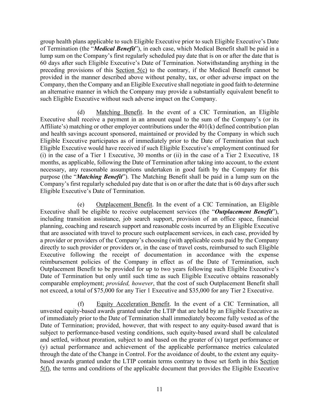 11 group health plans applicable to such Eligible Executive prior to such Eligible Executive’s Date of Termination (the “Medical Benefit”), in each case, which Medical Benefit shall be paid in a lump sum on the Company’s first regularly scheduled pay date that is on or after the date that is 60 days after such Eligible Executive’s Date of Termination. Notwithstanding anything in the preceding provisions of this Section 5(c) to the contrary, if the Medical Benefit cannot be provided in the manner described above without penalty, tax, or other adverse impact on the Company, then the Company and an Eligible Executive shall negotiate in good faith to determine an alternative manner in which the Company may provide a substantially equivalent benefit to such Eligible Executive without such adverse impact on the Company. (d) Matching Benefit. In the event of a CIC Termination, an Eligible Executive shall receive a payment in an amount equal to the sum of the Company’s (or its Affiliate’s) matching or other employer contributions under the 401(k) defined contribution plan and health savings account sponsored, maintained or provided by the Company in which such Eligible Executive participates as of immediately prior to the Date of Termination that such Eligible Executive would have received if such Eligible Executive’s employment continued for (i) in the case of a Tier 1 Executive, 30 months or (ii) in the case of a Tier 2 Executive, 18 months, as applicable, following the Date of Termination after taking into account, to the extent necessary, any reasonable assumptions undertaken in good faith by the Company for this purpose (the “Matching Benefit”). The Matching Benefit shall be paid in a lump sum on the Company’s first regularly scheduled pay date that is on or after the date that is 60 days after such Eligible Executive’s Date of Termination. (e) Outplacement Benefit. In the event of a CIC Termination, an Eligible Executive shall be eligible to receive outplacement services (the “Outplacement Benefit”), including transition assistance, job search support, provision of an office space, financial planning, coaching and research support and reasonable costs incurred by an Eligible Executive that are associated with travel to procure such outplacement services, in each case, provided by a provider or providers of the Company’s choosing (with applicable costs paid by the Company directly to such provider or providers or, in the case of travel costs, reimbursed to such Eligible Executive following the receipt of documentation in accordance with the expense reimbursement policies of the Company in effect as of the Date of Termination, such Outplacement Benefit to be provided for up to two years following such Eligible Executive’s Date of Termination but only until such time as such Eligible Executive obtains reasonably comparable employment; provided, however, that the cost of such Outplacement Benefit shall not exceed, a total of $75,000 for any Tier 1 Executive and $35,000 for any Tier 2 Executive. (f) Equity Acceleration Benefit. In the event of a CIC Termination, all unvested equity-based awards granted under the LTIP that are held by an Eligible Executive as of immediately prior to the Date of Termination shall immediately become fully vested as of the Date of Termination; provided, however, that with respect to any equity-based award that is subject to performance-based vesting conditions, such equity-based award shall be calculated and settled, without proration, subject to and based on the greater of (x) target performance or (y) actual performance and achievement of the applicable performance metrics calculated through the date of the Change in Control. For the avoidance of doubt, to the extent any equity- based awards granted under the LTIP contain terms contrary to those set forth in this Section 5(f), the terms and conditions of the applicable document that provides the Eligible Executive
