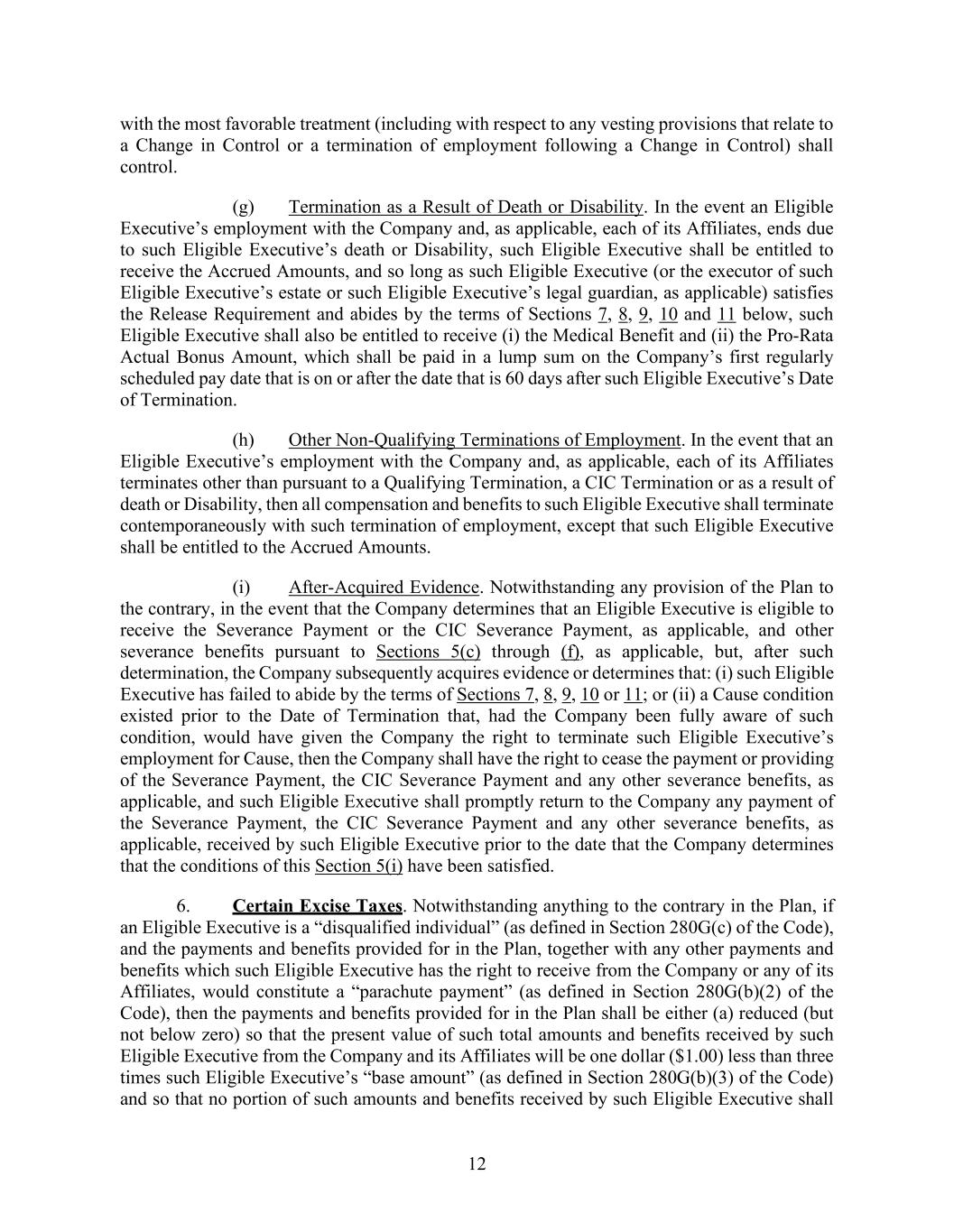 12 with the most favorable treatment (including with respect to any vesting provisions that relate to a Change in Control or a termination of employment following a Change in Control) shall control. (g) Termination as a Result of Death or Disability. In the event an Eligible Executive’s employment with the Company and, as applicable, each of its Affiliates, ends due to such Eligible Executive’s death or Disability, such Eligible Executive shall be entitled to receive the Accrued Amounts, and so long as such Eligible Executive (or the executor of such Eligible Executive’s estate or such Eligible Executive’s legal guardian, as applicable) satisfies the Release Requirement and abides by the terms of Sections 7, 8, 9, 10 and 11 below, such Eligible Executive shall also be entitled to receive (i) the Medical Benefit and (ii) the Pro-Rata Actual Bonus Amount, which shall be paid in a lump sum on the Company’s first regularly scheduled pay date that is on or after the date that is 60 days after such Eligible Executive’s Date of Termination. (h) Other Non-Qualifying Terminations of Employment. In the event that an Eligible Executive’s employment with the Company and, as applicable, each of its Affiliates terminates other than pursuant to a Qualifying Termination, a CIC Termination or as a result of death or Disability, then all compensation and benefits to such Eligible Executive shall terminate contemporaneously with such termination of employment, except that such Eligible Executive shall be entitled to the Accrued Amounts. (i) After-Acquired Evidence. Notwithstanding any provision of the Plan to the contrary, in the event that the Company determines that an Eligible Executive is eligible to receive the Severance Payment or the CIC Severance Payment, as applicable, and other severance benefits pursuant to Sections 5(c) through (f), as applicable, but, after such determination, the Company subsequently acquires evidence or determines that: (i) such Eligible Executive has failed to abide by the terms of Sections 7, 8, 9, 10 or 11; or (ii) a Cause condition existed prior to the Date of Termination that, had the Company been fully aware of such condition, would have given the Company the right to terminate such Eligible Executive’s employment for Cause, then the Company shall have the right to cease the payment or providing of the Severance Payment, the CIC Severance Payment and any other severance benefits, as applicable, and such Eligible Executive shall promptly return to the Company any payment of the Severance Payment, the CIC Severance Payment and any other severance benefits, as applicable, received by such Eligible Executive prior to the date that the Company determines that the conditions of this Section 5(i) have been satisfied. 6. Certain Excise Taxes. Notwithstanding anything to the contrary in the Plan, if an Eligible Executive is a “disqualified individual” (as defined in Section 280G(c) of the Code), and the payments and benefits provided for in the Plan, together with any other payments and benefits which such Eligible Executive has the right to receive from the Company or any of its Affiliates, would constitute a “parachute payment” (as defined in Section 280G(b)(2) of the Code), then the payments and benefits provided for in the Plan shall be either (a) reduced (but not below zero) so that the present value of such total amounts and benefits received by such Eligible Executive from the Company and its Affiliates will be one dollar ($1.00) less than three times such Eligible Executive’s “base amount” (as defined in Section 280G(b)(3) of the Code) and so that no portion of such amounts and benefits received by such Eligible Executive shall