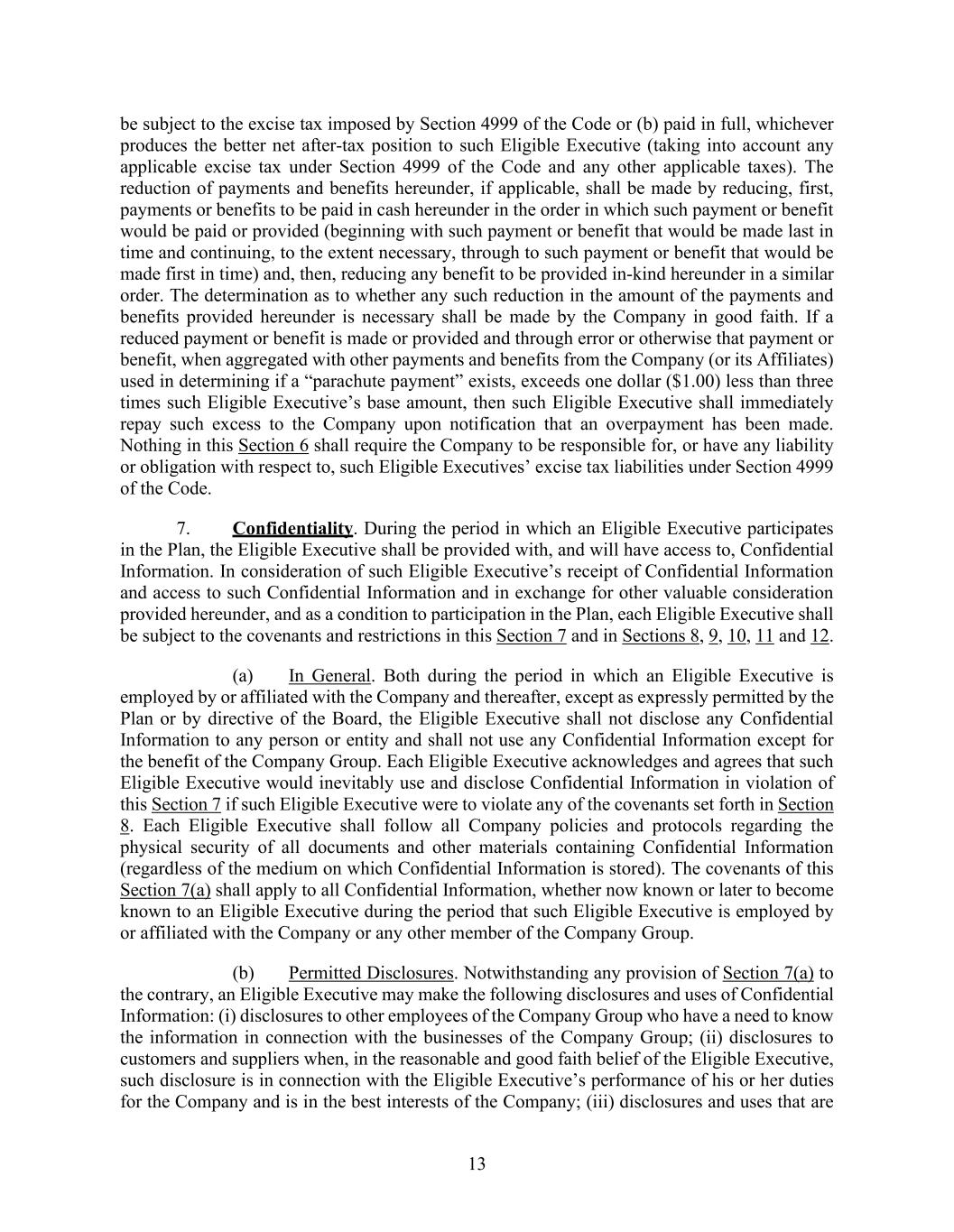 13 be subject to the excise tax imposed by Section 4999 of the Code or (b) paid in full, whichever produces the better net after-tax position to such Eligible Executive (taking into account any applicable excise tax under Section 4999 of the Code and any other applicable taxes). The reduction of payments and benefits hereunder, if applicable, shall be made by reducing, first, payments or benefits to be paid in cash hereunder in the order in which such payment or benefit would be paid or provided (beginning with such payment or benefit that would be made last in time and continuing, to the extent necessary, through to such payment or benefit that would be made first in time) and, then, reducing any benefit to be provided in-kind hereunder in a similar order. The determination as to whether any such reduction in the amount of the payments and benefits provided hereunder is necessary shall be made by the Company in good faith. If a reduced payment or benefit is made or provided and through error or otherwise that payment or benefit, when aggregated with other payments and benefits from the Company (or its Affiliates) used in determining if a “parachute payment” exists, exceeds one dollar ($1.00) less than three times such Eligible Executive’s base amount, then such Eligible Executive shall immediately repay such excess to the Company upon notification that an overpayment has been made. Nothing in this Section 6 shall require the Company to be responsible for, or have any liability or obligation with respect to, such Eligible Executives’ excise tax liabilities under Section 4999 of the Code. 7. Confidentiality. During the period in which an Eligible Executive participates in the Plan, the Eligible Executive shall be provided with, and will have access to, Confidential Information. In consideration of such Eligible Executive’s receipt of Confidential Information and access to such Confidential Information and in exchange for other valuable consideration provided hereunder, and as a condition to participation in the Plan, each Eligible Executive shall be subject to the covenants and restrictions in this Section 7 and in Sections 8, 9, 10, 11 and 12. (a) In General. Both during the period in which an Eligible Executive is employed by or affiliated with the Company and thereafter, except as expressly permitted by the Plan or by directive of the Board, the Eligible Executive shall not disclose any Confidential Information to any person or entity and shall not use any Confidential Information except for the benefit of the Company Group. Each Eligible Executive acknowledges and agrees that such Eligible Executive would inevitably use and disclose Confidential Information in violation of this Section 7 if such Eligible Executive were to violate any of the covenants set forth in Section 8. Each Eligible Executive shall follow all Company policies and protocols regarding the physical security of all documents and other materials containing Confidential Information (regardless of the medium on which Confidential Information is stored). The covenants of this Section 7(a) shall apply to all Confidential Information, whether now known or later to become known to an Eligible Executive during the period that such Eligible Executive is employed by or affiliated with the Company or any other member of the Company Group. (b) Permitted Disclosures. Notwithstanding any provision of Section 7(a) to the contrary, an Eligible Executive may make the following disclosures and uses of Confidential Information: (i) disclosures to other employees of the Company Group who have a need to know the information in connection with the businesses of the Company Group; (ii) disclosures to customers and suppliers when, in the reasonable and good faith belief of the Eligible Executive, such disclosure is in connection with the Eligible Executive’s performance of his or her duties for the Company and is in the best interests of the Company; (iii) disclosures and uses that are