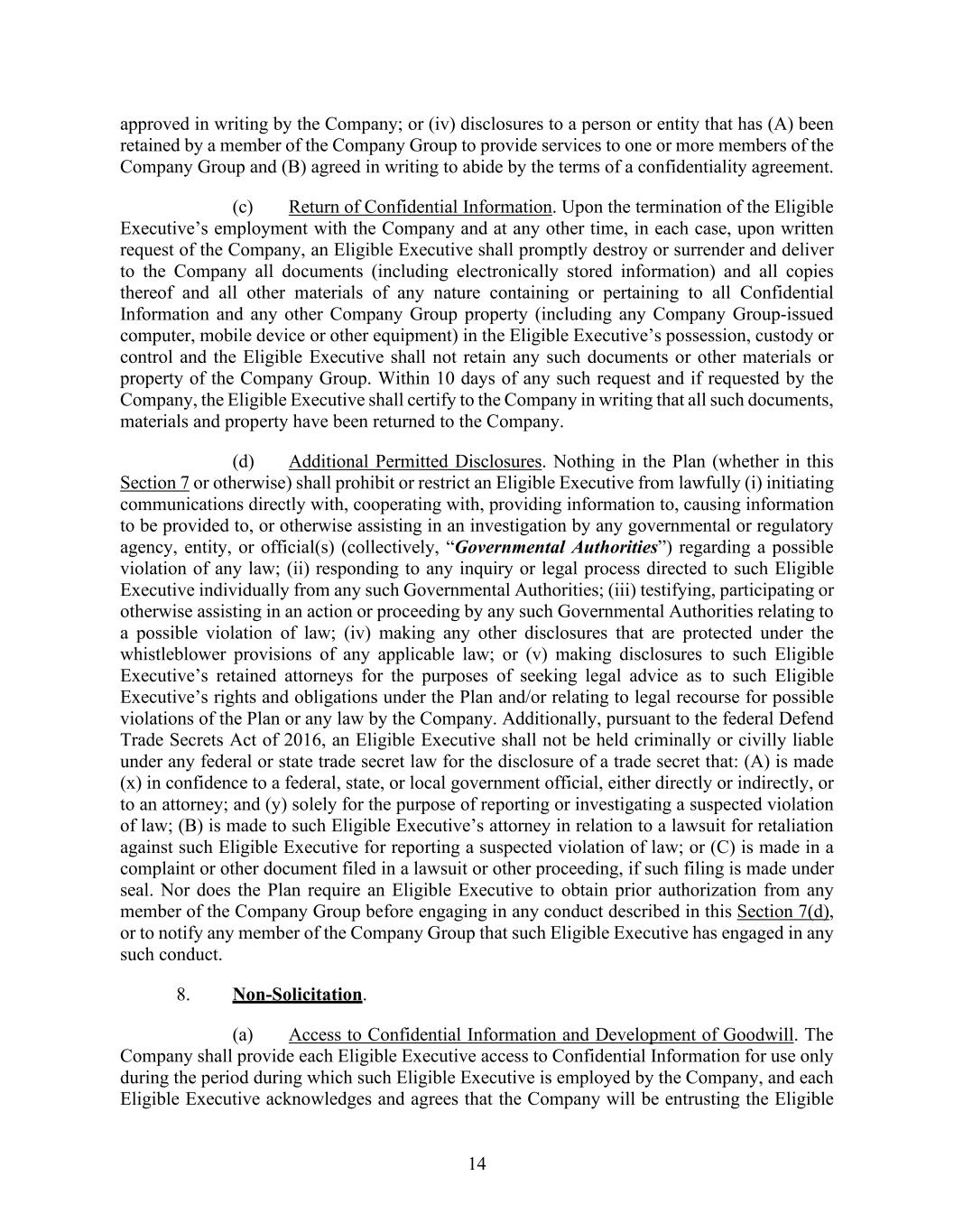 14 approved in writing by the Company; or (iv) disclosures to a person or entity that has (A) been retained by a member of the Company Group to provide services to one or more members of the Company Group and (B) agreed in writing to abide by the terms of a confidentiality agreement. (c) Return of Confidential Information. Upon the termination of the Eligible Executive’s employment with the Company and at any other time, in each case, upon written request of the Company, an Eligible Executive shall promptly destroy or surrender and deliver to the Company all documents (including electronically stored information) and all copies thereof and all other materials of any nature containing or pertaining to all Confidential Information and any other Company Group property (including any Company Group-issued computer, mobile device or other equipment) in the Eligible Executive’s possession, custody or control and the Eligible Executive shall not retain any such documents or other materials or property of the Company Group. Within 10 days of any such request and if requested by the Company, the Eligible Executive shall certify to the Company in writing that all such documents, materials and property have been returned to the Company. (d) Additional Permitted Disclosures. Nothing in the Plan (whether in this Section 7 or otherwise) shall prohibit or restrict an Eligible Executive from lawfully (i) initiating communications directly with, cooperating with, providing information to, causing information to be provided to, or otherwise assisting in an investigation by any governmental or regulatory agency, entity, or official(s) (collectively, “Governmental Authorities”) regarding a possible violation of any law; (ii) responding to any inquiry or legal process directed to such Eligible Executive individually from any such Governmental Authorities; (iii) testifying, participating or otherwise assisting in an action or proceeding by any such Governmental Authorities relating to a possible violation of law; (iv) making any other disclosures that are protected under the whistleblower provisions of any applicable law; or (v) making disclosures to such Eligible Executive’s retained attorneys for the purposes of seeking legal advice as to such Eligible Executive’s rights and obligations under the Plan and/or relating to legal recourse for possible violations of the Plan or any law by the Company. Additionally, pursuant to the federal Defend Trade Secrets Act of 2016, an Eligible Executive shall not be held criminally or civilly liable under any federal or state trade secret law for the disclosure of a trade secret that: (A) is made (x) in confidence to a federal, state, or local government official, either directly or indirectly, or to an attorney; and (y) solely for the purpose of reporting or investigating a suspected violation of law; (B) is made to such Eligible Executive’s attorney in relation to a lawsuit for retaliation against such Eligible Executive for reporting a suspected violation of law; or (C) is made in a complaint or other document filed in a lawsuit or other proceeding, if such filing is made under seal. Nor does the Plan require an Eligible Executive to obtain prior authorization from any member of the Company Group before engaging in any conduct described in this Section 7(d), or to notify any member of the Company Group that such Eligible Executive has engaged in any such conduct. 8. Non-Solicitation. (a) Access to Confidential Information and Development of Goodwill. The Company shall provide each Eligible Executive access to Confidential Information for use only during the period during which such Eligible Executive is employed by the Company, and each Eligible Executive acknowledges and agrees that the Company will be entrusting the Eligible