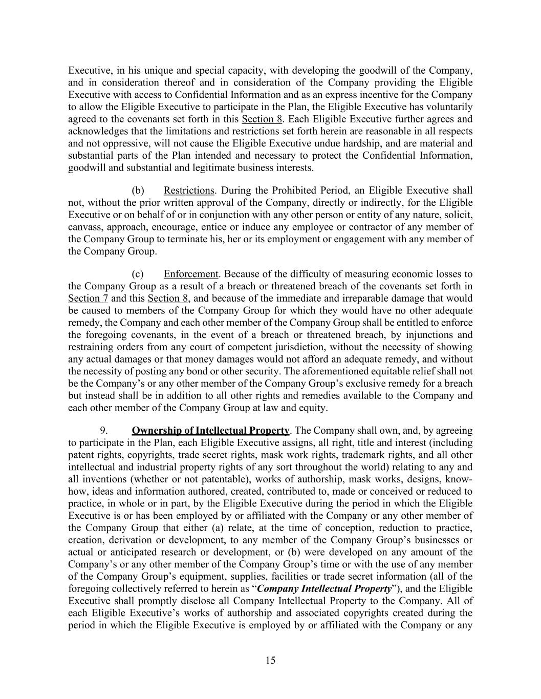 15 Executive, in his unique and special capacity, with developing the goodwill of the Company, and in consideration thereof and in consideration of the Company providing the Eligible Executive with access to Confidential Information and as an express incentive for the Company to allow the Eligible Executive to participate in the Plan, the Eligible Executive has voluntarily agreed to the covenants set forth in this Section 8. Each Eligible Executive further agrees and acknowledges that the limitations and restrictions set forth herein are reasonable in all respects and not oppressive, will not cause the Eligible Executive undue hardship, and are material and substantial parts of the Plan intended and necessary to protect the Confidential Information, goodwill and substantial and legitimate business interests. (b) Restrictions. During the Prohibited Period, an Eligible Executive shall not, without the prior written approval of the Company, directly or indirectly, for the Eligible Executive or on behalf of or in conjunction with any other person or entity of any nature, solicit, canvass, approach, encourage, entice or induce any employee or contractor of any member of the Company Group to terminate his, her or its employment or engagement with any member of the Company Group. (c) Enforcement. Because of the difficulty of measuring economic losses to the Company Group as a result of a breach or threatened breach of the covenants set forth in Section 7 and this Section 8, and because of the immediate and irreparable damage that would be caused to members of the Company Group for which they would have no other adequate remedy, the Company and each other member of the Company Group shall be entitled to enforce the foregoing covenants, in the event of a breach or threatened breach, by injunctions and restraining orders from any court of competent jurisdiction, without the necessity of showing any actual damages or that money damages would not afford an adequate remedy, and without the necessity of posting any bond or other security. The aforementioned equitable relief shall not be the Company’s or any other member of the Company Group’s exclusive remedy for a breach but instead shall be in addition to all other rights and remedies available to the Company and each other member of the Company Group at law and equity. 9. Ownership of Intellectual Property. The Company shall own, and, by agreeing to participate in the Plan, each Eligible Executive assigns, all right, title and interest (including patent rights, copyrights, trade secret rights, mask work rights, trademark rights, and all other intellectual and industrial property rights of any sort throughout the world) relating to any and all inventions (whether or not patentable), works of authorship, mask works, designs, know- how, ideas and information authored, created, contributed to, made or conceived or reduced to practice, in whole or in part, by the Eligible Executive during the period in which the Eligible Executive is or has been employed by or affiliated with the Company or any other member of the Company Group that either (a) relate, at the time of conception, reduction to practice, creation, derivation or development, to any member of the Company Group’s businesses or actual or anticipated research or development, or (b) were developed on any amount of the Company’s or any other member of the Company Group’s time or with the use of any member of the Company Group’s equipment, supplies, facilities or trade secret information (all of the foregoing collectively referred to herein as “Company Intellectual Property”), and the Eligible Executive shall promptly disclose all Company Intellectual Property to the Company. All of each Eligible Executive’s works of authorship and associated copyrights created during the period in which the Eligible Executive is employed by or affiliated with the Company or any