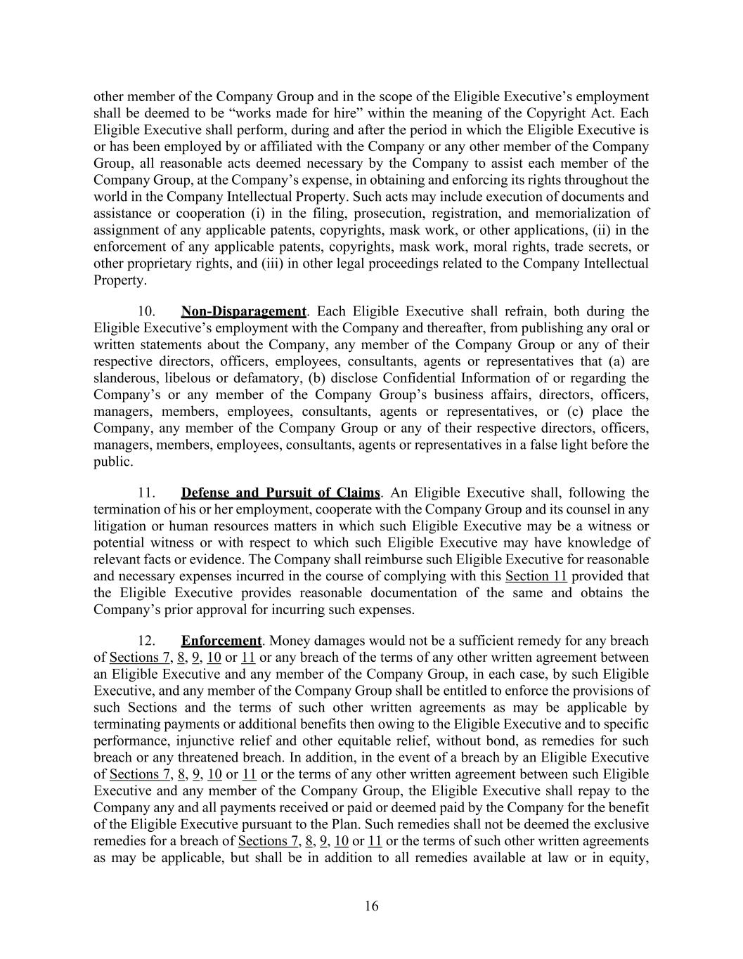 16 other member of the Company Group and in the scope of the Eligible Executive’s employment shall be deemed to be “works made for hire” within the meaning of the Copyright Act. Each Eligible Executive shall perform, during and after the period in which the Eligible Executive is or has been employed by or affiliated with the Company or any other member of the Company Group, all reasonable acts deemed necessary by the Company to assist each member of the Company Group, at the Company’s expense, in obtaining and enforcing its rights throughout the world in the Company Intellectual Property. Such acts may include execution of documents and assistance or cooperation (i) in the filing, prosecution, registration, and memorialization of assignment of any applicable patents, copyrights, mask work, or other applications, (ii) in the enforcement of any applicable patents, copyrights, mask work, moral rights, trade secrets, or other proprietary rights, and (iii) in other legal proceedings related to the Company Intellectual Property. 10. Non-Disparagement. Each Eligible Executive shall refrain, both during the Eligible Executive’s employment with the Company and thereafter, from publishing any oral or written statements about the Company, any member of the Company Group or any of their respective directors, officers, employees, consultants, agents or representatives that (a) are slanderous, libelous or defamatory, (b) disclose Confidential Information of or regarding the Company’s or any member of the Company Group’s business affairs, directors, officers, managers, members, employees, consultants, agents or representatives, or (c) place the Company, any member of the Company Group or any of their respective directors, officers, managers, members, employees, consultants, agents or representatives in a false light before the public. 11. Defense and Pursuit of Claims. An Eligible Executive shall, following the termination of his or her employment, cooperate with the Company Group and its counsel in any litigation or human resources matters in which such Eligible Executive may be a witness or potential witness or with respect to which such Eligible Executive may have knowledge of relevant facts or evidence. The Company shall reimburse such Eligible Executive for reasonable and necessary expenses incurred in the course of complying with this Section 11 provided that the Eligible Executive provides reasonable documentation of the same and obtains the Company’s prior approval for incurring such expenses. 12. Enforcement. Money damages would not be a sufficient remedy for any breach of Sections 7, 8, 9, 10 or 11 or any breach of the terms of any other written agreement between an Eligible Executive and any member of the Company Group, in each case, by such Eligible Executive, and any member of the Company Group shall be entitled to enforce the provisions of such Sections and the terms of such other written agreements as may be applicable by terminating payments or additional benefits then owing to the Eligible Executive and to specific performance, injunctive relief and other equitable relief, without bond, as remedies for such breach or any threatened breach. In addition, in the event of a breach by an Eligible Executive of Sections 7, 8, 9, 10 or 11 or the terms of any other written agreement between such Eligible Executive and any member of the Company Group, the Eligible Executive shall repay to the Company any and all payments received or paid or deemed paid by the Company for the benefit of the Eligible Executive pursuant to the Plan. Such remedies shall not be deemed the exclusive remedies for a breach of Sections 7, 8, 9, 10 or 11 or the terms of such other written agreements as may be applicable, but shall be in addition to all remedies available at law or in equity,