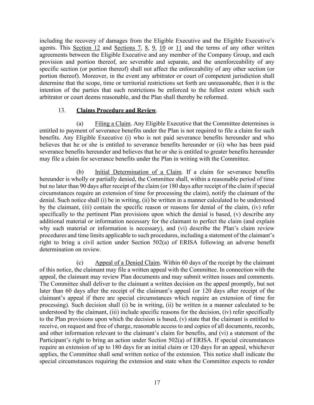 17 including the recovery of damages from the Eligible Executive and the Eligible Executive’s agents. This Section 12 and Sections 7, 8, 9, 10 or 11 and the terms of any other written agreements between the Eligible Executive and any member of the Company Group, and each provision and portion thereof, are severable and separate, and the unenforceability of any specific section (or portion thereof) shall not affect the enforceability of any other section (or portion thereof). Moreover, in the event any arbitrator or court of competent jurisdiction shall determine that the scope, time or territorial restrictions set forth are unreasonable, then it is the intention of the parties that such restrictions be enforced to the fullest extent which such arbitrator or court deems reasonable, and the Plan shall thereby be reformed. 13. Claims Procedure and Review. (a) Filing a Claim. Any Eligible Executive that the Committee determines is entitled to payment of severance benefits under the Plan is not required to file a claim for such benefits. Any Eligible Executive (i) who is not paid severance benefits hereunder and who believes that he or she is entitled to severance benefits hereunder or (ii) who has been paid severance benefits hereunder and believes that he or she is entitled to greater benefits hereunder may file a claim for severance benefits under the Plan in writing with the Committee. (b) Initial Determination of a Claim. If a claim for severance benefits hereunder is wholly or partially denied, the Committee shall, within a reasonable period of time but no later than 90 days after receipt of the claim (or 180 days after receipt of the claim if special circumstances require an extension of time for processing the claim), notify the claimant of the denial. Such notice shall (i) be in writing, (ii) be written in a manner calculated to be understood by the claimant, (iii) contain the specific reason or reasons for denial of the claim, (iv) refer specifically to the pertinent Plan provisions upon which the denial is based, (v) describe any additional material or information necessary for the claimant to perfect the claim (and explain why such material or information is necessary), and (vi) describe the Plan’s claim review procedures and time limits applicable to such procedures, including a statement of the claimant’s right to bring a civil action under Section 502(a) of ERISA following an adverse benefit determination on review. (c) Appeal of a Denied Claim. Within 60 days of the receipt by the claimant of this notice, the claimant may file a written appeal with the Committee. In connection with the appeal, the claimant may review Plan documents and may submit written issues and comments. The Committee shall deliver to the claimant a written decision on the appeal promptly, but not later than 60 days after the receipt of the claimant’s appeal (or 120 days after receipt of the claimant’s appeal if there are special circumstances which require an extension of time for processing). Such decision shall (i) be in writing, (ii) be written in a manner calculated to be understood by the claimant, (iii) include specific reasons for the decision, (iv) refer specifically to the Plan provisions upon which the decision is based, (v) state that the claimant is entitled to receive, on request and free of charge, reasonable access to and copies of all documents, records, and other information relevant to the claimant’s claim for benefits, and (vi) a statement of the Participant’s right to bring an action under Section 502(a) of ERISA. If special circumstances require an extension of up to 180 days for an initial claim or 120 days for an appeal, whichever applies, the Committee shall send written notice of the extension. This notice shall indicate the special circumstances requiring the extension and state when the Committee expects to render