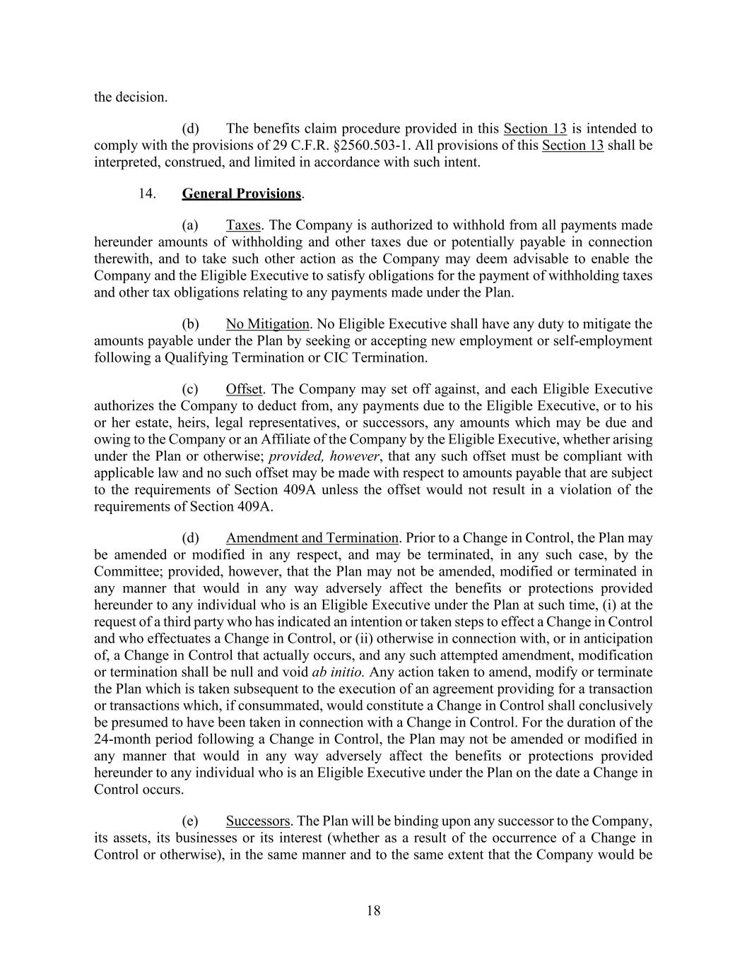 18 the decision. (d) The benefits claim procedure provided in this Section 13 is intended to comply with the provisions of 29 C.F.R. §2560.503-1. All provisions of this Section 13 shall be interpreted, construed, and limited in accordance with such intent. 14. General Provisions. (a) Taxes. The Company is authorized to withhold from all payments made hereunder amounts of withholding and other taxes due or potentially payable in connection therewith, and to take such other action as the Company may deem advisable to enable the Company and the Eligible Executive to satisfy obligations for the payment of withholding taxes and other tax obligations relating to any payments made under the Plan. (b) No Mitigation. No Eligible Executive shall have any duty to mitigate the amounts payable under the Plan by seeking or accepting new employment or self-employment following a Qualifying Termination or CIC Termination. (c) Offset. The Company may set off against, and each Eligible Executive authorizes the Company to deduct from, any payments due to the Eligible Executive, or to his or her estate, heirs, legal representatives, or successors, any amounts which may be due and owing to the Company or an Affiliate of the Company by the Eligible Executive, whether arising under the Plan or otherwise; provided, however, that any such offset must be compliant with applicable law and no such offset may be made with respect to amounts payable that are subject to the requirements of Section 409A unless the offset would not result in a violation of the requirements of Section 409A. (d) Amendment and Termination. Prior to a Change in Control, the Plan may be amended or modified in any respect, and may be terminated, in any such case, by the Committee; provided, however, that the Plan may not be amended, modified or terminated in any manner that would in any way adversely affect the benefits or protections provided hereunder to any individual who is an Eligible Executive under the Plan at such time, (i) at the request of a third party who has indicated an intention or taken steps to effect a Change in Control and who effectuates a Change in Control, or (ii) otherwise in connection with, or in anticipation of, a Change in Control that actually occurs, and any such attempted amendment, modification or termination shall be null and void ab initio. Any action taken to amend, modify or terminate the Plan which is taken subsequent to the execution of an agreement providing for a transaction or transactions which, if consummated, would constitute a Change in Control shall conclusively be presumed to have been taken in connection with a Change in Control. For the duration of the 24-month period following a Change in Control, the Plan may not be amended or modified in any manner that would in any way adversely affect the benefits or protections provided hereunder to any individual who is an Eligible Executive under the Plan on the date a Change in Control occurs. (e) Successors. The Plan will be binding upon any successor to the Company, its assets, its businesses or its interest (whether as a result of the occurrence of a Change in Control or otherwise), in the same manner and to the same extent that the Company would be