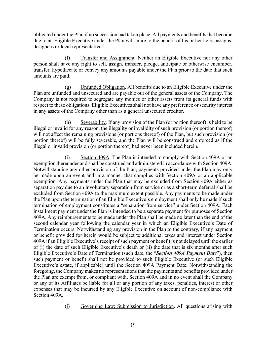 19 obligated under the Plan if no succession had taken place. All payments and benefits that become due to an Eligible Executive under the Plan will inure to the benefit of his or her heirs, assigns, designees or legal representatives. (f) Transfer and Assignment. Neither an Eligible Executive nor any other person shall have any right to sell, assign, transfer, pledge, anticipate or otherwise encumber, transfer, hypothecate or convey any amounts payable under the Plan prior to the date that such amounts are paid. (g) Unfunded Obligation. All benefits due to an Eligible Executive under the Plan are unfunded and unsecured and are payable out of the general assets of the Company. The Company is not required to segregate any monies or other assets from its general funds with respect to these obligations. Eligible Executives shall not have any preference or security interest in any assets of the Company other than as a general unsecured creditor. (h) Severability. If any provision of the Plan (or portion thereof) is held to be illegal or invalid for any reason, the illegality or invalidity of such provision (or portion thereof) will not affect the remaining provisions (or portions thereof) of the Plan, but such provision (or portion thereof) will be fully severable, and the Plan will be construed and enforced as if the illegal or invalid provision (or portion thereof) had never been included herein. (i) Section 409A. The Plan is intended to comply with Section 409A or an exemption thereunder and shall be construed and administered in accordance with Section 409A. Notwithstanding any other provision of the Plan, payments provided under the Plan may only be made upon an event and in a manner that complies with Section 409A or an applicable exemption. Any payments under the Plan that may be excluded from Section 409A either as separation pay due to an involuntary separation from service or as a short-term deferral shall be excluded from Section 409A to the maximum extent possible. Any payments to be made under the Plan upon the termination of an Eligible Executive’s employment shall only be made if such termination of employment constitutes a “separation from service” under Section 409A. Each installment payment under the Plan is intended to be a separate payment for purposes of Section 409A. Any reimbursements to be made under the Plan shall be made no later than the end of the second calendar year following the calendar year in which an Eligible Executive’s Date of Termination occurs. Notwithstanding any provision in the Plan to the contrary, if any payment or benefit provided for herein would be subject to additional taxes and interest under Section 409A if an Eligible Executive’s receipt of such payment or benefit is not delayed until the earlier of (i) the date of such Eligible Executive’s death or (ii) the date that is six months after such Eligible Executive’s Date of Termination (such date, the “Section 409A Payment Date”), then such payment or benefit shall not be provided to such Eligible Executive (or such Eligible Executive’s estate, if applicable) until the Section 409A Payment Date. Notwithstanding the foregoing, the Company makes no representations that the payments and benefits provided under the Plan are exempt from, or compliant with, Section 409A and in no event shall the Company or any of its Affiliates be liable for all or any portion of any taxes, penalties, interest or other expenses that may be incurred by any Eligible Executive on account of non-compliance with Section 409A. (j) Governing Law; Submission to Jurisdiction. All questions arising with