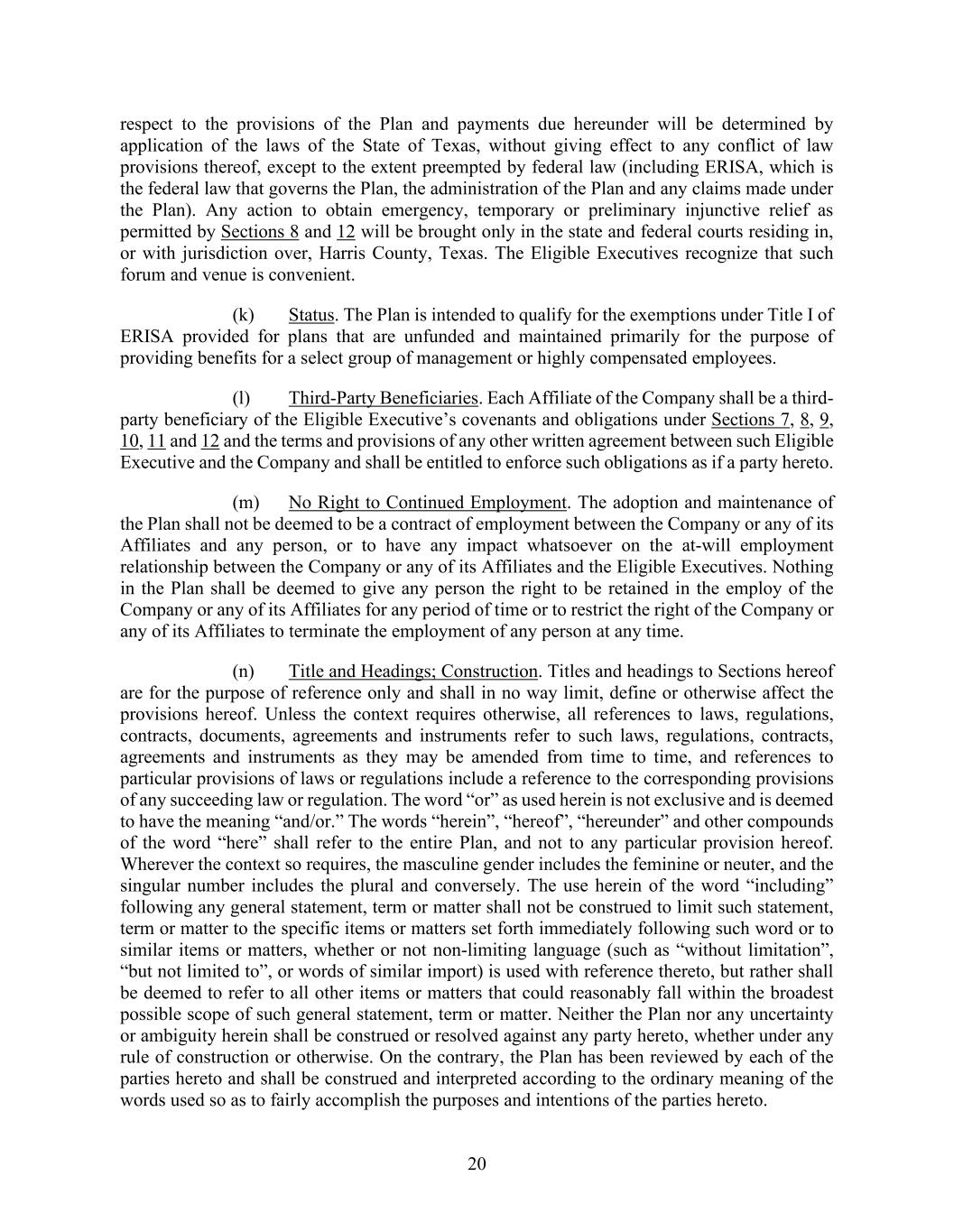 20 respect to the provisions of the Plan and payments due hereunder will be determined by application of the laws of the State of Texas, without giving effect to any conflict of law provisions thereof, except to the extent preempted by federal law (including ERISA, which is the federal law that governs the Plan, the administration of the Plan and any claims made under the Plan). Any action to obtain emergency, temporary or preliminary injunctive relief as permitted by Sections 8 and 12 will be brought only in the state and federal courts residing in, or with jurisdiction over, Harris County, Texas. The Eligible Executives recognize that such forum and venue is convenient. (k) Status. The Plan is intended to qualify for the exemptions under Title I of ERISA provided for plans that are unfunded and maintained primarily for the purpose of providing benefits for a select group of management or highly compensated employees. (l) Third-Party Beneficiaries. Each Affiliate of the Company shall be a third- party beneficiary of the Eligible Executive’s covenants and obligations under Sections 7, 8, 9, 10, 11 and 12 and the terms and provisions of any other written agreement between such Eligible Executive and the Company and shall be entitled to enforce such obligations as if a party hereto. (m) No Right to Continued Employment. The adoption and maintenance of the Plan shall not be deemed to be a contract of employment between the Company or any of its Affiliates and any person, or to have any impact whatsoever on the at-will employment relationship between the Company or any of its Affiliates and the Eligible Executives. Nothing in the Plan shall be deemed to give any person the right to be retained in the employ of the Company or any of its Affiliates for any period of time or to restrict the right of the Company or any of its Affiliates to terminate the employment of any person at any time. (n) Title and Headings; Construction. Titles and headings to Sections hereof are for the purpose of reference only and shall in no way limit, define or otherwise affect the provisions hereof. Unless the context requires otherwise, all references to laws, regulations, contracts, documents, agreements and instruments refer to such laws, regulations, contracts, agreements and instruments as they may be amended from time to time, and references to particular provisions of laws or regulations include a reference to the corresponding provisions of any succeeding law or regulation. The word “or” as used herein is not exclusive and is deemed to have the meaning “and/or.” The words “herein”, “hereof”, “hereunder” and other compounds of the word “here” shall refer to the entire Plan, and not to any particular provision hereof. Wherever the context so requires, the masculine gender includes the feminine or neuter, and the singular number includes the plural and conversely. The use herein of the word “including” following any general statement, term or matter shall not be construed to limit such statement, term or matter to the specific items or matters set forth immediately following such word or to similar items or matters, whether or not non-limiting language (such as “without limitation”, “but not limited to”, or words of similar import) is used with reference thereto, but rather shall be deemed to refer to all other items or matters that could reasonably fall within the broadest possible scope of such general statement, term or matter. Neither the Plan nor any uncertainty or ambiguity herein shall be construed or resolved against any party hereto, whether under any rule of construction or otherwise. On the contrary, the Plan has been reviewed by each of the parties hereto and shall be construed and interpreted according to the ordinary meaning of the words used so as to fairly accomplish the purposes and intentions of the parties hereto.