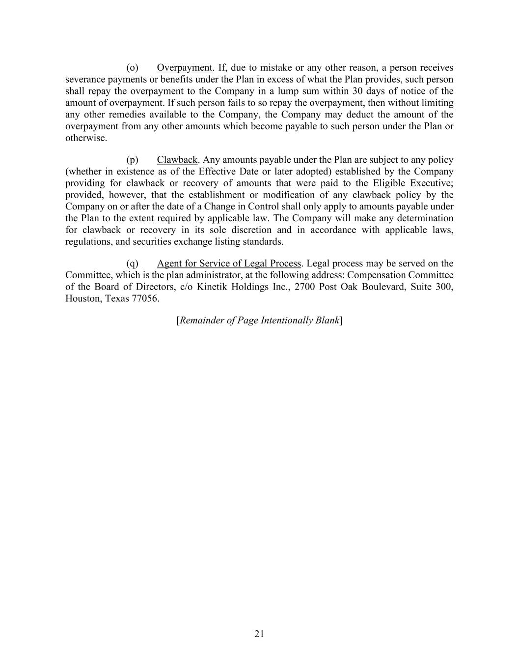 21 (o) Overpayment. If, due to mistake or any other reason, a person receives severance payments or benefits under the Plan in excess of what the Plan provides, such person shall repay the overpayment to the Company in a lump sum within 30 days of notice of the amount of overpayment. If such person fails to so repay the overpayment, then without limiting any other remedies available to the Company, the Company may deduct the amount of the overpayment from any other amounts which become payable to such person under the Plan or otherwise. (p) Clawback. Any amounts payable under the Plan are subject to any policy (whether in existence as of the Effective Date or later adopted) established by the Company providing for clawback or recovery of amounts that were paid to the Eligible Executive; provided, however, that the establishment or modification of any clawback policy by the Company on or after the date of a Change in Control shall only apply to amounts payable under the Plan to the extent required by applicable law. The Company will make any determination for clawback or recovery in its sole discretion and in accordance with applicable laws, regulations, and securities exchange listing standards. (q) Agent for Service of Legal Process. Legal process may be served on the Committee, which is the plan administrator, at the following address: Compensation Committee of the Board of Directors, c/o Kinetik Holdings Inc., 2700 Post Oak Boulevard, Suite 300, Houston, Texas 77056. [Remainder of Page Intentionally Blank]