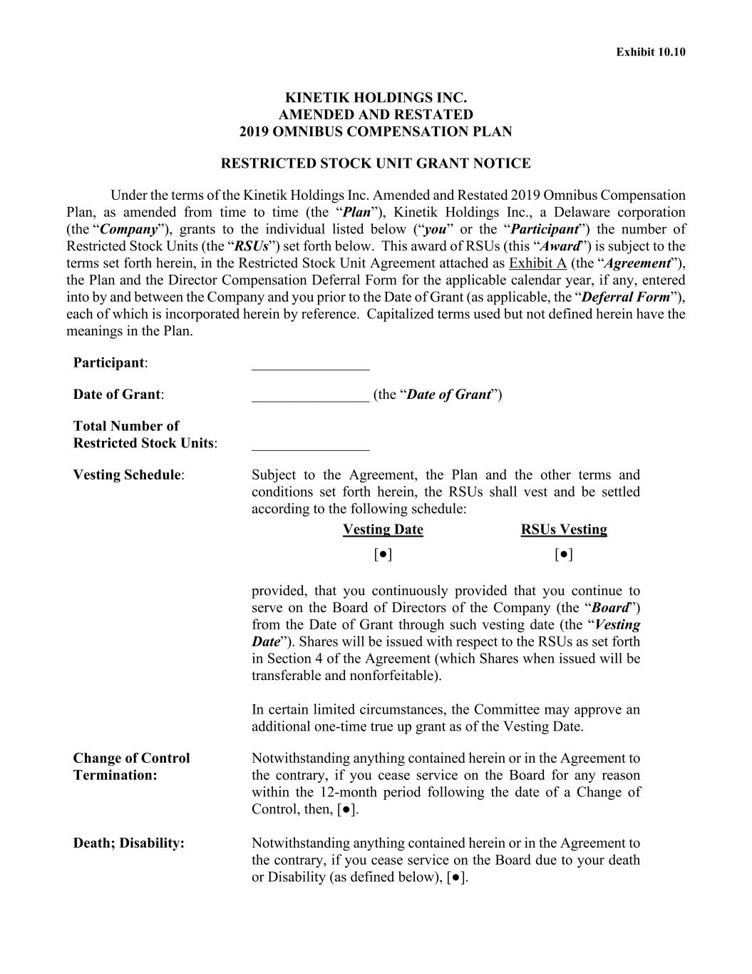 Exhibit 10.10 KINETIK HOLDINGS INC. AMENDED AND RESTATED 2019 OMNIBUS COMPENSATION PLAN RESTRICTED STOCK UNIT GRANT NOTICE Under the terms of the Kinetik Holdings Inc. Amended and Restated 2019 Omnibus Compensation Plan, as amended from time to time (the “Plan”), Kinetik Holdings Inc., a Delaware corporation (the “Company”), grants to the individual listed below (“you” or the “Participant”) the number of Restricted Stock Units (the “RSUs”) set forth below. This award of RSUs (this “Award”) is subject to the terms set forth herein, in the Restricted Stock Unit Agreement attached as Exhibit A (the “Agreement”), the Plan and the Director Compensation Deferral Form for the applicable calendar year, if any, entered into by and between the Company and you prior to the Date of Grant (as applicable, the “Deferral Form”), each of which is incorporated herein by reference. Capitalized terms used but not defined herein have the meanings in the Plan. Participant: ________________ Date of Grant: ________________ (the “Date of Grant”) Total Number of Restricted Stock Units: ________________ Vesting Schedule: Subject to the Agreement, the Plan and the other terms and conditions set forth herein, the RSUs shall vest and be settled according to the following schedule: Vesting Date RSUs Vesting [●] [●] provided, that you continuously provided that you continue to serve on the Board of Directors of the Company (the “Board”) from the Date of Grant through such vesting date (the “Vesting Date”). Shares will be issued with respect to the RSUs as set forth in Section 4 of the Agreement (which Shares when issued will be transferable and nonforfeitable). In certain limited circumstances, the Committee may approve an additional one-time true up grant as of the Vesting Date. Change of Control Termination: Notwithstanding anything contained herein or in the Agreement to the contrary, if you cease service on the Board for any reason within the 12-month period following the date of a Change of Control, then, [●]. Death; Disability: Notwithstanding anything contained herein or in the Agreement to the contrary, if you cease service on the Board due to your death or Disability (as defined below), [●].