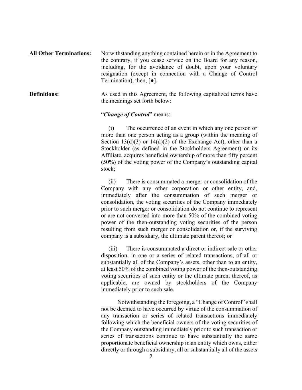 2 All Other Terminations: Notwithstanding anything contained herein or in the Agreement to the contrary, if you cease service on the Board for any reason, including, for the avoidance of doubt, upon your voluntary resignation (except in connection with a Change of Control Termination), then, [●]. Definitions: As used in this Agreement, the following capitalized terms have the meanings set forth below: “Change of Control” means: (i) The occurrence of an event in which any one person or more than one person acting as a group (within the meaning of Section 13(d)(3) or 14(d)(2) of the Exchange Act), other than a Stockholder (as defined in the Stockholders Agreement) or its Affiliate, acquires beneficial ownership of more than fifty percent (50%) of the voting power of the Company’s outstanding capital stock; (ii) There is consummated a merger or consolidation of the Company with any other corporation or other entity, and, immediately after the consummation of such merger or consolidation, the voting securities of the Company immediately prior to such merger or consolidation do not continue to represent or are not converted into more than 50% of the combined voting power of the then-outstanding voting securities of the person resulting from such merger or consolidation or, if the surviving company is a subsidiary, the ultimate parent thereof; or (iii) There is consummated a direct or indirect sale or other disposition, in one or a series of related transactions, of all or substantially all of the Company’s assets, other than to an entity, at least 50% of the combined voting power of the then-outstanding voting securities of such entity or the ultimate parent thereof, as applicable, are owned by stockholders of the Company immediately prior to such sale. Notwithstanding the foregoing, a “Change of Control” shall not be deemed to have occurred by virtue of the consummation of any transaction or series of related transactions immediately following which the beneficial owners of the voting securities of the Company outstanding immediately prior to such transaction or series of transactions continue to have substantially the same proportionate beneficial ownership in an entity which owns, either directly or through a subsidiary, all or substantially all of the assets