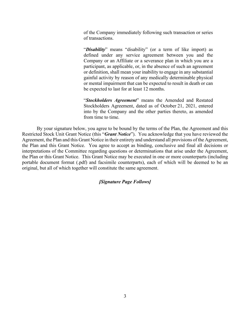 3 of the Company immediately following such transaction or series of transactions. “Disability” means “disability” (or a term of like import) as defined under any service agreement between you and the Company or an Affiliate or a severance plan in which you are a participant, as applicable, or, in the absence of such an agreement or definition, shall mean your inability to engage in any substantial gainful activity by reason of any medically determinable physical or mental impairment that can be expected to result in death or can be expected to last for at least 12 months. “Stockholders Agreement” means the Amended and Restated Stockholders Agreement, dated as of October 21, 2021, entered into by the Company and the other parties thereto, as amended from time to time. By your signature below, you agree to be bound by the terms of the Plan, the Agreement and this Restricted Stock Unit Grant Notice (this “Grant Notice”). You acknowledge that you have reviewed the Agreement, the Plan and this Grant Notice in their entirety and understand all provisions of the Agreement, the Plan and this Grant Notice. You agree to accept as binding, conclusive and final all decisions or interpretations of the Committee regarding questions or determinations that arise under the Agreement, the Plan or this Grant Notice. This Grant Notice may be executed in one or more counterparts (including portable document format (.pdf) and facsimile counterparts), each of which will be deemed to be an original, but all of which together will constitute the same agreement. [Signature Page Follows]