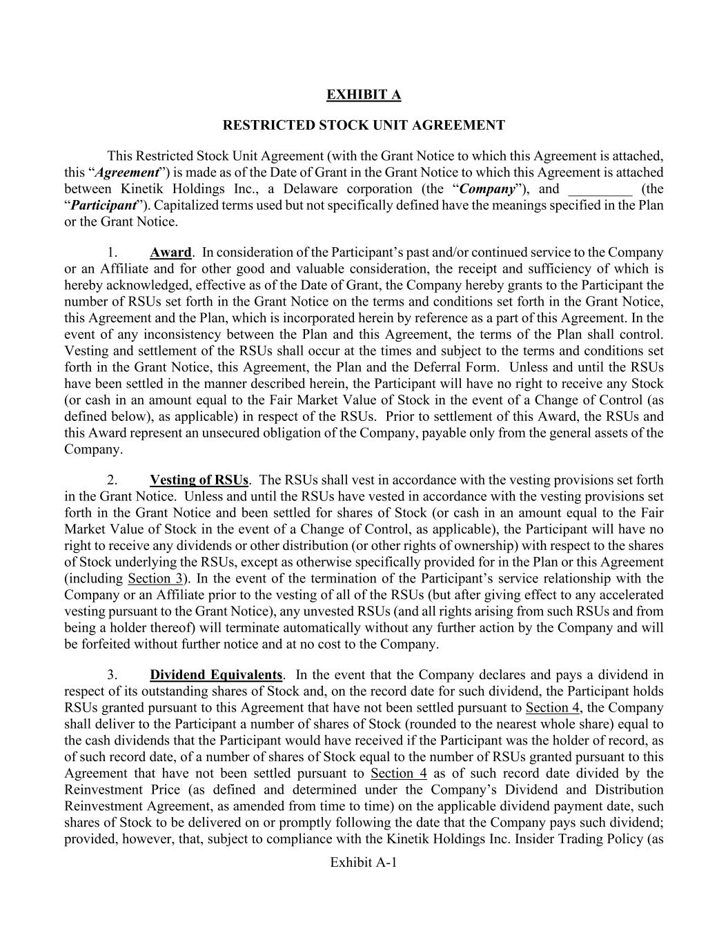 Exhibit A-1 EXHIBIT A RESTRICTED STOCK UNIT AGREEMENT This Restricted Stock Unit Agreement (with the Grant Notice to which this Agreement is attached, this “Agreement”) is made as of the Date of Grant in the Grant Notice to which this Agreement is attached between Kinetik Holdings Inc., a Delaware corporation (the “Company”), and _________ (the “Participant”). Capitalized terms used but not specifically defined have the meanings specified in the Plan or the Grant Notice. 1. Award. In consideration of the Participant’s past and/or continued service to the Company or an Affiliate and for other good and valuable consideration, the receipt and sufficiency of which is hereby acknowledged, effective as of the Date of Grant, the Company hereby grants to the Participant the number of RSUs set forth in the Grant Notice on the terms and conditions set forth in the Grant Notice, this Agreement and the Plan, which is incorporated herein by reference as a part of this Agreement. In the event of any inconsistency between the Plan and this Agreement, the terms of the Plan shall control. Vesting and settlement of the RSUs shall occur at the times and subject to the terms and conditions set forth in the Grant Notice, this Agreement, the Plan and the Deferral Form. Unless and until the RSUs have been settled in the manner described herein, the Participant will have no right to receive any Stock (or cash in an amount equal to the Fair Market Value of Stock in the event of a Change of Control (as defined below), as applicable) in respect of the RSUs. Prior to settlement of this Award, the RSUs and this Award represent an unsecured obligation of the Company, payable only from the general assets of the Company. 2. Vesting of RSUs. The RSUs shall vest in accordance with the vesting provisions set forth in the Grant Notice. Unless and until the RSUs have vested in accordance with the vesting provisions set forth in the Grant Notice and been settled for shares of Stock (or cash in an amount equal to the Fair Market Value of Stock in the event of a Change of Control, as applicable), the Participant will have no right to receive any dividends or other distribution (or other rights of ownership) with respect to the shares of Stock underlying the RSUs, except as otherwise specifically provided for in the Plan or this Agreement (including Section 3). In the event of the termination of the Participant’s service relationship with the Company or an Affiliate prior to the vesting of all of the RSUs (but after giving effect to any accelerated vesting pursuant to the Grant Notice), any unvested RSUs (and all rights arising from such RSUs and from being a holder thereof) will terminate automatically without any further action by the Company and will be forfeited without further notice and at no cost to the Company. 3. Dividend Equivalents. In the event that the Company declares and pays a dividend in respect of its outstanding shares of Stock and, on the record date for such dividend, the Participant holds RSUs granted pursuant to this Agreement that have not been settled pursuant to Section 4, the Company shall deliver to the Participant a number of shares of Stock (rounded to the nearest whole share) equal to the cash dividends that the Participant would have received if the Participant was the holder of record, as of such record date, of a number of shares of Stock equal to the number of RSUs granted pursuant to this Agreement that have not been settled pursuant to Section 4 as of such record date divided by the Reinvestment Price (as defined and determined under the Company’s Dividend and Distribution Reinvestment Agreement, as amended from time to time) on the applicable dividend payment date, such shares of Stock to be delivered on or promptly following the date that the Company pays such dividend; provided, however, that, subject to compliance with the Kinetik Holdings Inc. Insider Trading Policy (as