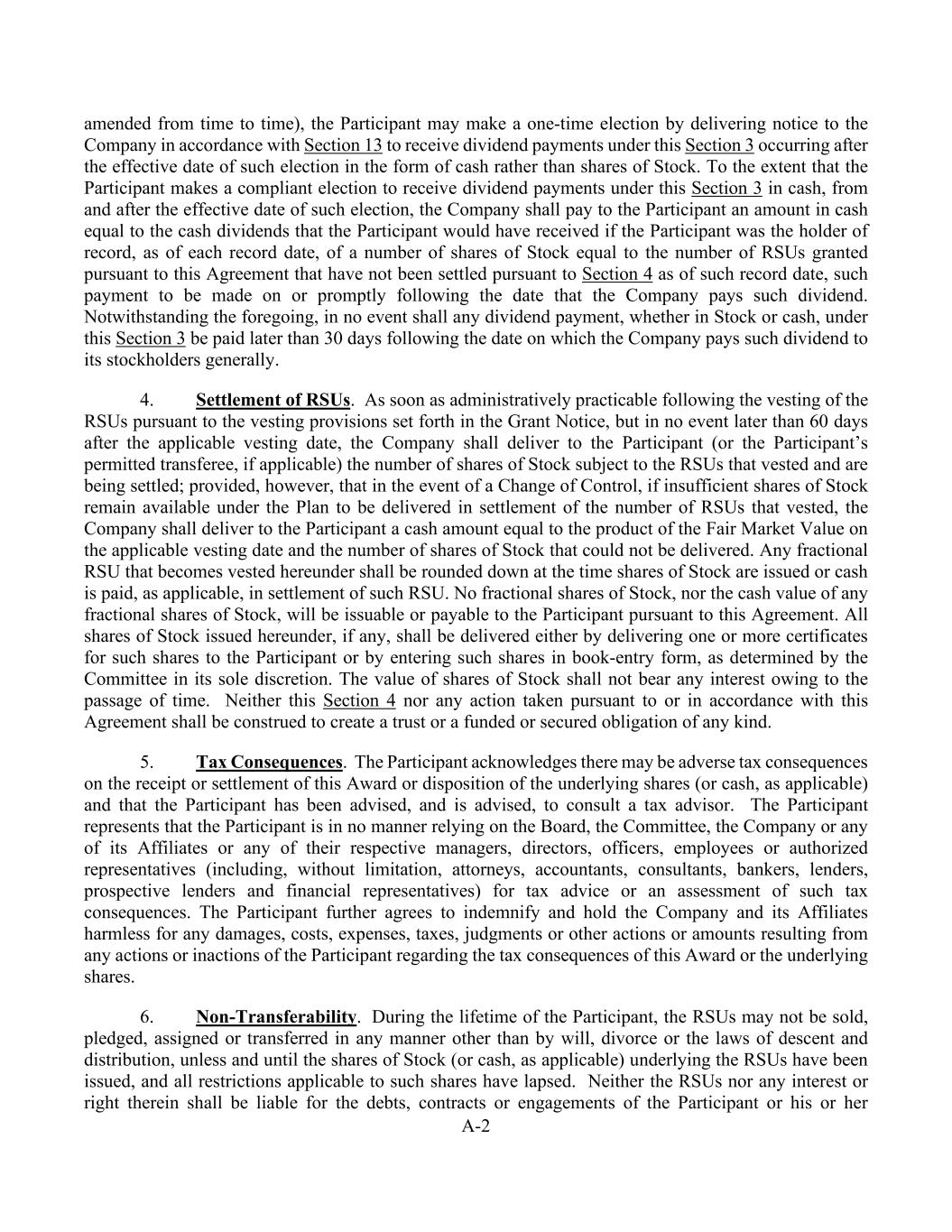 A-2 amended from time to time), the Participant may make a one-time election by delivering notice to the Company in accordance with Section 13 to receive dividend payments under this Section 3 occurring after the effective date of such election in the form of cash rather than shares of Stock. To the extent that the Participant makes a compliant election to receive dividend payments under this Section 3 in cash, from and after the effective date of such election, the Company shall pay to the Participant an amount in cash equal to the cash dividends that the Participant would have received if the Participant was the holder of record, as of each record date, of a number of shares of Stock equal to the number of RSUs granted pursuant to this Agreement that have not been settled pursuant to Section 4 as of such record date, such payment to be made on or promptly following the date that the Company pays such dividend. Notwithstanding the foregoing, in no event shall any dividend payment, whether in Stock or cash, under this Section 3 be paid later than 30 days following the date on which the Company pays such dividend to its stockholders generally. 4. Settlement of RSUs. As soon as administratively practicable following the vesting of the RSUs pursuant to the vesting provisions set forth in the Grant Notice, but in no event later than 60 days after the applicable vesting date, the Company shall deliver to the Participant (or the Participant’s permitted transferee, if applicable) the number of shares of Stock subject to the RSUs that vested and are being settled; provided, however, that in the event of a Change of Control, if insufficient shares of Stock remain available under the Plan to be delivered in settlement of the number of RSUs that vested, the Company shall deliver to the Participant a cash amount equal to the product of the Fair Market Value on the applicable vesting date and the number of shares of Stock that could not be delivered. Any fractional RSU that becomes vested hereunder shall be rounded down at the time shares of Stock are issued or cash is paid, as applicable, in settlement of such RSU. No fractional shares of Stock, nor the cash value of any fractional shares of Stock, will be issuable or payable to the Participant pursuant to this Agreement. All shares of Stock issued hereunder, if any, shall be delivered either by delivering one or more certificates for such shares to the Participant or by entering such shares in book-entry form, as determined by the Committee in its sole discretion. The value of shares of Stock shall not bear any interest owing to the passage of time. Neither this Section 4 nor any action taken pursuant to or in accordance with this Agreement shall be construed to create a trust or a funded or secured obligation of any kind. 5. Tax Consequences. The Participant acknowledges there may be adverse tax consequences on the receipt or settlement of this Award or disposition of the underlying shares (or cash, as applicable) and that the Participant has been advised, and is advised, to consult a tax advisor. The Participant represents that the Participant is in no manner relying on the Board, the Committee, the Company or any of its Affiliates or any of their respective managers, directors, officers, employees or authorized representatives (including, without limitation, attorneys, accountants, consultants, bankers, lenders, prospective lenders and financial representatives) for tax advice or an assessment of such tax consequences. The Participant further agrees to indemnify and hold the Company and its Affiliates harmless for any damages, costs, expenses, taxes, judgments or other actions or amounts resulting from any actions or inactions of the Participant regarding the tax consequences of this Award or the underlying shares. 6. Non-Transferability. During the lifetime of the Participant, the RSUs may not be sold, pledged, assigned or transferred in any manner other than by will, divorce or the laws of descent and distribution, unless and until the shares of Stock (or cash, as applicable) underlying the RSUs have been issued, and all restrictions applicable to such shares have lapsed. Neither the RSUs nor any interest or right therein shall be liable for the debts, contracts or engagements of the Participant or his or her