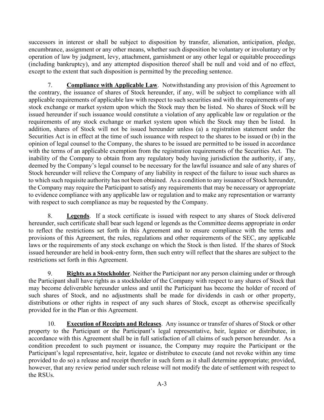 A-3 successors in interest or shall be subject to disposition by transfer, alienation, anticipation, pledge, encumbrance, assignment or any other means, whether such disposition be voluntary or involuntary or by operation of law by judgment, levy, attachment, garnishment or any other legal or equitable proceedings (including bankruptcy), and any attempted disposition thereof shall be null and void and of no effect, except to the extent that such disposition is permitted by the preceding sentence. 7. Compliance with Applicable Law. Notwithstanding any provision of this Agreement to the contrary, the issuance of shares of Stock hereunder, if any, will be subject to compliance with all applicable requirements of applicable law with respect to such securities and with the requirements of any stock exchange or market system upon which the Stock may then be listed. No shares of Stock will be issued hereunder if such issuance would constitute a violation of any applicable law or regulation or the requirements of any stock exchange or market system upon which the Stock may then be listed. In addition, shares of Stock will not be issued hereunder unless (a) a registration statement under the Securities Act is in effect at the time of such issuance with respect to the shares to be issued or (b) in the opinion of legal counsel to the Company, the shares to be issued are permitted to be issued in accordance with the terms of an applicable exemption from the registration requirements of the Securities Act. The inability of the Company to obtain from any regulatory body having jurisdiction the authority, if any, deemed by the Company’s legal counsel to be necessary for the lawful issuance and sale of any shares of Stock hereunder will relieve the Company of any liability in respect of the failure to issue such shares as to which such requisite authority has not been obtained. As a condition to any issuance of Stock hereunder, the Company may require the Participant to satisfy any requirements that may be necessary or appropriate to evidence compliance with any applicable law or regulation and to make any representation or warranty with respect to such compliance as may be requested by the Company. 8. Legends. If a stock certificate is issued with respect to any shares of Stock delivered hereunder, such certificate shall bear such legend or legends as the Committee deems appropriate in order to reflect the restrictions set forth in this Agreement and to ensure compliance with the terms and provisions of this Agreement, the rules, regulations and other requirements of the SEC, any applicable laws or the requirements of any stock exchange on which the Stock is then listed. If the shares of Stock issued hereunder are held in book-entry form, then such entry will reflect that the shares are subject to the restrictions set forth in this Agreement. 9. Rights as a Stockholder. Neither the Participant nor any person claiming under or through the Participant shall have rights as a stockholder of the Company with respect to any shares of Stock that may become deliverable hereunder unless and until the Participant has become the holder of record of such shares of Stock, and no adjustments shall be made for dividends in cash or other property, distributions or other rights in respect of any such shares of Stock, except as otherwise specifically provided for in the Plan or this Agreement. 10. Execution of Receipts and Releases. Any issuance or transfer of shares of Stock or other property to the Participant or the Participant’s legal representative, heir, legatee or distributee, in accordance with this Agreement shall be in full satisfaction of all claims of such person hereunder. As a condition precedent to such payment or issuance, the Company may require the Participant or the Participant’s legal representative, heir, legatee or distributee to execute (and not revoke within any time provided to do so) a release and receipt therefor in such form as it shall determine appropriate; provided, however, that any review period under such release will not modify the date of settlement with respect to the RSUs.