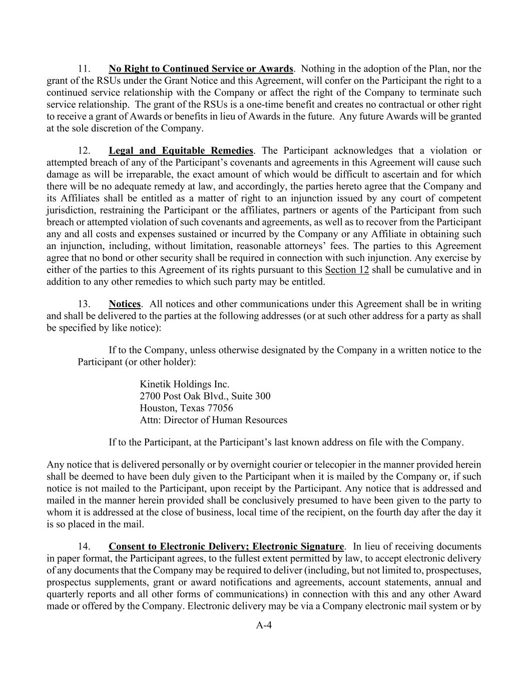 A-4 11. No Right to Continued Service or Awards. Nothing in the adoption of the Plan, nor the grant of the RSUs under the Grant Notice and this Agreement, will confer on the Participant the right to a continued service relationship with the Company or affect the right of the Company to terminate such service relationship. The grant of the RSUs is a one-time benefit and creates no contractual or other right to receive a grant of Awards or benefits in lieu of Awards in the future. Any future Awards will be granted at the sole discretion of the Company. 12. Legal and Equitable Remedies. The Participant acknowledges that a violation or attempted breach of any of the Participant’s covenants and agreements in this Agreement will cause such damage as will be irreparable, the exact amount of which would be difficult to ascertain and for which there will be no adequate remedy at law, and accordingly, the parties hereto agree that the Company and its Affiliates shall be entitled as a matter of right to an injunction issued by any court of competent jurisdiction, restraining the Participant or the affiliates, partners or agents of the Participant from such breach or attempted violation of such covenants and agreements, as well as to recover from the Participant any and all costs and expenses sustained or incurred by the Company or any Affiliate in obtaining such an injunction, including, without limitation, reasonable attorneys’ fees. The parties to this Agreement agree that no bond or other security shall be required in connection with such injunction. Any exercise by either of the parties to this Agreement of its rights pursuant to this Section 12 shall be cumulative and in addition to any other remedies to which such party may be entitled. 13. Notices. All notices and other communications under this Agreement shall be in writing and shall be delivered to the parties at the following addresses (or at such other address for a party as shall be specified by like notice): If to the Company, unless otherwise designated by the Company in a written notice to the Participant (or other holder): Kinetik Holdings Inc. 2700 Post Oak Blvd., Suite 300 Houston, Texas 77056 Attn: Director of Human Resources If to the Participant, at the Participant’s last known address on file with the Company. Any notice that is delivered personally or by overnight courier or telecopier in the manner provided herein shall be deemed to have been duly given to the Participant when it is mailed by the Company or, if such notice is not mailed to the Participant, upon receipt by the Participant. Any notice that is addressed and mailed in the manner herein provided shall be conclusively presumed to have been given to the party to whom it is addressed at the close of business, local time of the recipient, on the fourth day after the day it is so placed in the mail. 14. Consent to Electronic Delivery; Electronic Signature. In lieu of receiving documents in paper format, the Participant agrees, to the fullest extent permitted by law, to accept electronic delivery of any documents that the Company may be required to deliver (including, but not limited to, prospectuses, prospectus supplements, grant or award notifications and agreements, account statements, annual and quarterly reports and all other forms of communications) in connection with this and any other Award made or offered by the Company. Electronic delivery may be via a Company electronic mail system or by