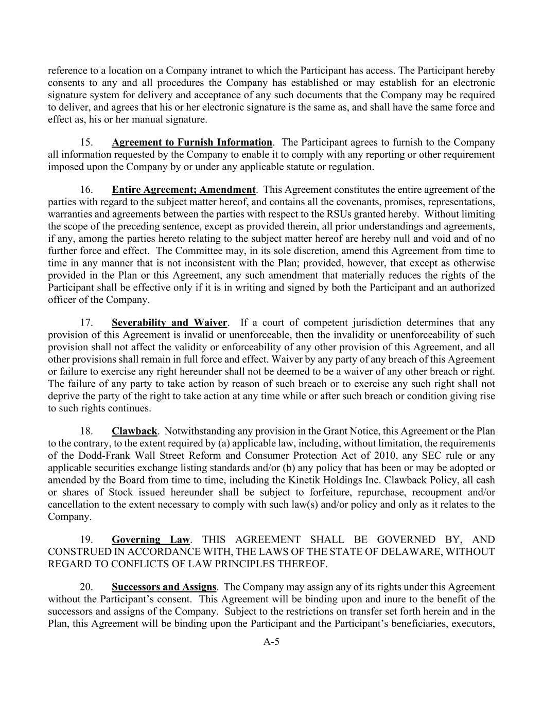 A-5 reference to a location on a Company intranet to which the Participant has access. The Participant hereby consents to any and all procedures the Company has established or may establish for an electronic signature system for delivery and acceptance of any such documents that the Company may be required to deliver, and agrees that his or her electronic signature is the same as, and shall have the same force and effect as, his or her manual signature. 15. Agreement to Furnish Information. The Participant agrees to furnish to the Company all information requested by the Company to enable it to comply with any reporting or other requirement imposed upon the Company by or under any applicable statute or regulation. 16. Entire Agreement; Amendment. This Agreement constitutes the entire agreement of the parties with regard to the subject matter hereof, and contains all the covenants, promises, representations, warranties and agreements between the parties with respect to the RSUs granted hereby. Without limiting the scope of the preceding sentence, except as provided therein, all prior understandings and agreements, if any, among the parties hereto relating to the subject matter hereof are hereby null and void and of no further force and effect. The Committee may, in its sole discretion, amend this Agreement from time to time in any manner that is not inconsistent with the Plan; provided, however, that except as otherwise provided in the Plan or this Agreement, any such amendment that materially reduces the rights of the Participant shall be effective only if it is in writing and signed by both the Participant and an authorized officer of the Company. 17. Severability and Waiver. If a court of competent jurisdiction determines that any provision of this Agreement is invalid or unenforceable, then the invalidity or unenforceability of such provision shall not affect the validity or enforceability of any other provision of this Agreement, and all other provisions shall remain in full force and effect. Waiver by any party of any breach of this Agreement or failure to exercise any right hereunder shall not be deemed to be a waiver of any other breach or right. The failure of any party to take action by reason of such breach or to exercise any such right shall not deprive the party of the right to take action at any time while or after such breach or condition giving rise to such rights continues. 18. Clawback. Notwithstanding any provision in the Grant Notice, this Agreement or the Plan to the contrary, to the extent required by (a) applicable law, including, without limitation, the requirements of the Dodd-Frank Wall Street Reform and Consumer Protection Act of 2010, any SEC rule or any applicable securities exchange listing standards and/or (b) any policy that has been or may be adopted or amended by the Board from time to time, including the Kinetik Holdings Inc. Clawback Policy, all cash or shares of Stock issued hereunder shall be subject to forfeiture, repurchase, recoupment and/or cancellation to the extent necessary to comply with such law(s) and/or policy and only as it relates to the Company. 19. Governing Law. THIS AGREEMENT SHALL BE GOVERNED BY, AND CONSTRUED IN ACCORDANCE WITH, THE LAWS OF THE STATE OF DELAWARE, WITHOUT REGARD TO CONFLICTS OF LAW PRINCIPLES THEREOF. 20. Successors and Assigns. The Company may assign any of its rights under this Agreement without the Participant’s consent. This Agreement will be binding upon and inure to the benefit of the successors and assigns of the Company. Subject to the restrictions on transfer set forth herein and in the Plan, this Agreement will be binding upon the Participant and the Participant’s beneficiaries, executors,