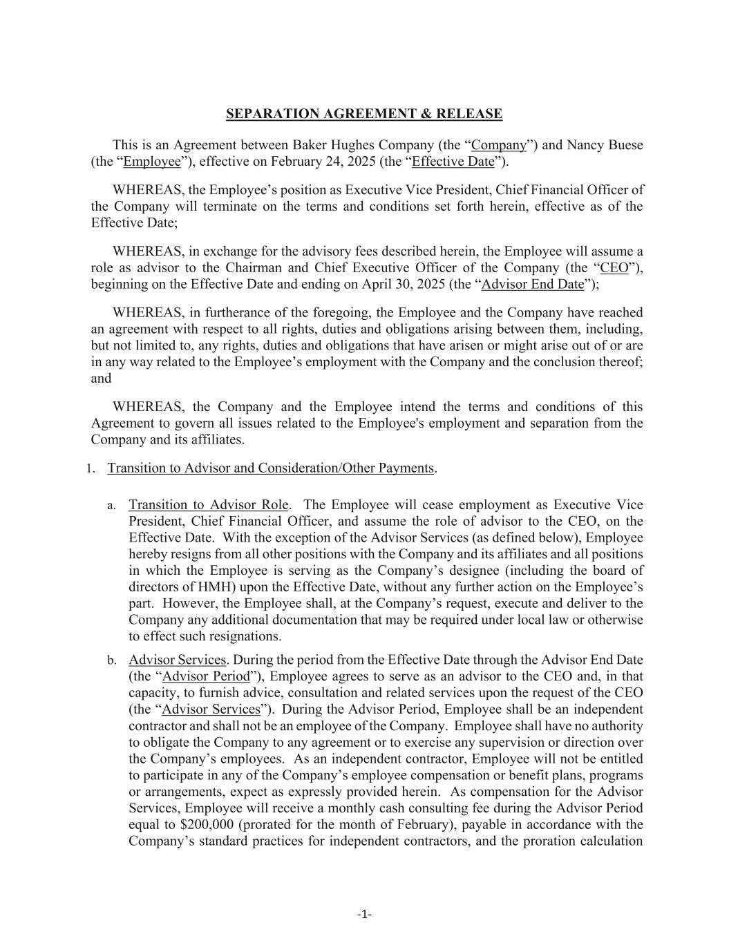 -1- SEPARATION AGREEMENT & RELEASE This is an Agreement between Baker Hughes Company (the “Company”) and Nancy Buese (the “Employee”), effective on February 24, 2025 (the “Effective Date”). WHEREAS, the Employee’s position as Executive Vice President, Chief Financial Officer of the Company will terminate on the terms and conditions set forth herein, effective as of the Effective Date; WHEREAS, in exchange for the advisory fees described herein, the Employee will assume a role as advisor to the Chairman and Chief Executive Officer of the Company (the “CEO”), beginning on the Effective Date and ending on April 30, 2025 (the “Advisor End Date”); WHEREAS, in furtherance of the foregoing, the Employee and the Company have reached an agreement with respect to all rights, duties and obligations arising between them, including, but not limited to, any rights, duties and obligations that have arisen or might arise out of or are in any way related to the Employee’s employment with the Company and the conclusion thereof; and WHEREAS, the Company and the Employee intend the terms and conditions of this Agreement to govern all issues related to the Employee's employment and separation from the Company and its affiliates. 1. Transition to Advisor and Consideration/Other Payments. a. Transition to Advisor Role. The Employee will cease employment as Executive Vice President, Chief Financial Officer, and assume the role of advisor to the CEO, on the Effective Date. With the exception of the Advisor Services (as defined below), Employee hereby resigns from all other positions with the Company and its affiliates and all positions in which the Employee is serving as the Company’s designee (including the board of directors of HMH) upon the Effective Date, without any further action on the Employee’s part. However, the Employee shall, at the Company’s request, execute and deliver to the Company any additional documentation that may be required under local law or otherwise to effect such resignations. b. Advisor Services. During the period from the Effective Date through the Advisor End Date (the “Advisor Period”), Employee agrees to serve as an advisor to the CEO and, in that capacity, to furnish advice, consultation and related services upon the request of the CEO (the “Advisor Services”). During the Advisor Period, Employee shall be an independent contractor and shall not be an employee of the Company. Employee shall have no authority to obligate the Company to any agreement or to exercise any supervision or direction over the Company’s employees. As an independent contractor, Employee will not be entitled to participate in any of the Company’s employee compensation or benefit plans, programs or arrangements, expect as expressly provided herein. As compensation for the Advisor Services, Employee will receive a monthly cash consulting fee during the Advisor Period equal to $200,000 (prorated for the month of February), payable in accordance with the Company’s standard practices for independent contractors, and the proration calculation