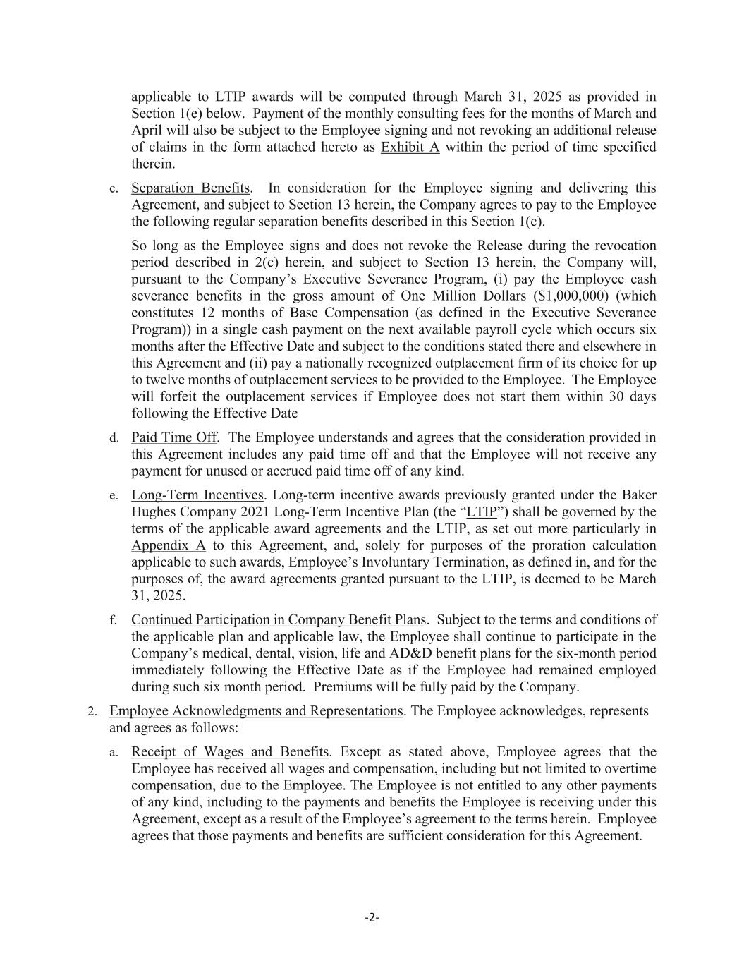 -2- applicable to LTIP awards will be computed through March 31, 2025 as provided in Section 1(e) below. Payment of the monthly consulting fees for the months of March and April will also be subject to the Employee signing and not revoking an additional release of claims in the form attached hereto as Exhibit A within the period of time specified therein. c. Separation Benefits. In consideration for the Employee signing and delivering this Agreement, and subject to Section 13 herein, the Company agrees to pay to the Employee the following regular separation benefits described in this Section 1(c). So long as the Employee signs and does not revoke the Release during the revocation period described in 2(c) herein, and subject to Section 13 herein, the Company will, pursuant to the Company’s Executive Severance Program, (i) pay the Employee cash severance benefits in the gross amount of One Million Dollars ($1,000,000) (which constitutes 12 months of Base Compensation (as defined in the Executive Severance Program)) in a single cash payment on the next available payroll cycle which occurs six months after the Effective Date and subject to the conditions stated there and elsewhere in this Agreement and (ii) pay a nationally recognized outplacement firm of its choice for up to twelve months of outplacement services to be provided to the Employee. The Employee will forfeit the outplacement services if Employee does not start them within 30 days following the Effective Date d. Paid Time Off. The Employee understands and agrees that the consideration provided in this Agreement includes any paid time off and that the Employee will not receive any payment for unused or accrued paid time off of any kind. e. Long-Term Incentives. Long-term incentive awards previously granted under the Baker Hughes Company 2021 Long-Term Incentive Plan (the “LTIP”) shall be governed by the terms of the applicable award agreements and the LTIP, as set out more particularly in Appendix A to this Agreement, and, solely for purposes of the proration calculation applicable to such awards, Employee’s Involuntary Termination, as defined in, and for the purposes of, the award agreements granted pursuant to the LTIP, is deemed to be March 31, 2025. f. Continued Participation in Company Benefit Plans. Subject to the terms and conditions of the applicable plan and applicable law, the Employee shall continue to participate in the Company’s medical, dental, vision, life and AD&D benefit plans for the six-month period immediately following the Effective Date as if the Employee had remained employed during such six month period. Premiums will be fully paid by the Company. 2. Employee Acknowledgments and Representations. The Employee acknowledges, represents and agrees as follows: a. Receipt of Wages and Benefits. Except as stated above, Employee agrees that the Employee has received all wages and compensation, including but not limited to overtime compensation, due to the Employee. The Employee is not entitled to any other payments of any kind, including to the payments and benefits the Employee is receiving under this Agreement, except as a result of the Employee’s agreement to the terms herein. Employee agrees that those payments and benefits are sufficient consideration for this Agreement.