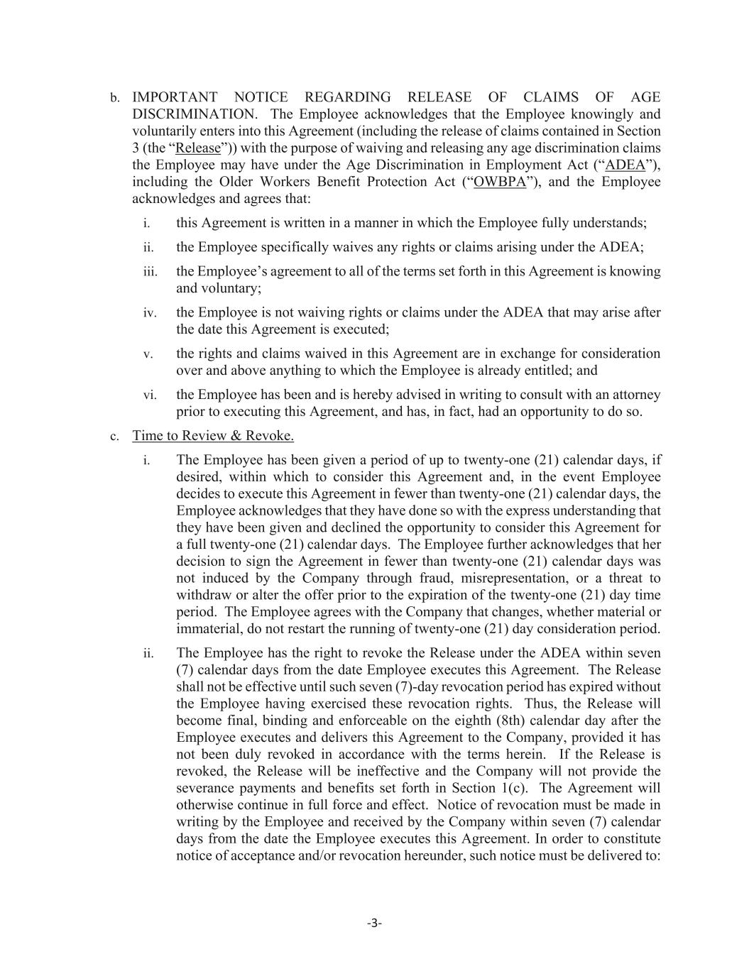 -3- b. IMPORTANT NOTICE REGARDING RELEASE OF CLAIMS OF AGE DISCRIMINATION. The Employee acknowledges that the Employee knowingly and voluntarily enters into this Agreement (including the release of claims contained in Section 3 (the “Release”)) with the purpose of waiving and releasing any age discrimination claims the Employee may have under the Age Discrimination in Employment Act (“ADEA”), including the Older Workers Benefit Protection Act (“OWBPA”), and the Employee acknowledges and agrees that: i. this Agreement is written in a manner in which the Employee fully understands; ii. the Employee specifically waives any rights or claims arising under the ADEA; iii. the Employee’s agreement to all of the terms set forth in this Agreement is knowing and voluntary; iv. the Employee is not waiving rights or claims under the ADEA that may arise after the date this Agreement is executed; v. the rights and claims waived in this Agreement are in exchange for consideration over and above anything to which the Employee is already entitled; and vi. the Employee has been and is hereby advised in writing to consult with an attorney prior to executing this Agreement, and has, in fact, had an opportunity to do so. c. Time to Review & Revoke. i. The Employee has been given a period of up to twenty-one (21) calendar days, if desired, within which to consider this Agreement and, in the event Employee decides to execute this Agreement in fewer than twenty-one (21) calendar days, the Employee acknowledges that they have done so with the express understanding that they have been given and declined the opportunity to consider this Agreement for a full twenty-one (21) calendar days. The Employee further acknowledges that her decision to sign the Agreement in fewer than twenty-one (21) calendar days was not induced by the Company through fraud, misrepresentation, or a threat to withdraw or alter the offer prior to the expiration of the twenty-one (21) day time period. The Employee agrees with the Company that changes, whether material or immaterial, do not restart the running of twenty-one (21) day consideration period. ii. The Employee has the right to revoke the Release under the ADEA within seven (7) calendar days from the date Employee executes this Agreement. The Release shall not be effective until such seven (7)-day revocation period has expired without the Employee having exercised these revocation rights. Thus, the Release will become final, binding and enforceable on the eighth (8th) calendar day after the Employee executes and delivers this Agreement to the Company, provided it has not been duly revoked in accordance with the terms herein. If the Release is revoked, the Release will be ineffective and the Company will not provide the severance payments and benefits set forth in Section 1(c). The Agreement will otherwise continue in full force and effect. Notice of revocation must be made in writing by the Employee and received by the Company within seven (7) calendar days from the date the Employee executes this Agreement. In order to constitute notice of acceptance and/or revocation hereunder, such notice must be delivered to: