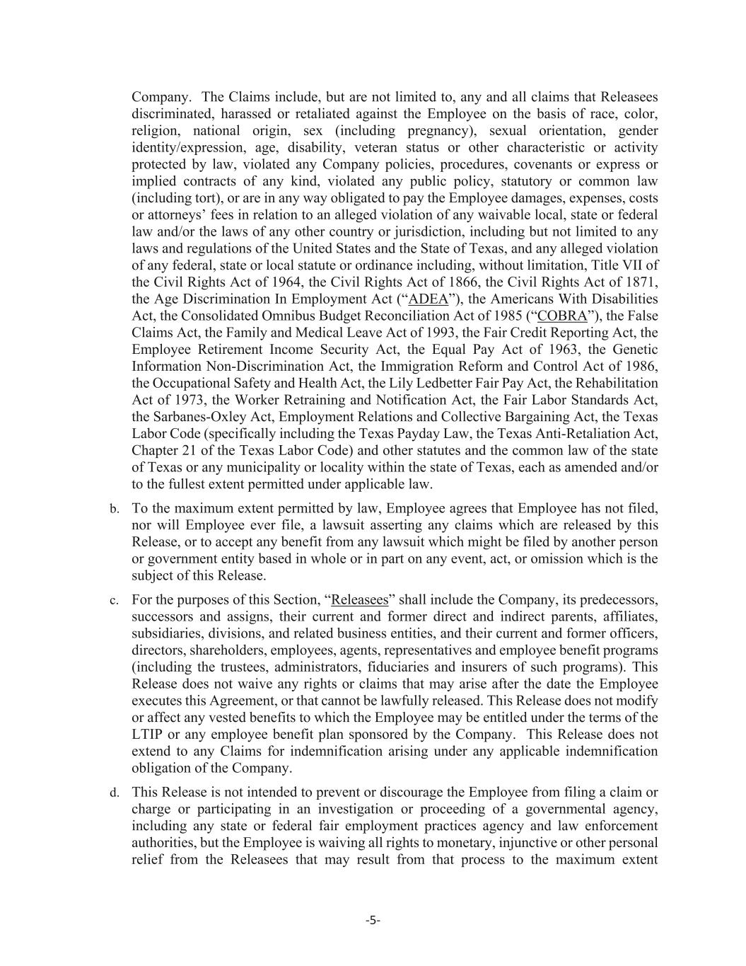 -5- Company. The Claims include, but are not limited to, any and all claims that Releasees discriminated, harassed or retaliated against the Employee on the basis of race, color, religion, national origin, sex (including pregnancy), sexual orientation, gender identity/expression, age, disability, veteran status or other characteristic or activity protected by law, violated any Company policies, procedures, covenants or express or implied contracts of any kind, violated any public policy, statutory or common law (including tort), or are in any way obligated to pay the Employee damages, expenses, costs or attorneys’ fees in relation to an alleged violation of any waivable local, state or federal law and/or the laws of any other country or jurisdiction, including but not limited to any laws and regulations of the United States and the State of Texas, and any alleged violation of any federal, state or local statute or ordinance including, without limitation, Title VII of the Civil Rights Act of 1964, the Civil Rights Act of 1866, the Civil Rights Act of 1871, the Age Discrimination In Employment Act (“ADEA”), the Americans With Disabilities Act, the Consolidated Omnibus Budget Reconciliation Act of 1985 (“COBRA”), the False Claims Act, the Family and Medical Leave Act of 1993, the Fair Credit Reporting Act, the Employee Retirement Income Security Act, the Equal Pay Act of 1963, the Genetic Information Non-Discrimination Act, the Immigration Reform and Control Act of 1986, the Occupational Safety and Health Act, the Lily Ledbetter Fair Pay Act, the Rehabilitation Act of 1973, the Worker Retraining and Notification Act, the Fair Labor Standards Act, the Sarbanes-Oxley Act, Employment Relations and Collective Bargaining Act, the Texas Labor Code (specifically including the Texas Payday Law, the Texas Anti-Retaliation Act, Chapter 21 of the Texas Labor Code) and other statutes and the common law of the state of Texas or any municipality or locality within the state of Texas, each as amended and/or to the fullest extent permitted under applicable law. b. To the maximum extent permitted by law, Employee agrees that Employee has not filed, nor will Employee ever file, a lawsuit asserting any claims which are released by this Release, or to accept any benefit from any lawsuit which might be filed by another person or government entity based in whole or in part on any event, act, or omission which is the subject of this Release. c. For the purposes of this Section, “Releasees” shall include the Company, its predecessors, successors and assigns, their current and former direct and indirect parents, affiliates, subsidiaries, divisions, and related business entities, and their current and former officers, directors, shareholders, employees, agents, representatives and employee benefit programs (including the trustees, administrators, fiduciaries and insurers of such programs). This Release does not waive any rights or claims that may arise after the date the Employee executes this Agreement, or that cannot be lawfully released. This Release does not modify or affect any vested benefits to which the Employee may be entitled under the terms of the LTIP or any employee benefit plan sponsored by the Company. This Release does not extend to any Claims for indemnification arising under any applicable indemnification obligation of the Company. d. This Release is not intended to prevent or discourage the Employee from filing a claim or charge or participating in an investigation or proceeding of a governmental agency, including any state or federal fair employment practices agency and law enforcement authorities, but the Employee is waiving all rights to monetary, injunctive or other personal relief from the Releasees that may result from that process to the maximum extent