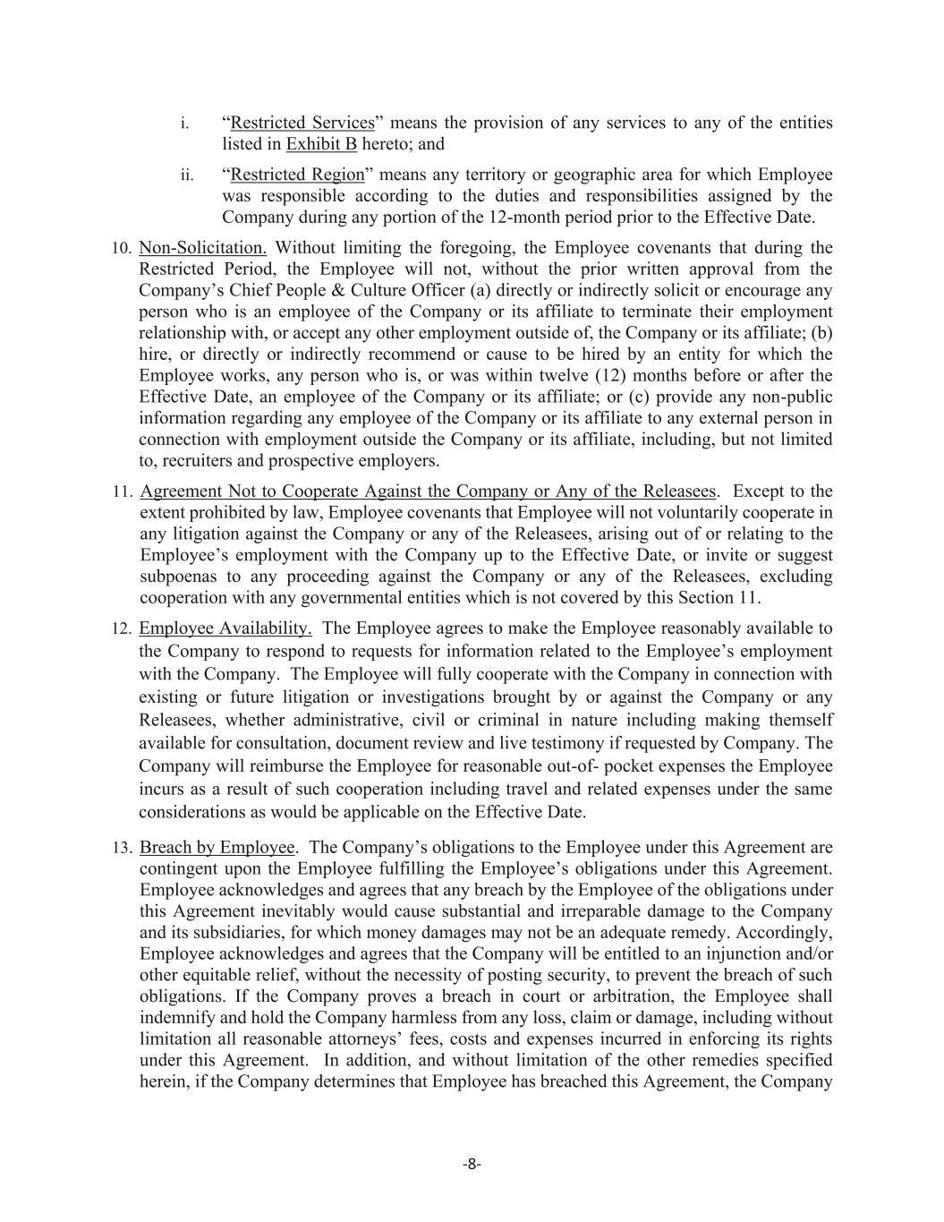 -8- i. “Restricted Services” means the provision of any services to any of the entities listed in Exhibit B hereto; and ii. “Restricted Region” means any territory or geographic area for which Employee was responsible according to the duties and responsibilities assigned by the Company during any portion of the 12-month period prior to the Effective Date. 10. Non-Solicitation. Without limiting the foregoing, the Employee covenants that during the Restricted Period, the Employee will not, without the prior written approval from the Company’s Chief People & Culture Officer (a) directly or indirectly solicit or encourage any person who is an employee of the Company or its affiliate to terminate their employment relationship with, or accept any other employment outside of, the Company or its affiliate; (b) hire, or directly or indirectly recommend or cause to be hired by an entity for which the Employee works, any person who is, or was within twelve (12) months before or after the Effective Date, an employee of the Company or its affiliate; or (c) provide any non-public information regarding any employee of the Company or its affiliate to any external person in connection with employment outside the Company or its affiliate, including, but not limited to, recruiters and prospective employers. 11. Agreement Not to Cooperate Against the Company or Any of the Releasees. Except to the extent prohibited by law, Employee covenants that Employee will not voluntarily cooperate in any litigation against the Company or any of the Releasees, arising out of or relating to the Employee’s employment with the Company up to the Effective Date, or invite or suggest subpoenas to any proceeding against the Company or any of the Releasees, excluding cooperation with any governmental entities which is not covered by this Section 11. 12. Employee Availability. The Employee agrees to make the Employee reasonably available to the Company to respond to requests for information related to the Employee’s employment with the Company. The Employee will fully cooperate with the Company in connection with existing or future litigation or investigations brought by or against the Company or any Releasees, whether administrative, civil or criminal in nature including making themself available for consultation, document review and live testimony if requested by Company. The Company will reimburse the Employee for reasonable out-of- pocket expenses the Employee incurs as a result of such cooperation including travel and related expenses under the same considerations as would be applicable on the Effective Date. 13. Breach by Employee. The Company’s obligations to the Employee under this Agreement are contingent upon the Employee fulfilling the Employee’s obligations under this Agreement. Employee acknowledges and agrees that any breach by the Employee of the obligations under this Agreement inevitably would cause substantial and irreparable damage to the Company and its subsidiaries, for which money damages may not be an adequate remedy. Accordingly, Employee acknowledges and agrees that the Company will be entitled to an injunction and/or other equitable relief, without the necessity of posting security, to prevent the breach of such obligations. If the Company proves a breach in court or arbitration, the Employee shall indemnify and hold the Company harmless from any loss, claim or damage, including without limitation all reasonable attorneys’ fees, costs and expenses incurred in enforcing its rights under this Agreement. In addition, and without limitation of the other remedies specified herein, if the Company determines that Employee has breached this Agreement, the Company