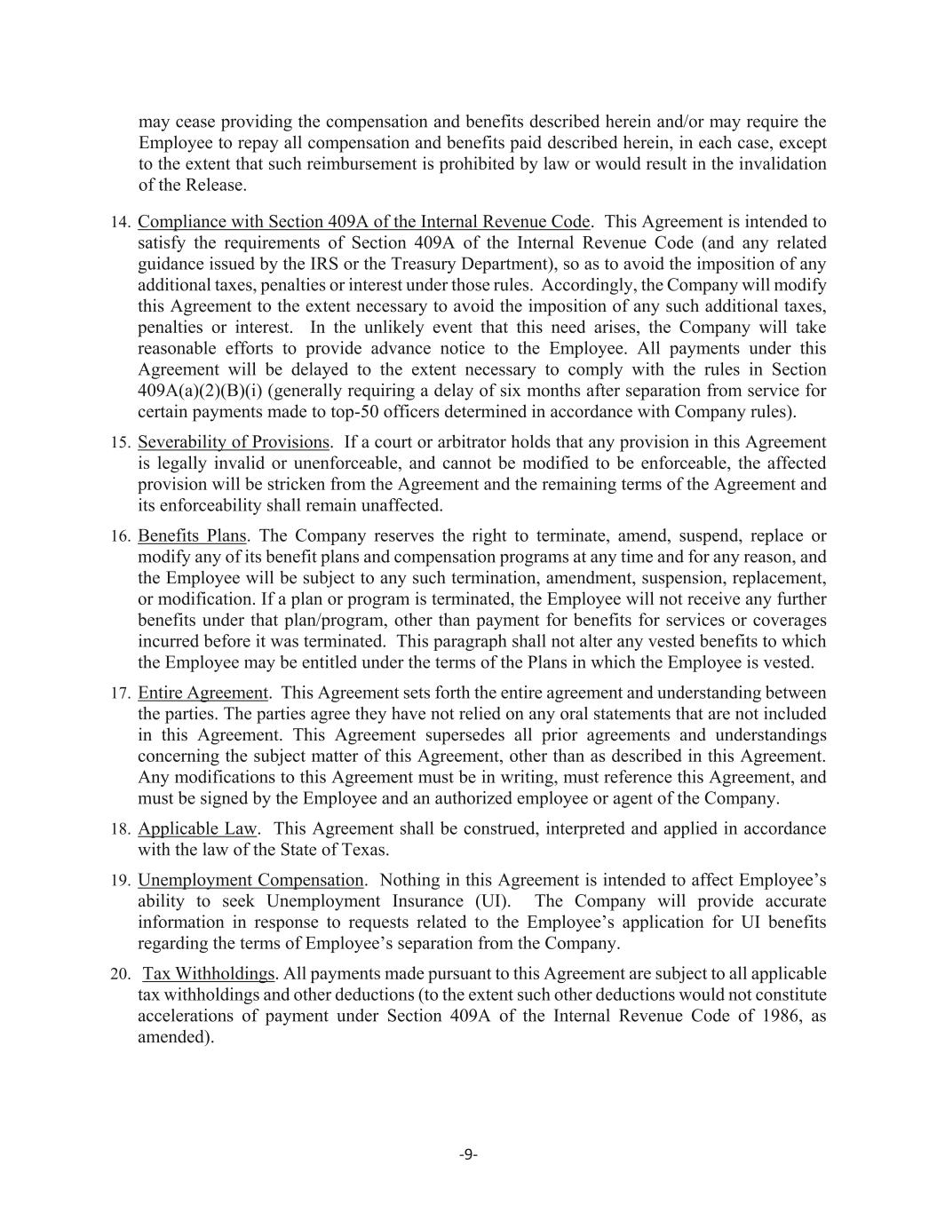 -9- may cease providing the compensation and benefits described herein and/or may require the Employee to repay all compensation and benefits paid described herein, in each case, except to the extent that such reimbursement is prohibited by law or would result in the invalidation of the Release. 14. Compliance with Section 409A of the Internal Revenue Code. This Agreement is intended to satisfy the requirements of Section 409A of the Internal Revenue Code (and any related guidance issued by the IRS or the Treasury Department), so as to avoid the imposition of any additional taxes, penalties or interest under those rules. Accordingly, the Company will modify this Agreement to the extent necessary to avoid the imposition of any such additional taxes, penalties or interest. In the unlikely event that this need arises, the Company will take reasonable efforts to provide advance notice to the Employee. All payments under this Agreement will be delayed to the extent necessary to comply with the rules in Section 409A(a)(2)(B)(i) (generally requiring a delay of six months after separation from service for certain payments made to top-50 officers determined in accordance with Company rules). 15. Severability of Provisions. If a court or arbitrator holds that any provision in this Agreement is legally invalid or unenforceable, and cannot be modified to be enforceable, the affected provision will be stricken from the Agreement and the remaining terms of the Agreement and its enforceability shall remain unaffected. 16. Benefits Plans. The Company reserves the right to terminate, amend, suspend, replace or modify any of its benefit plans and compensation programs at any time and for any reason, and the Employee will be subject to any such termination, amendment, suspension, replacement, or modification. If a plan or program is terminated, the Employee will not receive any further benefits under that plan/program, other than payment for benefits for services or coverages incurred before it was terminated. This paragraph shall not alter any vested benefits to which the Employee may be entitled under the terms of the Plans in which the Employee is vested. 17. Entire Agreement. This Agreement sets forth the entire agreement and understanding between the parties. The parties agree they have not relied on any oral statements that are not included in this Agreement. This Agreement supersedes all prior agreements and understandings concerning the subject matter of this Agreement, other than as described in this Agreement. Any modifications to this Agreement must be in writing, must reference this Agreement, and must be signed by the Employee and an authorized employee or agent of the Company. 18. Applicable Law. This Agreement shall be construed, interpreted and applied in accordance with the law of the State of Texas. 19. Unemployment Compensation. Nothing in this Agreement is intended to affect Employee’s ability to seek Unemployment Insurance (UI). The Company will provide accurate information in response to requests related to the Employee’s application for UI benefits regarding the terms of Employee’s separation from the Company. 20. Tax Withholdings. All payments made pursuant to this Agreement are subject to all applicable tax withholdings and other deductions (to the extent such other deductions would not constitute accelerations of payment under Section 409A of the Internal Revenue Code of 1986, as amended).