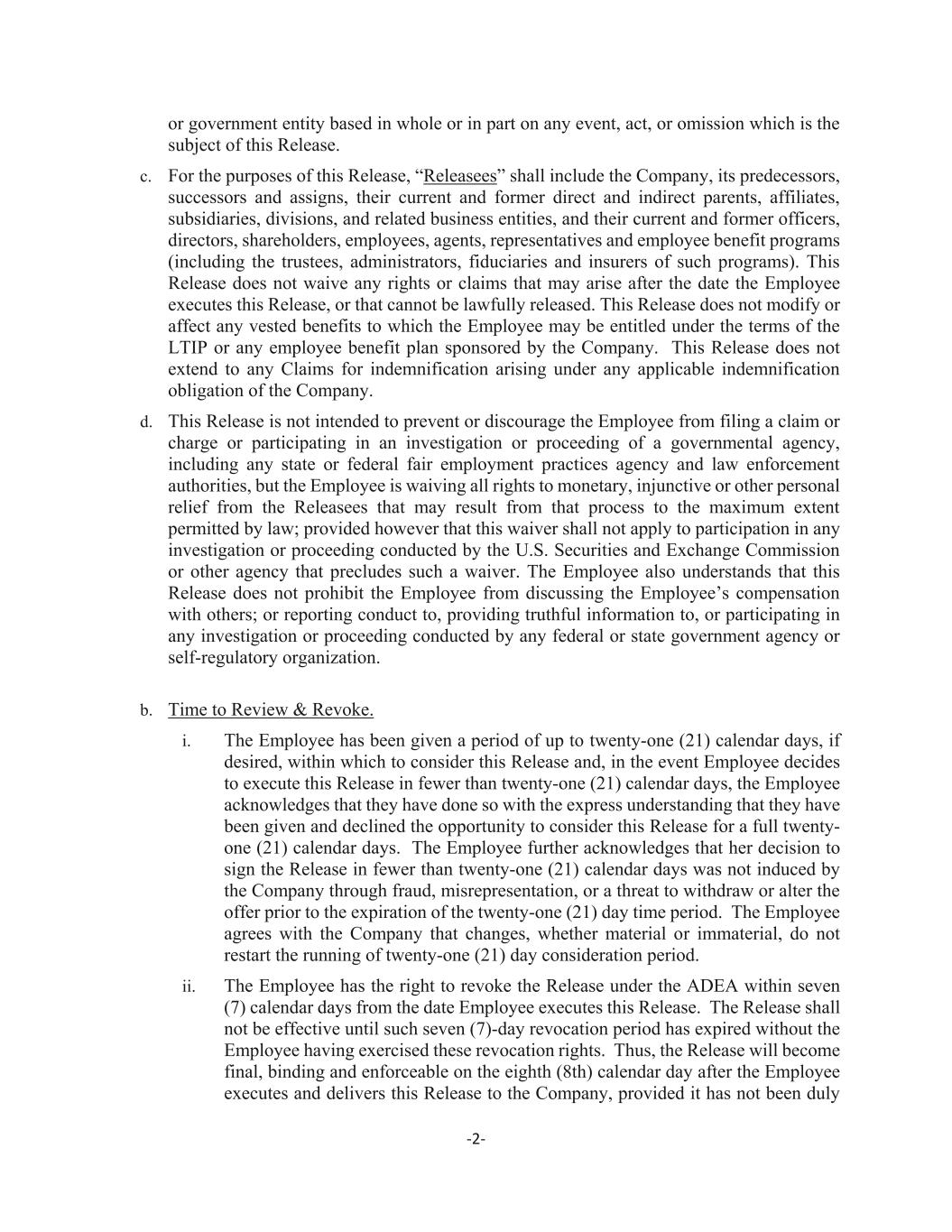 -2- or government entity based in whole or in part on any event, act, or omission which is the subject of this Release. c. For the purposes of this Release, “Releasees” shall include the Company, its predecessors, successors and assigns, their current and former direct and indirect parents, affiliates, subsidiaries, divisions, and related business entities, and their current and former officers, directors, shareholders, employees, agents, representatives and employee benefit programs (including the trustees, administrators, fiduciaries and insurers of such programs). This Release does not waive any rights or claims that may arise after the date the Employee executes this Release, or that cannot be lawfully released. This Release does not modify or affect any vested benefits to which the Employee may be entitled under the terms of the LTIP or any employee benefit plan sponsored by the Company. This Release does not extend to any Claims for indemnification arising under any applicable indemnification obligation of the Company. d. This Release is not intended to prevent or discourage the Employee from filing a claim or charge or participating in an investigation or proceeding of a governmental agency, including any state or federal fair employment practices agency and law enforcement authorities, but the Employee is waiving all rights to monetary, injunctive or other personal relief from the Releasees that may result from that process to the maximum extent permitted by law; provided however that this waiver shall not apply to participation in any investigation or proceeding conducted by the U.S. Securities and Exchange Commission or other agency that precludes such a waiver. The Employee also understands that this Release does not prohibit the Employee from discussing the Employee’s compensation with others; or reporting conduct to, providing truthful information to, or participating in any investigation or proceeding conducted by any federal or state government agency or self-regulatory organization. b. Time to Review & Revoke. i. The Employee has been given a period of up to twenty-one (21) calendar days, if desired, within which to consider this Release and, in the event Employee decides to execute this Release in fewer than twenty-one (21) calendar days, the Employee acknowledges that they have done so with the express understanding that they have been given and declined the opportunity to consider this Release for a full twenty- one (21) calendar days. The Employee further acknowledges that her decision to sign the Release in fewer than twenty-one (21) calendar days was not induced by the Company through fraud, misrepresentation, or a threat to withdraw or alter the offer prior to the expiration of the twenty-one (21) day time period. The Employee agrees with the Company that changes, whether material or immaterial, do not restart the running of twenty-one (21) day consideration period. ii. The Employee has the right to revoke the Release under the ADEA within seven (7) calendar days from the date Employee executes this Release. The Release shall not be effective until such seven (7)-day revocation period has expired without the Employee having exercised these revocation rights. Thus, the Release will become final, binding and enforceable on the eighth (8th) calendar day after the Employee executes and delivers this Release to the Company, provided it has not been duly
