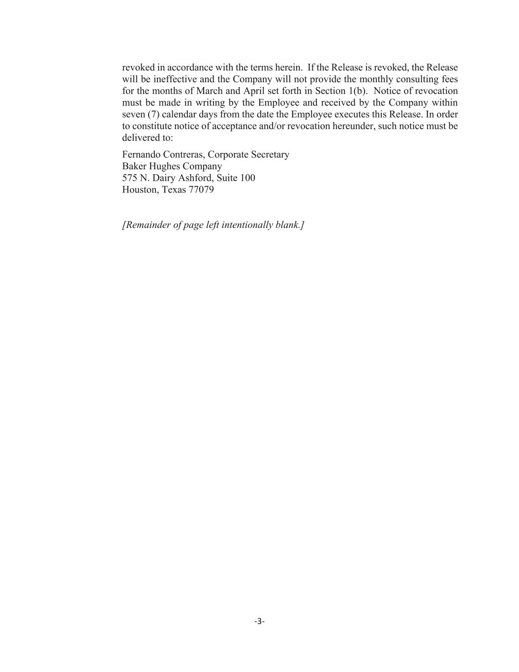 -3- revoked in accordance with the terms herein. If the Release is revoked, the Release will be ineffective and the Company will not provide the monthly consulting fees for the months of March and April set forth in Section 1(b). Notice of revocation must be made in writing by the Employee and received by the Company within seven (7) calendar days from the date the Employee executes this Release. In order to constitute notice of acceptance and/or revocation hereunder, such notice must be delivered to: Fernando Contreras, Corporate Secretary Baker Hughes Company 575 N. Dairy Ashford, Suite 100 Houston, Texas 77079 [Remainder of page left intentionally blank.]