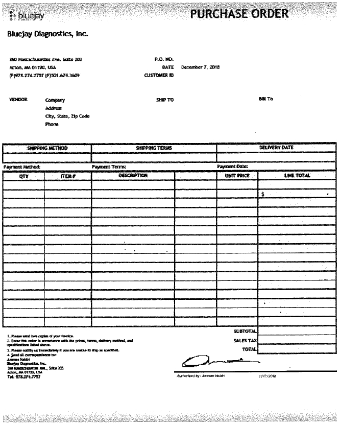 3.3.Purchase Orders. During the Term of this Agreement, Bluejay may issue Purchase Orders containing instructions for specific performance under this Agreement, specifying the Specification number and quantities (and type, if applicable) of the Products desired. Company shall notify Bluejay immediately if the Specification number on the Purchase Order does not match the Specification number of the Product that Company has agreed to produce. Such Purchase Orders shall constitute the only authorization for Company to provide Products to Bluejay, and Bluejay shall accept only that specific performance that has been pre-authorized as evidenced by a Purchase Order. No Purchase Order will be effective unless and until it has been agreed to and signed by authorized representatives of both Parties. Subject to the minimum requirements of this Section, Bluejay may make changes to quantities, and/or delivery dates or delivery locations specified in issued Purchase Orders without penalty, additional cost, or the consent of the Company, provided that such changes are made outside of the Firm Lead-Time (as established in Section 3.2). Company shall reference the Purchase Order number on all packing slips (and/or bills of lading) and invoices (including commercial invoices) for Product(s) delivered hereunder. Any term or condition of any Purchase Order, packing slip, bill of lading, or invoice that is different from or contrary to the terms and conditions of this Agreement shall be void and of no force and effect unless otherwise mutually agreed in writing by the Parties.