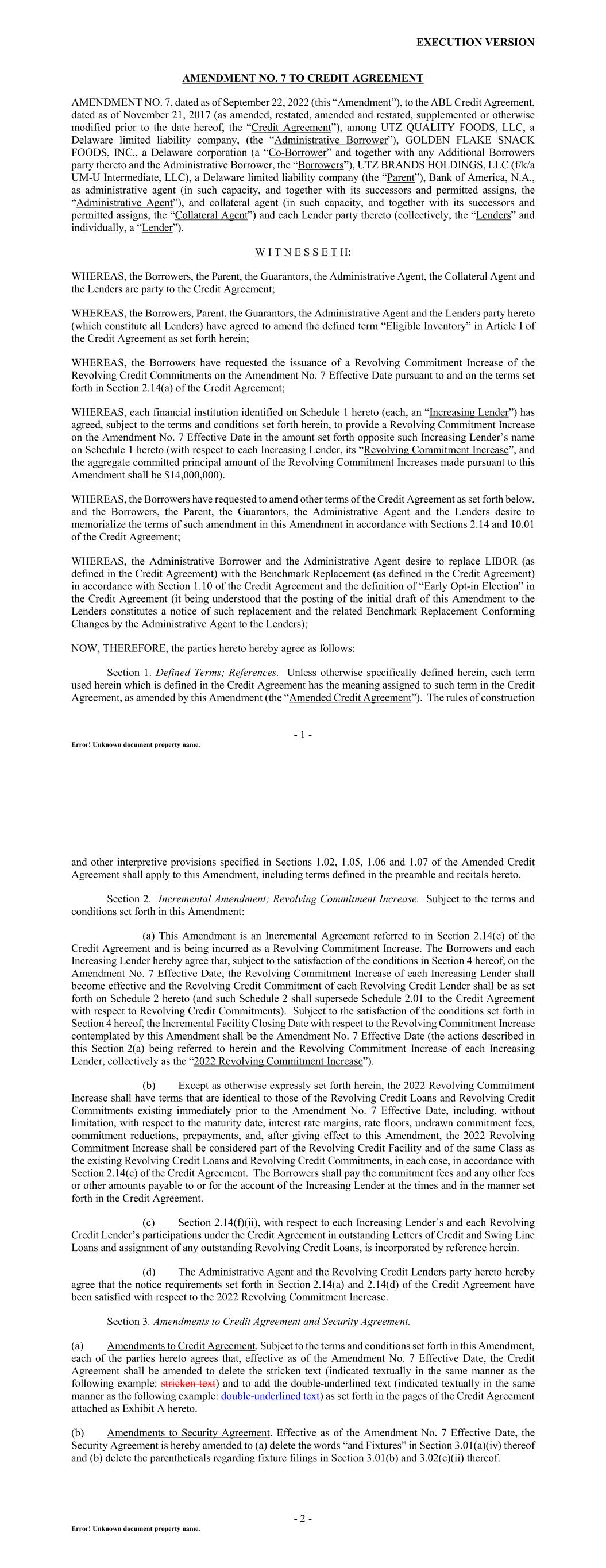 EXECUTION VERSION - 1 - Error! Unknown document property name. AMENDMENT NO. 7 TO CREDIT AGREEMENT AMENDMENT NO. 7, dated as of September 22, 2022 (this “Amendment”), to the ABL Credit Agreement, dated as of November 21, 2017 (as amended, restated, amended and restated, supplemented or otherwise modified prior to the date hereof, the “Credit Agreement”), among UTZ QUALITY FOODS, LLC, a Delaware limited liability company, (the “Administrative Borrower”), GOLDEN FLAKE SNACK FOODS, INC., a Delaware corporation (a “Co-Borrower” and together with any Additional Borrowers party thereto and the Administrative Borrower, the “Borrowers”), UTZ BRANDS HOLDINGS, LLC (f/k/a UM-U Intermediate, LLC), a Delaware limited liability company (the “Parent”), Bank of America, N.A., as administrative agent (in such capacity, and together with its successors and permitted assigns, the “Administrative Agent”), and collateral agent (in such capacity, and together with its successors and permitted assigns, the “Collateral Agent”) and each Lender party thereto (collectively, the “Lenders” and individually, a “Lender”). W I T N E S S E T H: WHEREAS, the Borrowers, the Parent, the Guarantors, the Administrative Agent, the Collateral Agent and the Lenders are party to the Credit Agreement; WHEREAS, the Borrowers, Parent, the Guarantors, the Administrative Agent and the Lenders party hereto (which constitute all Lenders) have agreed to amend the defined term “Eligible Inventory” in Article I of the Credit Agreement as set forth herein; WHEREAS, the Borrowers have requested the issuance of a Revolving Commitment Increase of the Revolving Credit Commitments on the Amendment No. 7 Effective Date pursuant to and on the terms set forth in Section 2.14(a) of the Credit Agreement; WHEREAS, each financial institution identified on Schedule 1 hereto (each, an “Increasing Lender”) has agreed, subject to the terms and conditions set forth herein, to provide a Revolving Commitment Increase on the Amendment No. 7 Effective Date in the amount set forth opposite such Increasing Lender’s name on Schedule 1 hereto (with respect to each Increasing Lender, its “Revolving Commitment Increase”, and the aggregate committed principal amount of the Revolving Commitment Increases made pursuant to this Amendment shall be $14,000,000). WHEREAS, the Borrowers have requested to amend other terms of the Credit Agreement as set forth below, and the Borrowers, the Parent, the Guarantors, the Administrative Agent and the Lenders desire to memorialize the terms of such amendment in this Amendment in accordance with Sections 2.14 and 10.01 of the Credit Agreement; WHEREAS, the Administrative Borrower and the Administrative Agent desire to replace LIBOR (as defined in the Credit Agreement) with the Benchmark Replacement (as defined in the Credit Agreement) in accordance with Section 1.10 of the Credit Agreement and the definition of “Early Opt-in Election” in the Credit Agreement (it being understood that the posting of the initial draft of this Amendment to the Lenders constitutes a notice of such replacement and the related Benchmark Replacement Conforming Changes by the Administrative Agent to the Lenders); NOW, THEREFORE, the parties hereto hereby agree as follows: Section 1. Defined Terms; References. Unless otherwise specifically defined herein, each term used herein which is defined in the Credit Agreement has the meaning assigned to such term in the Credit Agreement, as amended by this Amendment (the “Amended Credit Agreement”). The rules of construction - 2 - Error! Unknown document property name. and other interpretive provisions specified in Sections 1.02, 1.05, 1.06 and 1.07 of the Amended Credit Agreement shall apply to this Amendment, including terms defined in the preamble and recitals hereto. Section 2. Incremental Amendment; Revolving Commitment Increase. Subject to the terms and conditions set forth in this Amendment: (a) This Amendment is an Incremental Agreement referred to in Section 2.14(e) of the Credit Agreement and is being incurred as a Revolving Commitment Increase. The Borrowers and each Increasing Lender hereby agree that, subject to the satisfaction of the conditions in Section 4 hereof, on the Amendment No. 7 Effective Date, the Revolving Commitment Increase of each Increasing Lender shall become effective and the Revolving Credit Commitment of each Revolving Credit Lender shall be as set forth on Schedule 2 hereto (and such Schedule 2 shall supersede Schedule 2.01 to the Credit Agreement with respect to Revolving Credit Commitments). Subject to the satisfaction of the conditions set forth in Section 4 hereof, the Incremental Facility Closing Date with respect to the Revolving Commitment Increase contemplated by this Amendment shall be the Amendment No. 7 Effective Date (the actions described in this Section 2(a) being referred to herein and the Revolving Commitment Increase of each Increasing Lender, collectively as the “2022 Revolving Commitment Increase”). (b) Except as otherwise expressly set forth herein, the 2022 Revolving Commitment Increase shall have terms that are identical to those of the Revolving Credit Loans and Revolving Credit Commitments existing immediately prior to the Amendment No. 7 Effective Date, including, without limitation, with respect to the maturity date, interest rate margins, rate floors, undrawn commitment fees, commitment reductions, prepayments, and, after giving effect to this Amendment, the 2022 Revolving Commitment Increase shall be considered part of the Revolving Credit Facility and of the same Class as the existing Revolving Credit Loans and Revolving Credit Commitments, in each case, in accordance with Section 2.14(c) of the Credit Agreement. The Borrowers shall pay the commitment fees and any other fees or other amounts payable to or for the account of the Increasing Lender at the times and in the manner set forth in 