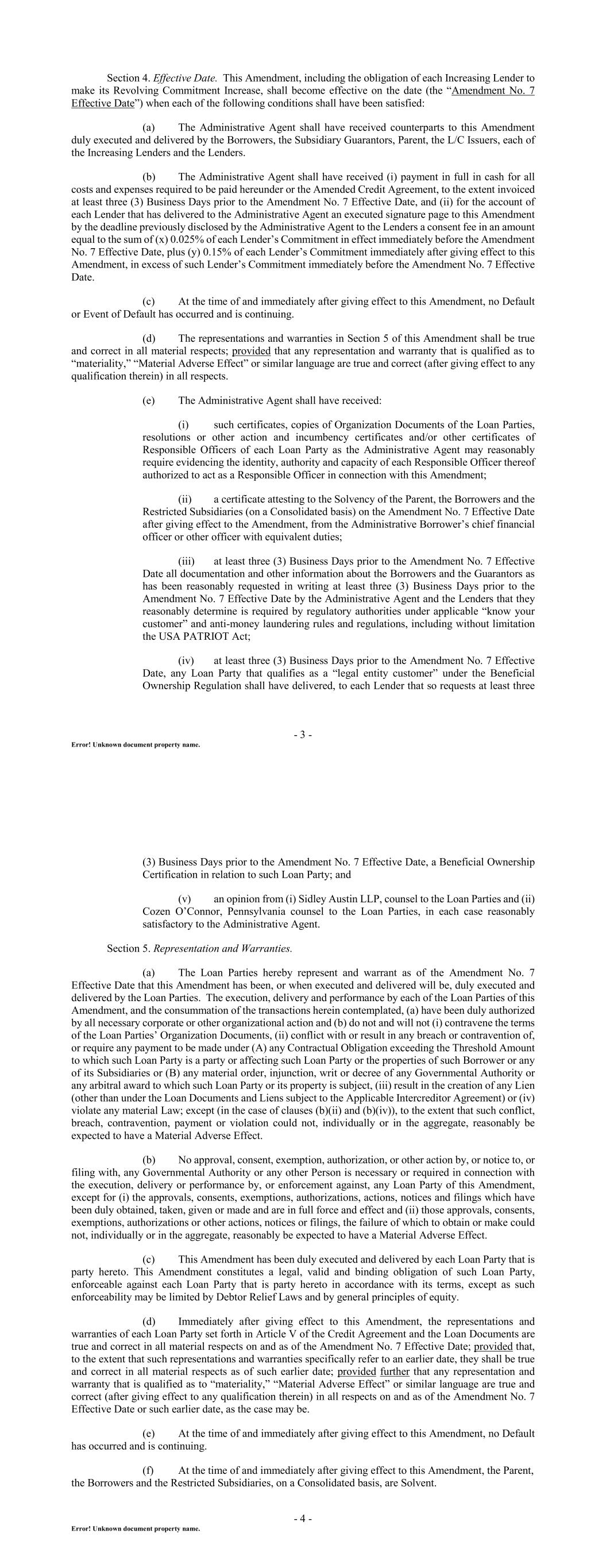 - 3 - Error! Unknown document property name. Section 4. Effective Date. This Amendment, including the obligation of each Increasing Lender to make its Revolving Commitment Increase, shall become effective on the date (the “Amendment No. 7 Effective Date”) when each of the following conditions shall have been satisfied: (a) The Administrative Agent shall have received counterparts to this Amendment duly executed and delivered by the Borrowers, the Subsidiary Guarantors, Parent, the L/C Issuers, each of the Increasing Lenders and the Lenders. (b) The Administrative Agent shall have received (i) payment in full in cash for all costs and expenses required to be paid hereunder or the Amended Credit Agreement, to the extent invoiced at least three (3) Business Days prior to the Amendment No. 7 Effective Date, and (ii) for the account of each Lender that has delivered to the Administrative Agent an executed signature page to this Amendment by the deadline previously disclosed by the Administrative Agent to the Lenders a consent fee in an amount equal to the sum of (x) 0.025% of each Lender’s Commitment in effect immediately before the Amendment No. 7 Effective Date, plus (y) 0.15% of each Lender’s Commitment immediately after giving effect to this Amendment, in excess of such Lender’s Commitment immediately before the Amendment No. 7 Effective Date. (c) At the time of and immediately after giving effect to this Amendment, no Default or Event of Default has occurred and is continuing. (d) The representations and warranties in Section 5 of this Amendment shall be true and correct in all material respects; provided that any representation and warranty that is qualified as to “materiality,” “Material Adverse Effect” or similar language are true and correct (after giving effect to any qualification therein) in all respects. (e) The Administrative Agent shall have received: (i) such certificates, copies of Organization Documents of the Loan Parties, resolutions or other action and incumbency certificates and/or other certificates of Responsible Officers of each Loan Party as the Administrative Agent may reasonably require evidencing the identity, authority and capacity of each Responsible Officer thereof authorized to act as a Responsible Officer in connection with this Amendment; (ii) a certificate attesting to the Solvency of the Parent, the Borrowers and the Restricted Subsidiaries (on a Consolidated basis) on the Amendment No. 7 Effective Date after giving effect to the Amendment, from the Administrative Borrower’s chief financial officer or other officer with equivalent duties; (iii) at least three (3) Business Days prior to the Amendment No. 7 Effective Date all documentation and other information about the Borrowers and the Guarantors as has been reasonably requested in writing at least three (3) Business Days prior to the Amendment No. 7 Effective Date by the Administrative Agent and the Lenders that they reasonably determine is required by regulatory authorities under applicable “know your customer” and anti-money laundering rules and regulations, including without limitation the USA PATRIOT Act; (iv) at least three (3) Business Days prior to the Amendment No. 7 Effective Date, any Loan Party that qualifies as a “legal entity customer” under the Beneficial Ownership Regulation shall have delivered, to each Lender that so requests at least three - 4 - Error! Unknown document property name. (3) Business Days prior to the Amendment No. 7 Effective Date, a Beneficial Ownership Certification in relation to such Loan Party; and (v) an opinion from (i) Sidley Austin LLP, counsel to the Loan Parties and (ii) Cozen O’Connor, Pennsylvania counsel to the Loan Parties, in each case reasonably satisfactory to the Administrative Agent. Section 5. Representation and Warranties. (a) The Loan Parties hereby represent and warrant as of the Amendment No. 7 Effective Date that this Amendment has been, or when executed and delivered will be, duly executed and delivered by the Loan Parties. The execution, delivery and performance by each of the Loan Parties of this Amendment, and the consummation of the transactions herein contemplated, (a) have been duly authorized by all necessary corporate or other organizational action and (b) do not and will not (i) contravene the terms of the Loan Parties’ Organization Documents, (ii) conflict with or result in any breach or contravention of, or require any payment to be made under (A) any Contractual Obligation exceeding the Threshold Amount to which such Loan Party is a party or affecting such Loan Party or the properties of such Borrower or any of its Subsidiaries or (B) any material order, injunction, writ or decree of any Governmental Authority or any arbitral award to which such Loan Party or its property is subject, (iii) result in the creation of any Lien (other than under the Loan Documents and Liens subject to the Applicable Intercreditor Agreement) or (iv) violate any material Law; except (in the case of clauses (b)(ii) and (b)(iv)), to the extent that such conflict, breach, contravention, payment or violation could not, individually or in the aggregate, reasonably be expected to have a Material Adverse Effect. (b) No approval, consent, exemption, authorization, or other action by, or notice to, or filing with, any Governmental Authority or any other Person is necessary or required in connection with the execution, delivery or performance by, or enforcement against, any Loan Party of this Amendment, except for (i) the approvals, consents, exemptions, authorizations, actions, notices and filings which have been duly obtained, taken, given or made and are in full force and effect and (ii) those approvals, consents, exemptions, authorizations or other actions, notices or filings, the failure of which to obtain or make could not, individually or in the aggregate, reasonably be expected to have a Material Adverse Effect. (c) This Amendm