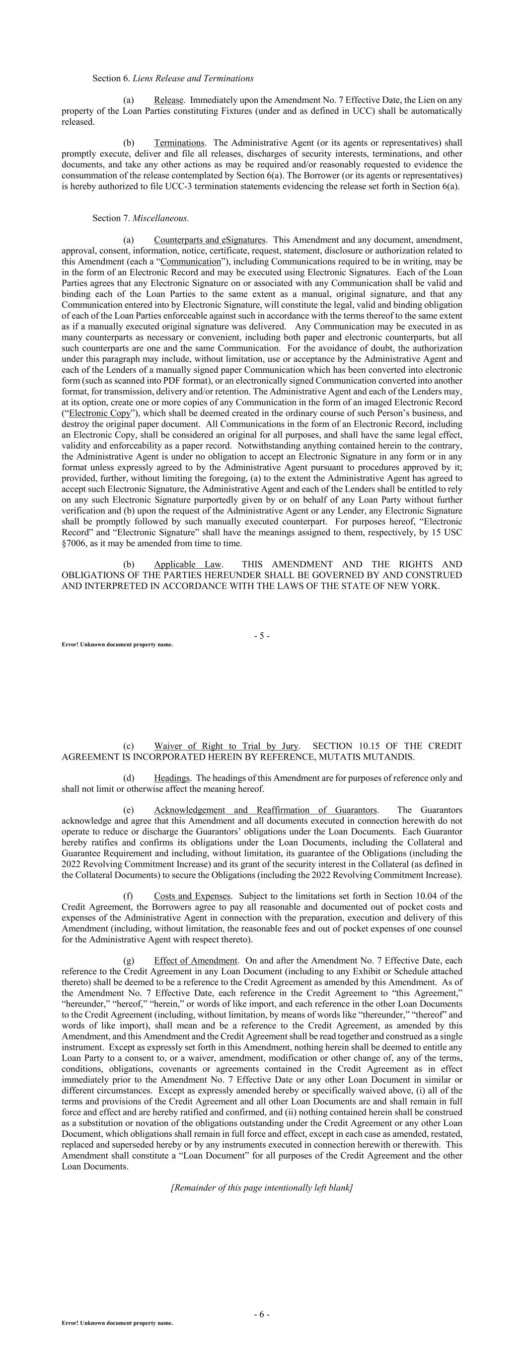 - 5 - Error! Unknown document property name. Section 6. Liens Release and Terminations (a) Release. Immediately upon the Amendment No. 7 Effective Date, the Lien on any property of the Loan Parties constituting Fixtures (under and as defined in UCC) shall be automatically released. (b) Terminations. The Administrative Agent (or its agents or representatives) shall promptly execute, deliver and file all releases, discharges of security interests, terminations, and other documents, and take any other actions as may be required and/or reasonably requested to evidence the consummation of the release contemplated by Section 6(a). The Borrower (or its agents or representatives) is hereby authorized to file UCC-3 termination statements evidencing the release set forth in Section 6(a). Section 7. Miscellaneous. (a) Counterparts and eSignatures. This Amendment and any document, amendment, approval, consent, information, notice, certificate, request, statement, disclosure or authorization related to this Amendment (each a “Communication”), including Communications required to be in writing, may be in the form of an Electronic Record and may be executed using Electronic Signatures. Each of the Loan Parties agrees that any Electronic Signature on or associated with any Communication shall be valid and binding each of the Loan Parties to the same extent as a manual, original signature, and that any Communication entered into by Electronic Signature, will constitute the legal, valid and binding obligation of each of the Loan Parties enforceable against such in accordance with the terms thereof to the same extent as if a manually executed original signature was delivered. Any Communication may be executed in as many counterparts as necessary or convenient, including both paper and electronic counterparts, but all such counterparts are one and the same Communication. For the avoidance of doubt, the authorization under this paragraph may include, without limitation, use or acceptance by the Administrative Agent and each of the Lenders of a manually signed paper Communication which has been converted into electronic form (such as scanned into PDF format), or an electronically signed Communication converted into another format, for transmission, delivery and/or retention. The Administrative Agent and each of the Lenders may, at its option, create one or more copies of any Communication in the form of an imaged Electronic Record (“Electronic Copy”), which shall be deemed created in the ordinary course of such Person’s business, and destroy the original paper document. All Communications in the form of an Electronic Record, including an Electronic Copy, shall be considered an original for all purposes, and shall have the same legal effect, validity and enforceability as a paper record. Notwithstanding anything contained herein to the contrary, the Administrative Agent is under no obligation to accept an Electronic Signature in any form or in any format unless expressly agreed to by the Administrative Agent pursuant to procedures approved by it; provided, further, without limiting the foregoing, (a) to the extent the Administrative Agent has agreed to accept such Electronic Signature, the Administrative Agent and each of the Lenders shall be entitled to rely on any such Electronic Signature purportedly given by or on behalf of any Loan Party without further verification and (b) upon the request of the Administrative Agent or any Lender, any Electronic Signature shall be promptly followed by such manually executed counterpart. For purposes hereof, “Electronic Record” and “Electronic Signature” shall have the meanings assigned to them, respectively, by 15 USC §7006, as it may be amended from time to time. (b) Applicable Law. THIS AMENDMENT AND THE RIGHTS AND OBLIGATIONS OF THE PARTIES HEREUNDER SHALL BE GOVERNED BY AND CONSTRUED AND INTERPRETED IN ACCORDANCE WITH THE LAWS OF THE STATE OF NEW YORK. - 6 - Error! Unknown document property name. (c) Waiver of Right to Trial by Jury. SECTION 10.15 OF THE CREDIT AGREEMENT IS INCORPORATED HEREIN BY REFERENCE, MUTATIS MUTANDIS. (d) Headings. The headings of this Amendment are for purposes of reference only and shall not limit or otherwise affect the meaning hereof. (e) Acknowledgement and Reaffirmation of Guarantors. The Guarantors acknowledge and agree that this Amendment and all documents executed in connection herewith do not operate to reduce or discharge the Guarantors’ obligations under the Loan Documents. Each Guarantor hereby ratifies and confirms its obligations under the Loan Documents, including the Collateral and Guarantee Requirement and including, without limitation, its guarantee of the Obligations (including the 2022 Revolving Commitment Increase) and its grant of the security interest in the Collateral (as defined in the Collateral Documents) to secure the Obligations (including the 2022 Revolving Commitment Increase). (f) Costs and Expenses. Subject to the limitations set forth in Section 10.04 of the Credit Agreement, the Borrowers agree to pay all reasonable and documented out of pocket costs and expenses of the Administrative Agent in connection with the preparation, execution and delivery of this Amendment (including, without limitation, the reasonable fees and out of pocket expenses of one counsel for the Administrative Agent with respect thereto). (g) Effect of Amendment. On and after the Amendment No. 7 Effective Date, each reference to the Credit Agreement in any Loan Document (including to any Exhibit or Schedule attached thereto) shall be deemed to be a reference to the Credit Agreement as amended by this Amendment. As of the Amendment No. 7 Effective Date, each reference in the Credit Agreement to “this Agreement,” “hereunder,” “hereof,” “herein,” or words of like import, and each reference in the other Loan Documents to the Credit Agreement (including, without limitation, by means of words like “there