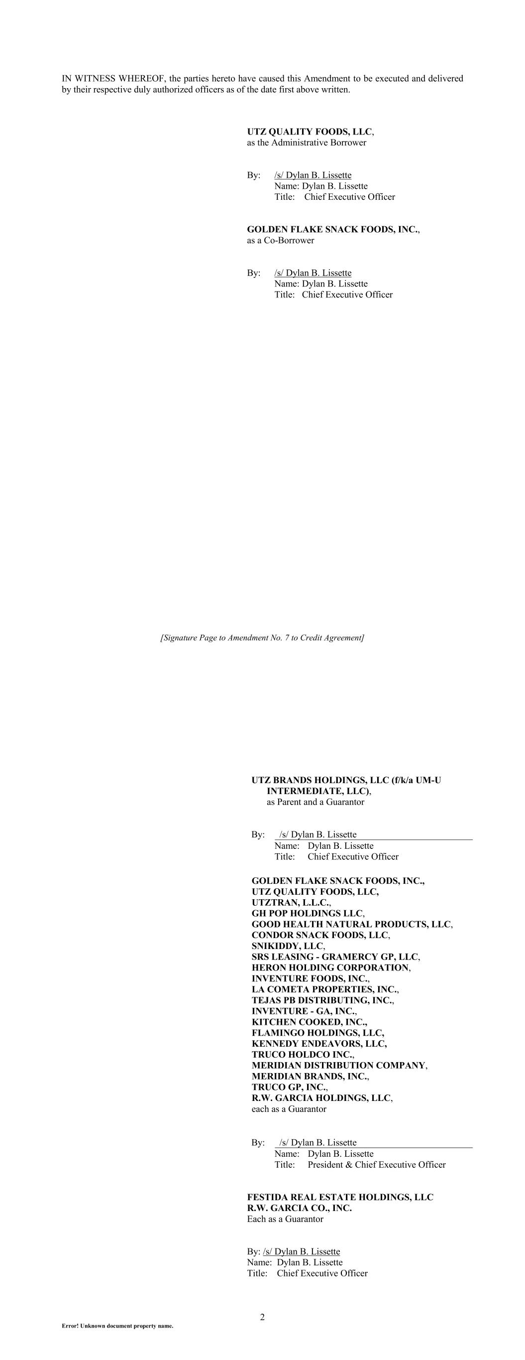 [Signature Page to Amendment No. 7 to Credit Agreement] IN WITNESS WHEREOF, the parties hereto have caused this Amendment to be executed and delivered by their respective duly authorized officers as of the date first above written. UTZ QUALITY FOODS, LLC, as the Administrative Borrower By: /s/ Dylan B. Lissette Name: Dylan B. Lissette Title: Chief Executive Officer GOLDEN FLAKE SNACK FOODS, INC., as a Co-Borrower By: /s/ Dylan B. Lissette Name: Dylan B. Lissette Title: Chief Executive Officer 2 Error! Unknown document property name. UTZ BRANDS HOLDINGS, LLC (f/k/a UM-U INTERMEDIATE, LLC), as Parent and a Guarantor By: /s/ Dylan B. Lissette Name: Dylan B. Lissette Title: Chief Executive Officer GOLDEN FLAKE SNACK FOODS, INC., UTZ QUALITY FOODS, LLC, UTZTRAN, L.L.C., GH POP HOLDINGS LLC, GOOD HEALTH NATURAL PRODUCTS, LLC, CONDOR SNACK FOODS, LLC, SNIKIDDY, LLC, SRS LEASING - GRAMERCY GP, LLC, HERON HOLDING CORPORATION, INVENTURE FOODS, INC., LA COMETA PROPERTIES, INC., TEJAS PB DISTRIBUTING, INC., INVENTURE - GA, INC., KITCHEN COOKED, INC., FLAMINGO HOLDINGS, LLC, KENNEDY ENDEAVORS, LLC, TRUCO HOLDCO INC., MERIDIAN DISTRIBUTION COMPANY, MERIDIAN BRANDS, INC., TRUCO GP, INC., R.W. GARCIA HOLDINGS, LLC, each as a Guarantor By: /s/ Dylan B. Lissette Name: Dylan B. Lissette Title: President & Chief Executive Officer FESTIDA REAL ESTATE HOLDINGS, LLC R.W. GARCIA CO., INC. Each as a Guarantor By: /s/ Dylan B. Lissette Name: Dylan B. Lissette Title: Chief Executive Officer