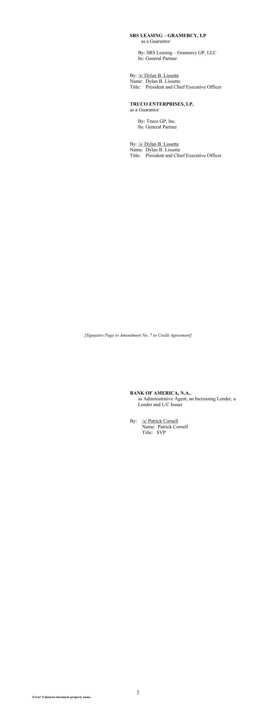 [Signature Page to Amendment No. 7 to Credit Agreement] SRS LEASING – GRAMERCY, LP as a Guarantor By: SRS Leasing – Gramercy GP, LLC Its: General Partner By: /s/ Dylan B. Lissette Name: Dylan B. Lissette Title: President and Chief Executive Officer TRUCO ENTERPRISES, LP, as a Guarantor By: Truco GP, Inc. Its: General Partner By: /s/ Dylan B. Lissette Name: Dylan B. Lissette Title: President and Chief Executive Officer 2 Error! Unknown document property name. BANK OF AMERICA, N.A., as Administrative Agent, an Increasing Lender, a Lender and L/C Issuer By: /s/ Patrick Cornell Name: Patrick Cornell Title: SVP
