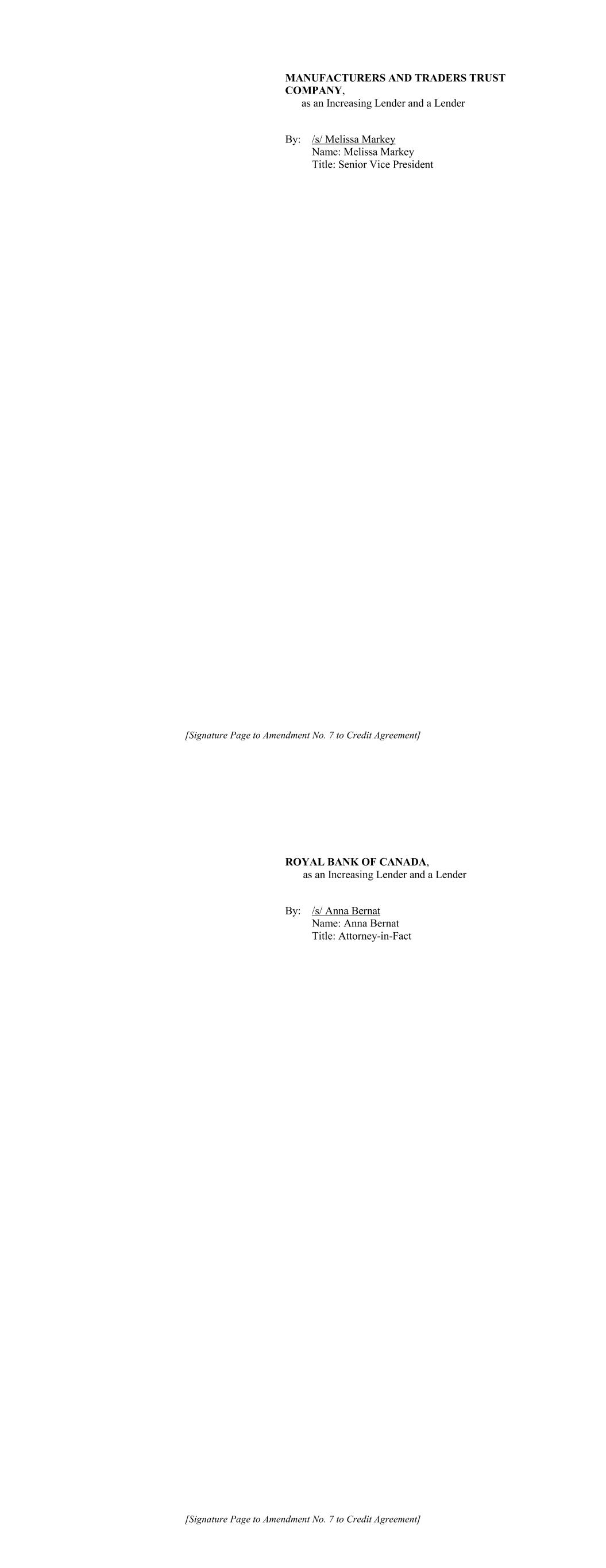 [Signature Page to Amendment No. 7 to Credit Agreement] MANUFACTURERS AND TRADERS TRUST COMPANY, as an Increasing Lender and a Lender By: /s/ Melissa Markey Name: Melissa Markey Title: Senior Vice President [Signature Page to Amendment No. 7 to Credit Agreement] ROYAL BANK OF CANADA, as an Increasing Lender and a Lender By: /s/ Anna Bernat Name: Anna Bernat Title: Attorney-in-Fact
