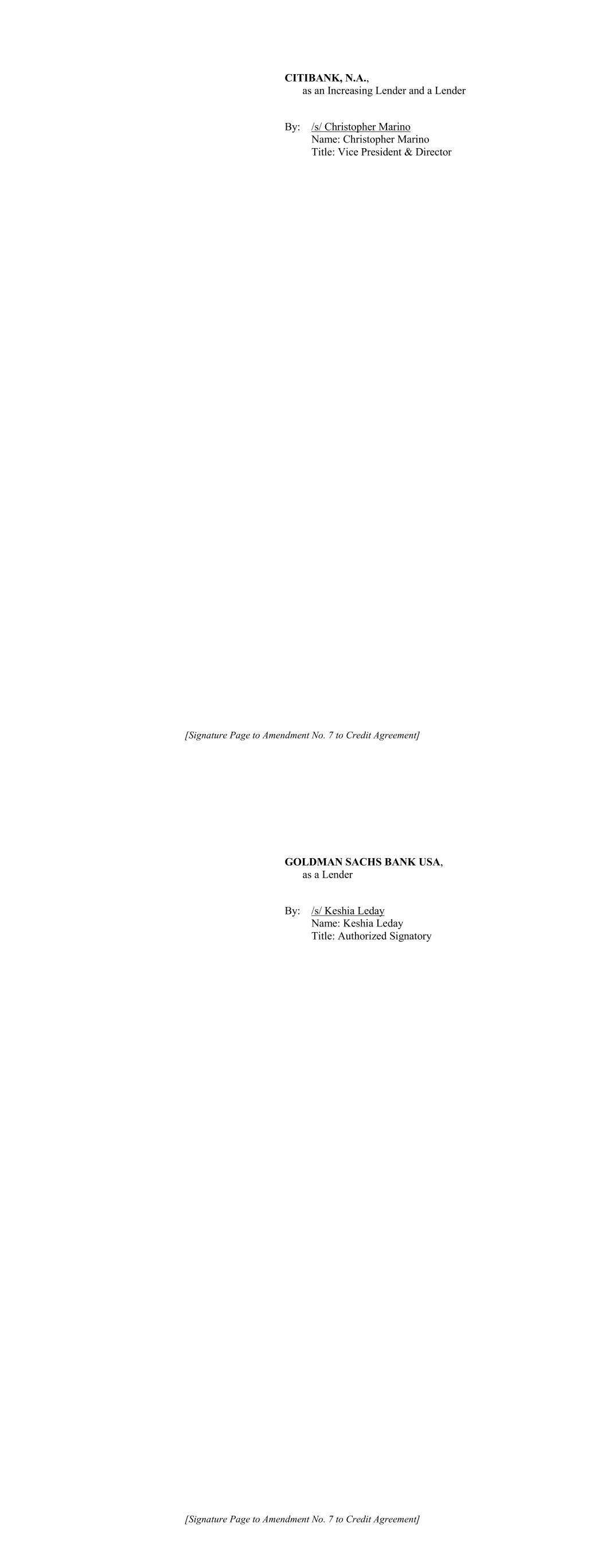 [Signature Page to Amendment No. 7 to Credit Agreement] CITIBANK, N.A., as an Increasing Lender and a Lender By: /s/ Christopher Marino Name: Christopher Marino Title: Vice President & Director [Signature Page to Amendment No. 7 to Credit Agreement] GOLDMAN SACHS BANK USA, as a Lender By: /s/ Keshia Leday Name: Keshia Leday Title: Authorized Signatory