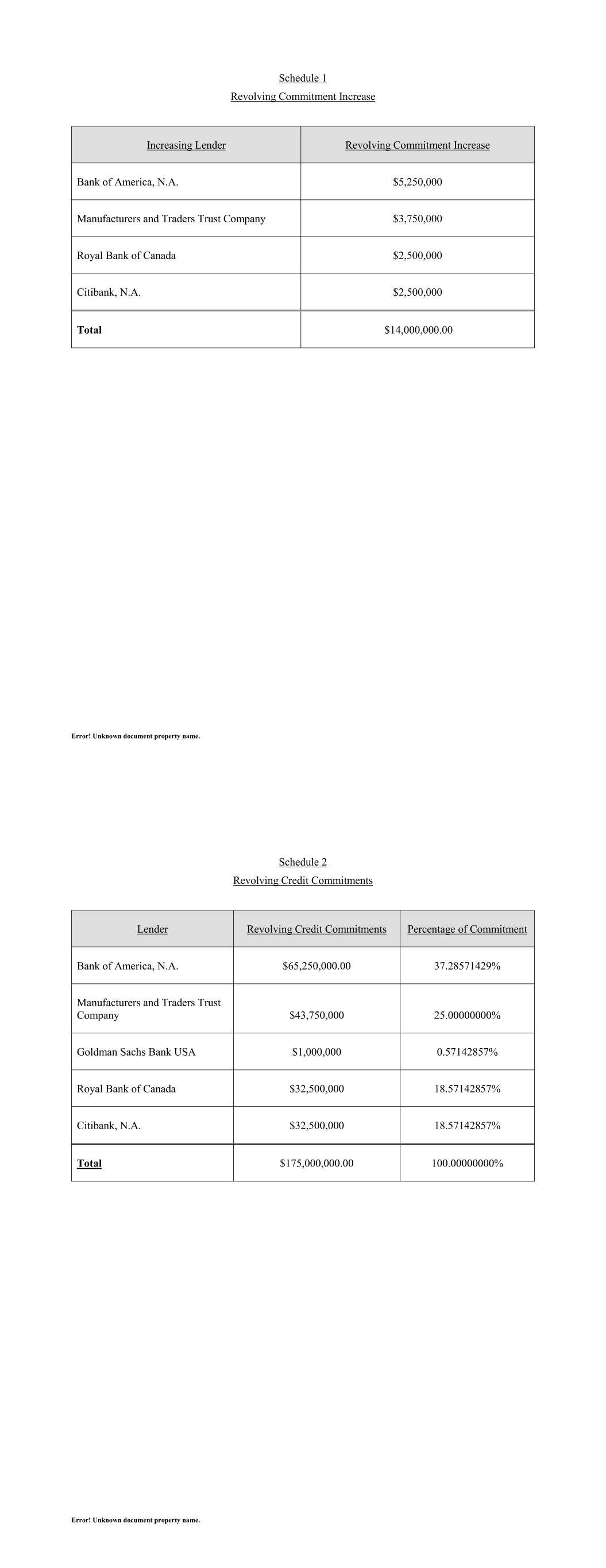 Error! Unknown document property name. Schedule 1 Revolving Commitment Increase Increasing Lender Revolving Commitment Increase Bank of America, N.A. $5,250,000 Manufacturers and Traders Trust Company $3,750,000 Royal Bank of Canada $2,500,000 Citibank, N.A. $2,500,000 Total $14,000,000.00 Error! Unknown document property name. Schedule 2 Revolving Credit Commitments Lender Revolving Credit Commitments Percentage of Commitment Bank of America, N.A. $65,250,000.00 37.28571429% Manufacturers and Traders Trust Company $43,750,000 25.00000000% Goldman Sachs Bank USA $1,000,000 0.57142857% Royal Bank of Canada $32,500,000 18.57142857% Citibank, N.A. $32,500,000 18.57142857% Total $175,000,000.00 100.00000000%