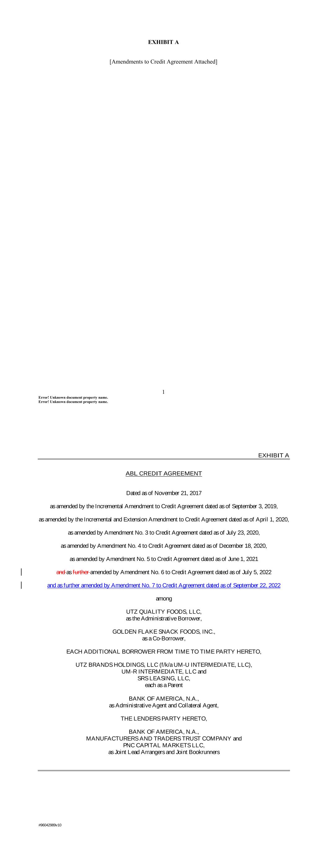 1 Error! Unknown document property name. Error! Unknown document property name. EXHIBIT A [Amendments to Credit Agreement Attached] EXHIBIT A ABL CREDIT AGREEMENT Dated as of November 21, 2017 as amended by the Incremental Amendment to Credit Agreement dated as of September 3, 2019, as amended by the Incremental and Extension Amendment to Credit Agreement dated as of April 1, 2020, as amended by Amendment No. 3 to Credit Agreement dated as of July 23, 2020, as amended by Amendment No. 4 to Credit Agreement dated as of December 18, 2020, as amended by Amendment No. 5 to Credit Agreement dated as of June 1, 2021 and as further amended by Amendment No. 6 to Credit Agreement dated as of July 5, 2022 and as further amended by Amendment No. 7 to Credit Agreement dated as of September 22, 2022 among UTZ QUALITY FOODS, LLC, as the Administrative Borrower, GOLDEN FLAKE SNACK FOODS, INC., as a Co-Borrower, EACH ADDITIONAL BORROWER FROM TIME TO TIME PARTY HERETO, UTZ BRANDS HOLDINGS, LLC (f/k/a UM-U INTERMEDIATE, LLC), UM-R INTERMEDIATE, LLC and SRS LEASING, LLC, each as a Parent BANK OF AMERICA, N.A., as Administrative Agent and Collateral Agent, THE LENDERS PARTY HERETO, BANK OF AMERICA, N.A., MANUFACTURERS AND TRADERS TRUST COMPANY and PNC CAPITAL MARKETS LLC, as Joint Lead Arrangers and Joint Bookrunners #96042989v10
