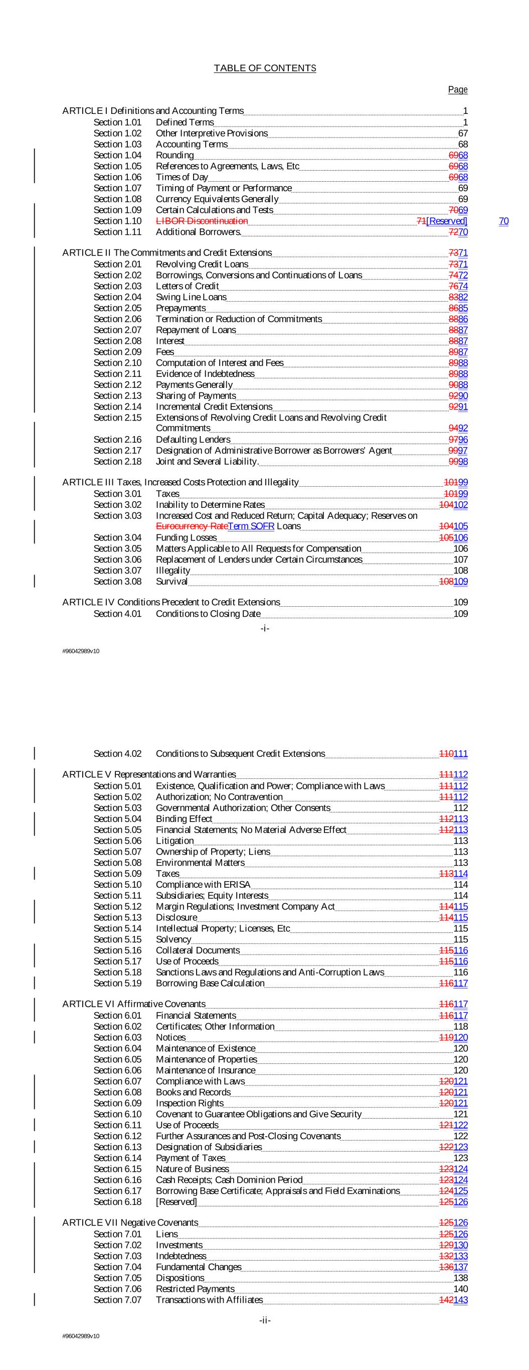 TABLE OF CONTENTS Page ARTICLE I Definitions and Accounting Terms 1 Section 1.01 Defined Terms 1 Section 1.02 Other Interpretive Provisions 67 Section 1.03 Accounting Terms 68 Section 1.04 Rounding 6968 Section 1.05 References to Agreements, Laws, Etc 6968 Section 1.06 Times of Day 6968 Section 1.07 Timing of Payment or Performance 69 Section 1.08 Currency Equivalents Generally 69 Section 1.09 Certain Calculations and Tests 7069 Section 1.10 LIBOR Discontinuation 71[Reserved] 70 Section 1.11 Additional Borrowers. 7270 ARTICLE II The Commitments and Credit Extensions 7371 Section 2.01 Revolving Credit Loans 7371 Section 2.02 Borrowings, Conversions and Continuations of Loans 7472 Section 2.03 Letters of Credit 7674 Section 2.04 Swing Line Loans 8382 Section 2.05 Prepayments 8685 Section 2.06 Termination or Reduction of Commitments 8886 Section 2.07 Repayment of Loans 8887 Section 2.08 Interest 8887 Section 2.09 Fees 8987 Section 2.10 Computation of Interest and Fees 8988 Section 2.11 Evidence of Indebtedness 8988 Section 2.12 Payments Generally 9088 Section 2.13 Sharing of Payments 9290 Section 2.14 Incremental Credit Extensions 9291 Section 2.15 Extensions of Revolving Credit Loans and Revolving Credit Commitments 9492 Section 2.16 Defaulting Lenders 9796 Section 2.17 Designation of Administrative Borrower as Borrowers’ Agent 9997 Section 2.18 Joint and Several Liability. 9998 ARTICLE III Taxes, Increased Costs Protection and Illegality 10199 Section 3.01 Taxes 10199 Section 3.02 Inability to Determine Rates 104102 Section 3.03 Increased Cost and Reduced Return; Capital Adequacy; Reserves on Eurocurrency RateTerm SOFR Loans 104105 Section 3.04 Funding Losses 105106 Section 3.05 Matters Applicable to All Requests for Compensation 106 Section 3.06 Replacement of Lenders under Certain Circumstances 107 Section 3.07 Illegality 108 Section 3.08 Survival 108109 ARTICLE IV Conditions Precedent to Credit Extensions 109 Section 4.01 Conditions to Closing Date 109 -i- #96042989v10 Section 4.02 Conditions to Subsequent Credit Extensions 110111 ARTICLE V Representations and Warranties 111112 Section 5.01 Existence, Qualification and Power; Compliance with Laws 111112 Section 5.02 Authorization; No Contravention 111112 Section 5.03 Governmental Authorization; Other Consents 112 Section 5.04 Binding Effect 112113 Section 5.05 Financial Statements; No Material Adverse Effect 112113 Section 5.06 Litigation 113 Section 5.07 Ownership of Property; Liens 113 Section 5.08 Environmental Matters 113 Section 5.09 Taxes 113114 Section 5.10 Compliance with ERISA 114 Section 5.11 Subsidiaries; Equity Interests 114 Section 5.12 Margin Regulations; Investment Company Act 114115 Section 5.13 Disclosure 114115 Section 5.14 Intellectual Property; Licenses, Etc 115 Section 5.15 Solvency 115 Section 5.16 Collateral Documents 115116 Section 5.17 Use of Proceeds 115116 Section 5.18 Sanctions Laws and Regulations and Anti-Corruption Laws 116 Section 5.19 Borrowing Base Calculation 116117 ARTICLE VI Affirmative Covenants 116117 Section 6.01 Financial Statements 116117 Section 6.02 Certificates; Other Information 118 Section 6.03 Notices 119120 Section 6.04 Maintenance of Existence 120 Section 6.05 Maintenance of Properties 120 Section 6.06 Maintenance of Insurance 120 Section 6.07 Compliance with Laws 120121 Section 6.08 Books and Records 120121 Section 6.09 Inspection Rights 120121 Section 6.10 Covenant to Guarantee Obligations and Give Security 121 Section 6.11 Use of Proceeds 121122 Section 6.12 Further Assurances and Post-Closing Covenants 122 Section 6.13 Designation of Subsidiaries 122123 Section 6.14 Payment of Taxes 123 Section 6.15 Nature of Business 123124 Section 6.16 Cash Receipts; Cash Dominion Period 123124 Section 6.17 Borrowing Base Certificate; Appraisals and Field Examinations 124125 Section 6.18 [Reserved] 125126 ARTICLE VII Negative Covenants 125126 Section 7.01 Liens 125126 Section 7.02 Investments 129130 Section 7.03 Indebtedness 132133 Section 7.04 Fundamental Changes 136137 Section 7.05 Dispositions 138 Section 7.06 Restricted Payments 140 Section 7.07 Transactions with Affiliates 142143 -ii- #96042989v10