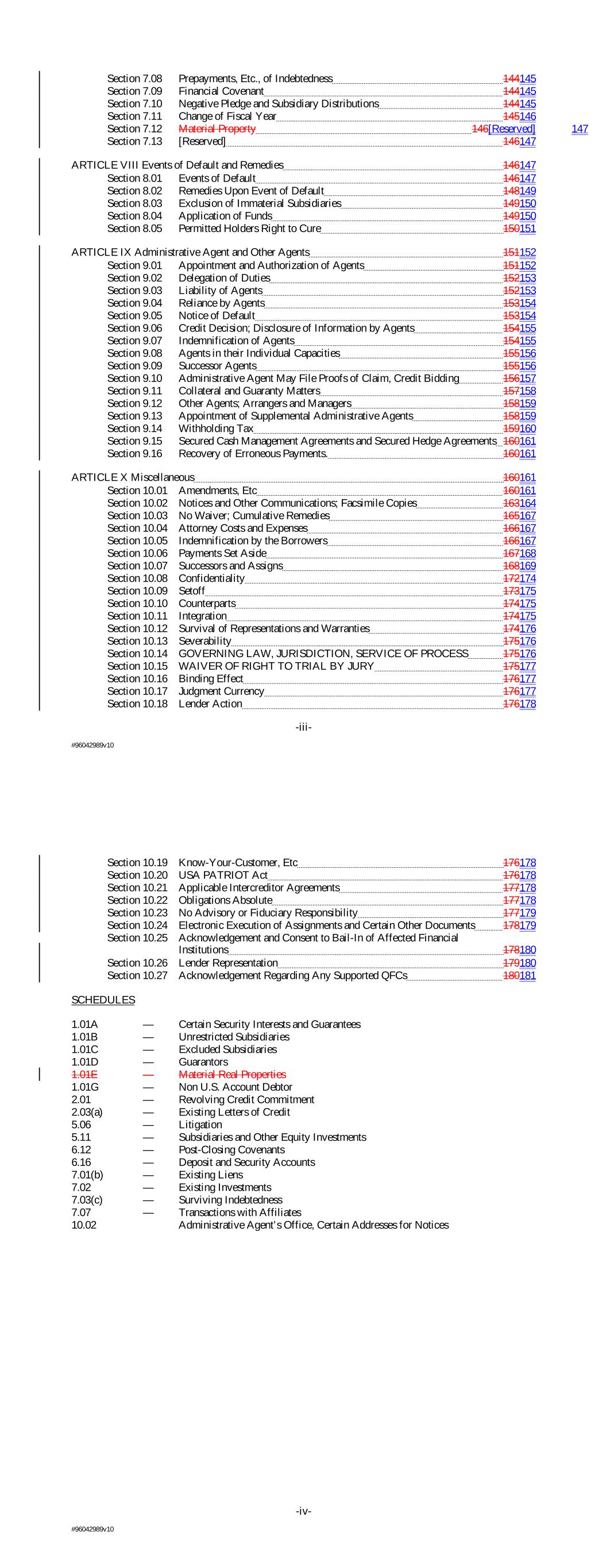 Section 7.08 Prepayments, Etc., of Indebtedness 144145 Section 7.09 Financial Covenant 144145 Section 7.10 Negative Pledge and Subsidiary Distributions 144145 Section 7.11 Change of Fiscal Year 145146 Section 7.12 Material Property 146[Reserved] 147 Section 7.13 [Reserved] 146147 ARTICLE VIII Events of Default and Remedies 146147 Section 8.01 Events of Default 146147 Section 8.02 Remedies Upon Event of Default 148149 Section 8.03 Exclusion of Immaterial Subsidiaries 149150 Section 8.04 Application of Funds 149150 Section 8.05 Permitted Holders Right to Cure 150151 ARTICLE IX Administrative Agent and Other Agents 151152 Section 9.01 Appointment and Authorization of Agents 151152 Section 9.02 Delegation of Duties 152153 Section 9.03 Liability of Agents 152153 Section 9.04 Reliance by Agents 153154 Section 9.05 Notice of Default 153154 Section 9.06 Credit Decision; Disclosure of Information by Agents 154155 Section 9.07 Indemnification of Agents 154155 Section 9.08 Agents in their Individual Capacities 155156 Section 9.09 Successor Agents 155156 Section 9.10 Administrative Agent May File Proofs of Claim, Credit Bidding 156157 Section 9.11 Collateral and Guaranty Matters 157158 Section 9.12 Other Agents; Arrangers and Managers 158159 Section 9.13 Appointment of Supplemental Administrative Agents 158159 Section 9.14 Withholding Tax 159160 Section 9.15 Secured Cash Management Agreements and Secured Hedge Agreements 160161 Section 9.16 Recovery of Erroneous Payments. 160161 ARTICLE X Miscellaneous 160161 Section 10.01 Amendments, Etc 160161 Section 10.02 Notices and Other Communications; Facsimile Copies 163164 Section 10.03 No Waiver; Cumulative Remedies 165167 Section 10.04 Attorney Costs and Expenses 166167 Section 10.05 Indemnification by the Borrowers 166167 Section 10.06 Payments Set Aside 167168 Section 10.07 Successors and Assigns 168169 Section 10.08 Confidentiality 172174 Section 10.09 Setoff 173175 Section 10.10 Counterparts 174175 Section 10.11 Integration 174175 Section 10.12 Survival of Representations and Warranties 174176 Section 10.13 Severability 175176 Section 10.14 GOVERNING LAW, JURISDICTION, SERVICE OF PROCESS 175176 Section 10.15 WAIVER OF RIGHT TO TRIAL BY JURY 175177 Section 10.16 Binding Effect 176177 Section 10.17 Judgment Currency 176177 Section 10.18 Lender Action 176178 -iii- #96042989v10 Section 10.19 Know-Your-Customer, Etc 176178 Section 10.20 USA PATRIOT Act 176178 Section 10.21 Applicable Intercreditor Agreements 177178 Section 10.22 Obligations Absolute 177178 Section 10.23 No Advisory or Fiduciary Responsibility 177179 Section 10.24 Electronic Execution of Assignments and Certain Other Documents 178179 Section 10.25 Acknowledgement and Consent to Bail-In of Affected Financial Institutions 178180 Section 10.26 Lender Representation 179180 Section 10.27 Acknowledgement Regarding Any Supported QFCs 180181 SCHEDULES 1.01A — Certain Security Interests and Guarantees 1.01B — Unrestricted Subsidiaries 1.01C — Excluded Subsidiaries 1.01D — Guarantors 1.01E — Material Real Properties 1.01G — Non U.S. Account Debtor 2.01 — Revolving Credit Commitment 2.03(a) — Existing Letters of Credit 5.06 — Litigation 5.11 — Subsidiaries and Other Equity Investments 6.12 — Post-Closing Covenants 6.16 — Deposit and Security Accounts 7.01(b) — Existing Liens 7.02 — Existing Investments 7.03(c) — Surviving Indebtedness 7.07 — Transactions with Affiliates 10.02 Administrative Agent’s Office, Certain Addresses for Notices -iv- #96042989v10