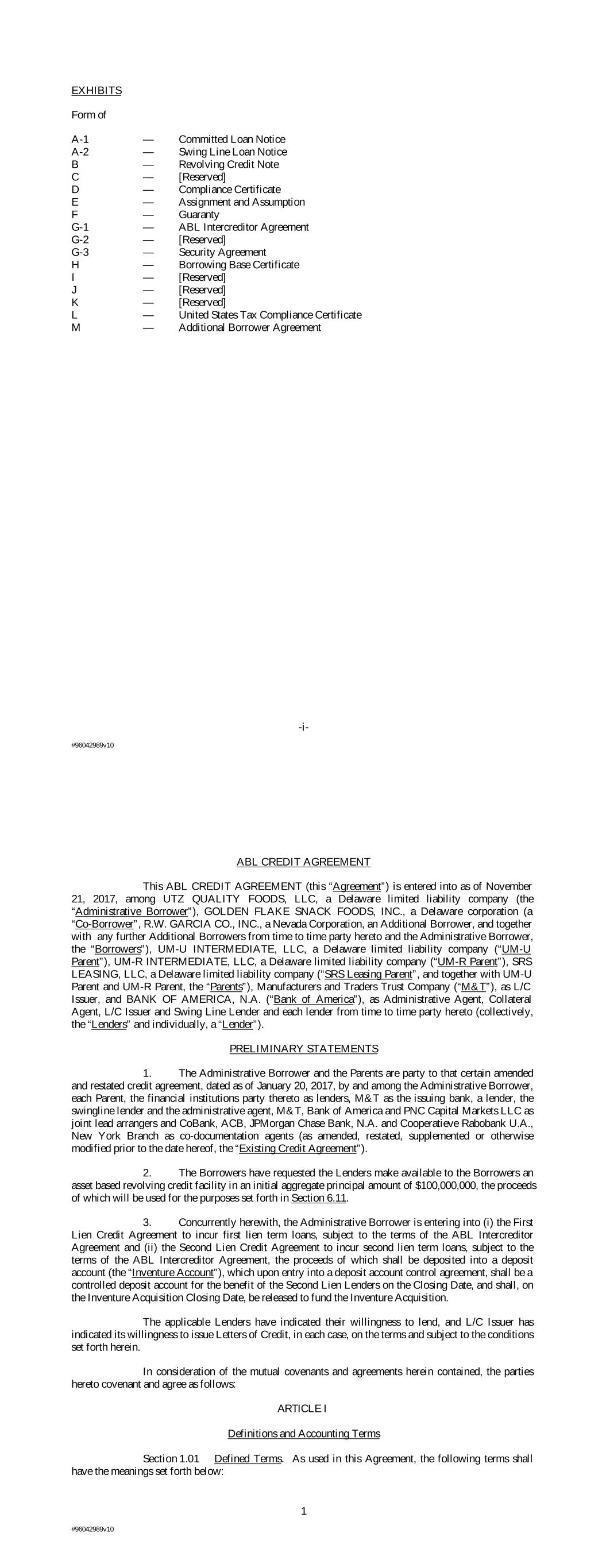 EXHIBITS Form of A-1 — Committed Loan Notice A-2 — Swing Line Loan Notice B — Revolving Credit Note C — [Reserved] D — Compliance Certificate E — Assignment and Assumption F — Guaranty G-1 — ABL Intercreditor Agreement G-2 — [Reserved] G-3 — Security Agreement H — Borrowing Base Certificate I — [Reserved] J — [Reserved] K — [Reserved] L — United States Tax Compliance Certificate M — Additional Borrower Agreement -i- #96042989v10 ABL CREDIT AGREEMENT This ABL CREDIT AGREEMENT (this “Agreement”) is entered into as of November 21, 2017, among UTZ QUALITY FOODS, LLC, a Delaware limited liability company (the “Administrative Borrower”), GOLDEN FLAKE SNACK FOODS, INC., a Delaware corporation (a “Co-Borrower”, R.W. GARCIA CO., INC., a Nevada Corporation, an Additional Borrower, and together with any further Additional Borrowers from time to time party hereto and the Administrative Borrower, the “Borrowers”), UM-U INTERMEDIATE, LLC, a Delaware limited liability company (“UM-U Parent”), UM-R INTERMEDIATE, LLC, a Delaware limited liability company (“UM-R Parent”), SRS LEASING, LLC, a Delaware limited liability company (“SRS Leasing Parent”, and together with UM-U Parent and UM-R Parent, the “Parents”), Manufacturers and Traders Trust Company (“M&T”), as L/C Issuer, and BANK OF AMERICA, N.A. (“Bank of America”), as Administrative Agent, Collateral Agent, L/C Issuer and Swing Line Lender and each lender from time to time party hereto (collectively, the “Lenders” and individually, a “Lender”). PRELIMINARY STATEMENTS 1. The Administrative Borrower and the Parents are party to that certain amended and restated credit agreement, dated as of January 20, 2017, by and among the Administrative Borrower, each Parent, the financial institutions party thereto as lenders, M&T as the issuing bank, a lender, the swingline lender and the administrative agent, M&T, Bank of America and PNC Capital Markets LLC as joint lead arrangers and CoBank, ACB, JPMorgan Chase Bank, N.A. and Cooperatieve Rabobank U.A., New York Branch as co-documentation agents (as amended, restated, supplemented or otherwise modified prior to the date hereof, the “Existing Credit Agreement”). 2. The Borrowers have requested the Lenders make available to the Borrowers an asset based revolving credit facility in an initial aggregate principal amount of $100,000,000, the proceeds of which will be used for the purposes set forth in Section 6.11. 3. Concurrently herewith, the Administrative Borrower is entering into (i) the First Lien Credit Agreement to incur first lien term loans, subject to the terms of the ABL Intercreditor Agreement and (ii) the Second Lien Credit Agreement to incur second lien term loans, subject to the terms of the ABL Intercreditor Agreement, the proceeds of which shall be deposited into a deposit account (the “Inventure Account”), which upon entry into a deposit account control agreement, shall be a controlled deposit account for the benefit of the Second Lien Lenders on the Closing Date, and shall, on the Inventure Acquisition Closing Date, be released to fund the Inventure Acquisition. The applicable Lenders have indicated their willingness to lend, and L/C Issuer has indicated its willingness to issue Letters of Credit, in each case, on the terms and subject to the conditions set forth herein. In consideration of the mutual covenants and agreements herein contained, the parties hereto covenant and agree as follows: ARTICLE I Definitions and Accounting Terms Section 1.01 Defined Terms. As used in this Agreement, the following terms shall have the meanings set forth below: 1 #96042989v10