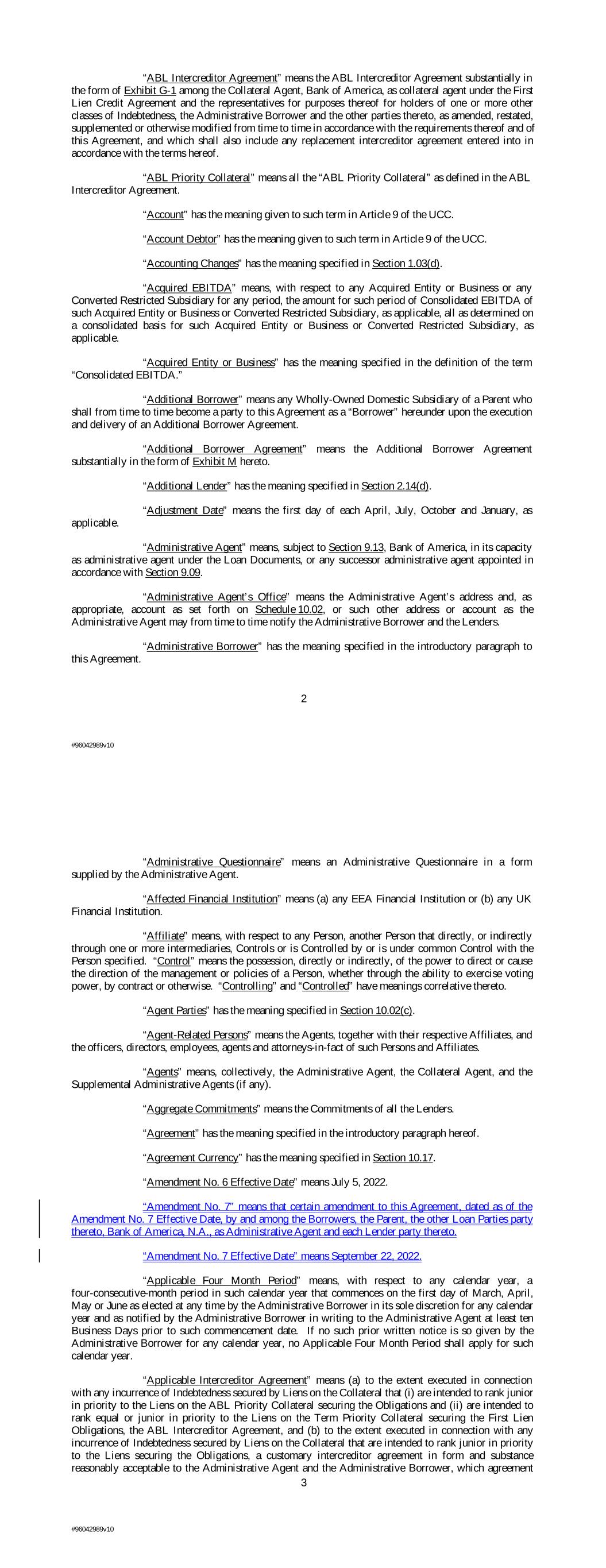 “ABL Intercreditor Agreement” means the ABL Intercreditor Agreement substantially in the form of Exhibit G-1 among the Collateral Agent, Bank of America, as collateral agent under the First Lien Credit Agreement and the representatives for purposes thereof for holders of one or more other classes of Indebtedness, the Administrative Borrower and the other parties thereto, as amended, restated, supplemented or otherwise modified from time to time in accordance with the requirements thereof and of this Agreement, and which shall also include any replacement intercreditor agreement entered into in accordance with the terms hereof. “ABL Priority Collateral” means all the “ABL Priority Collateral” as defined in the ABL Intercreditor Agreement. “Account” has the meaning given to such term in Article 9 of the UCC. “Account Debtor” has the meaning given to such term in Article 9 of the UCC. “Accounting Changes” has the meaning specified in Section 1.03(d). “Acquired EBITDA” means, with respect to any Acquired Entity or Business or any Converted Restricted Subsidiary for any period, the amount for such period of Consolidated EBITDA of such Acquired Entity or Business or Converted Restricted Subsidiary, as applicable, all as determined on a consolidated basis for such Acquired Entity or Business or Converted Restricted Subsidiary, as applicable. “Acquired Entity or Business” has the meaning specified in the definition of the term “Consolidated EBITDA.” “Additional Borrower” means any Wholly-Owned Domestic Subsidiary of a Parent who shall from time to time become a party to this Agreement as a “Borrower” hereunder upon the execution and delivery of an Additional Borrower Agreement. “Additional Borrower Agreement” means the Additional Borrower Agreement substantially in the form of Exhibit M hereto. “Additional Lender” has the meaning specified in Section 2.14(d). “Adjustment Date” means the first day of each April, July, October and January, as applicable. “Administrative Agent” means, subject to Section 9.13, Bank of America, in its capacity as administrative agent under the Loan Documents, or any successor administrative agent appointed in accordance with Section 9.09. “Administrative Agent’s Office” means the Administrative Agent’s address and, as appropriate, account as set forth on Schedule 10.02, or such other address or account as the Administrative Agent may from time to time notify the Administrative Borrower and the Lenders. “Administrative Borrower” has the meaning specified in the introductory paragraph to this Agreement. 2 #96042989v10 “Administrative Questionnaire” means an Administrative Questionnaire in a form supplied by the Administrative Agent. “Affected Financial Institution” means (a) any EEA Financial Institution or (b) any UK Financial Institution. “Affiliate” means, with respect to any Person, another Person that directly, or indirectly through one or more intermediaries, Controls or is Controlled by or is under common Control with the Person specified. “Control” means the possession, directly or indirectly, of the power to direct or cause the direction of the management or policies of a Person, whether through the ability to exercise voting power, by contract or otherwise. “Controlling” and “Controlled” have meanings correlative thereto. “Agent Parties” has the meaning specified in Section 10.02(c). “Agent-Related Persons” means the Agents, together with their respective Affiliates, and the officers, directors, employees, agents and attorneys-in-fact of such Persons and Affiliates. “Agents” means, collectively, the Administrative Agent, the Collateral Agent, and the Supplemental Administrative Agents (if any). “Aggregate Commitments” means the Commitments of all the Lenders. “Agreement” has the meaning specified in the introductory paragraph hereof. “Agreement Currency” has the meaning specified in Section 10.17. “Amendment No. 6 Effective Date” means July 5, 2022. “Amendment No. 7” means that certain amendment to this Agreement, dated as of the Amendment No. 7 Effective Date, by and among the Borrowers, the Parent, the other Loan Parties party thereto, Bank of America, N.A., as Administrative Agent and each Lender party thereto. “Amendment No. 7 Effective Date” means September 22, 2022. “Applicable Four Month Period” means, with respect to any calendar year, a four-consecutive-month period in such calendar year that commences on the first day of March, April, May or June as elected at any time by the Administrative Borrower in its sole discretion for any calendar year and as notified by the Administrative Borrower in writing to the Administrative Agent at least ten Business Days prior to such commencement date. If no such prior written notice is so given by the Administrative Borrower for any calendar year, no Applicable Four Month Period shall apply for such calendar year. “Applicable Intercreditor Agreement” means (a) to the extent executed in connection with any incurrence of Indebtedness secured by Liens on the Collateral that (i) are intended to rank junior in priority to the Liens on the ABL Priority Collateral securing the Obligations and (ii) are intended to rank equal or junior in priority to the Liens on the Term Priority Collateral securing the First Lien Obligations, the ABL Intercreditor Agreement, and (b) to the extent executed in connection with any incurrence of Indebtedness secured by Liens on the Collateral that are intended to rank junior in priority to the Liens securing the Obligations, a customary intercreditor agreement in form and substance reasonably acceptable to the Administrative Agent and the Administrative Borrower, which agreement 3 #96042989v10