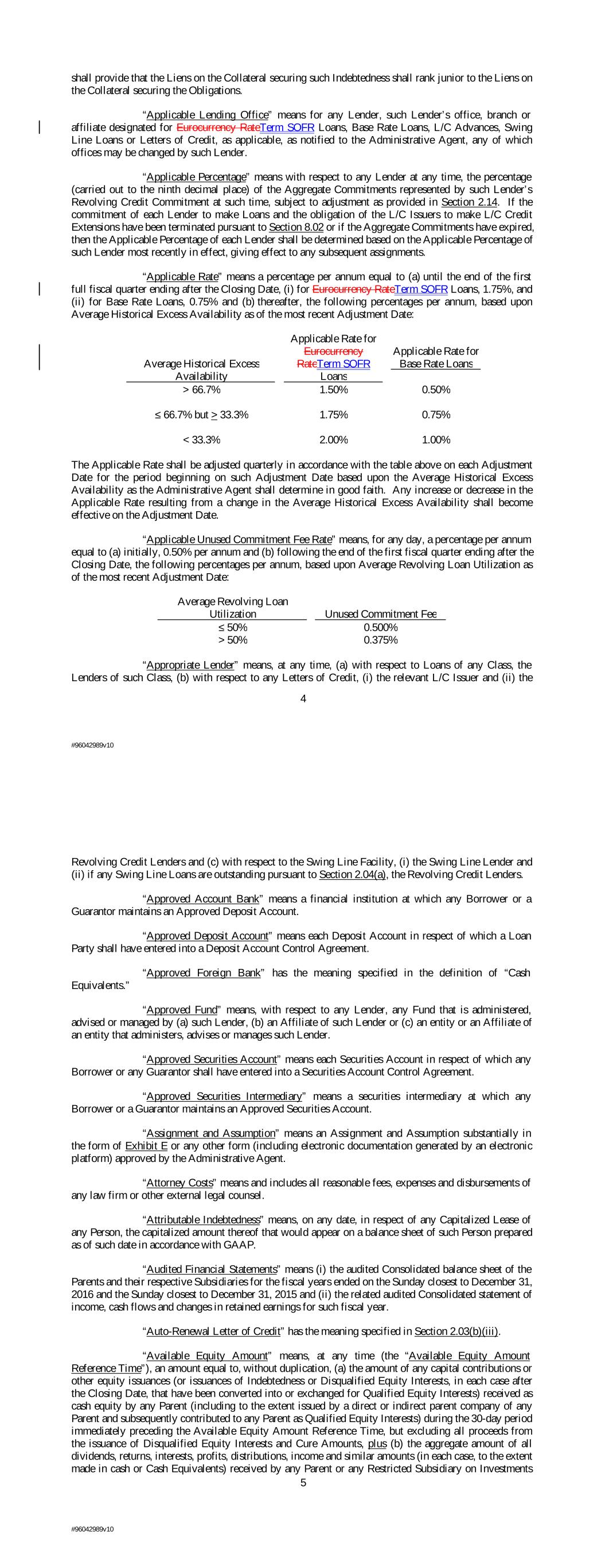 4 #96042989v10 < 33.3% ˃ 66.7% 2.00% Average Historical Excess Availability 1.00% 1.50% The Applicable Rate shall be adjusted quarterly in accordance with the table above on each Adjustment Date for the period beginning on such Adjustment Date based upon the Average Historical Excess Availability as the Administrative Agent shall determine in good faith. Any increase or decrease in the Applicable Rate resulting from a change in the Average Historical Excess Availability shall become effective on the Adjustment Date. “Applicable Unused Commitment Fee Rate” means, for any day, a percentage per annum equal to (a) initially, 0.50% per annum and (b) following the end of the first fiscal quarter ending after the Closing Date, the following percentages per annum, based upon Average Revolving Loan Utilization as of the most recent Adjustment Date: Average Revolving Loan Utilization 0.50% Unused Commitment Fee Applicable Rate for Eurocurrency RateTerm SOFR Loans ≤ 50% shall provide that the Liens on the Collateral securing such Indebtedness shall rank junior to the Liens on the Collateral securing the Obligations. “Applicable Lending Office” means for any Lender, such Lender’s office, branch or affiliate designated for Eurocurrency RateTerm SOFR Loans, Base Rate Loans, L/C Advances, Swing Line Loans or Letters of Credit, as applicable, as notified to the Administrative Agent, any of which offices may be changed by such Lender. “Applicable Percentage” means with respect to any Lender at any time, the percentage (carried out to the ninth decimal place) of the Aggregate Commitments represented by such Lender’s Revolving Credit Commitment at such time, subject to adjustment as provided in Section 2.14. If the commitment of each Lender to make Loans and the obligation of the L/C Issuers to make L/C Credit Extensions have been terminated pursuant to Section 8.02 or if the Aggregate Commitments have expired, then the Applicable Percentage of each Lender shall be determined based on the Applicable Percentage of such Lender most recently in effect, giving effect to any subsequent assignments. “Applicable Rate” means a percentage per annum equal to (a) until the end of the first full fiscal quarter ending after the Closing Date, (i) for Eurocurrency RateTerm SOFR Loans, 1.75%, and (ii) for Base Rate Loans, 0.75% and (b) thereafter, the following percentages per annum, based upon Average Historical Excess Availability as of the most recent Adjustment Date: 0.500% ≤ 66.7% but > 33.3% Applicable Rate for Base Rate Loans > 50% 1.75% 0.375% “Appropriate Lender” means, at any time, (a) with respect to Loans of any Class, the Lenders of such Class, (b) with respect to any Letters of Credit, (i) the relevant L/C Issuer and (ii) the 0.75% Revolving Credit Lenders and (c) with respect to the Swing Line Facility, (i) the Swing Line Lender and (ii) if any Swing Line Loans are outstanding pursuant to Section 2.04(a), the Revolving Credit Lenders. “Approved Account Bank” means a financial institution at which any Borrower or a Guarantor maintains an Approved Deposit Account. “Approved Deposit Account” means each Deposit Account in respect of which a Loan Party shall have entered into a Deposit Account Control Agreement. “Approved Foreign Bank” has the meaning specified in the definition of “Cash Equivalents.” “Approved Fund” means, with respect to any Lender, any Fund that is administered, advised or managed by (a) such Lender, (b) an Affiliate of such Lender or (c) an entity or an Affiliate of an entity that administers, advises or manages such Lender. “Approved Securities Account” means each Securities Account in respect of which any Borrower or any Guarantor shall have entered into a Securities Account Control Agreement. “Approved Securities Intermediary” means a securities intermediary at which any Borrower or a Guarantor maintains an Approved Securities Account. “Assignment and Assumption” means an Assignment and Assumption substantially in the form of Exhibit E or any other form (including electronic documentation generated by an electronic platform) approved by the Administrative Agent. “Attorney Costs” means and includes all reasonable fees, expenses and disbursements of any law firm or other external legal counsel. “Attributable Indebtedness” means, on any date, in respect of any Capitalized Lease of any Person, the capitalized amount thereof that would appear on a balance sheet of such Person prepared as of such date in accordance with GAAP. “Audited Financial Statements” means (i) the audited Consolidated balance sheet of the Parents and their respective Subsidiaries for the fiscal years ended on the Sunday closest to December 31, 2016 and the Sunday closest to December 31, 2015 and (ii) the related audited Consolidated statement of income, cash flows and changes in retained earnings for such fiscal year. “Auto-Renewal Letter of Credit” has the meaning specified in Section 2.03(b)(iii). “Available Equity Amount” means, at any time (the “Available Equity Amount Reference Time”), an amount equal to, without duplication, (a) the amount of any capital contributions or other equity issuances (or issuances of Indebtedness or Disqualified Equity Interests, in each case after the Closing Date, that have been converted into or exchanged for Qualified Equity Interests) received as cash equity by any Parent (including to the extent issued by a direct or indirect parent company of any Parent and subsequently contributed to any Parent as Qualified Equity Interests) during the 30-day period immediately preceding the Available Equity Amount Reference Time, but excluding all proceeds from the issuance of Disqualified Equity Interests and Cure Amounts, plus (b) the aggregate amount of all dividends, returns, interests, profits, distributions, income and similar amounts (in each case, to the extent made in cash or Cash Equivalents) received by
